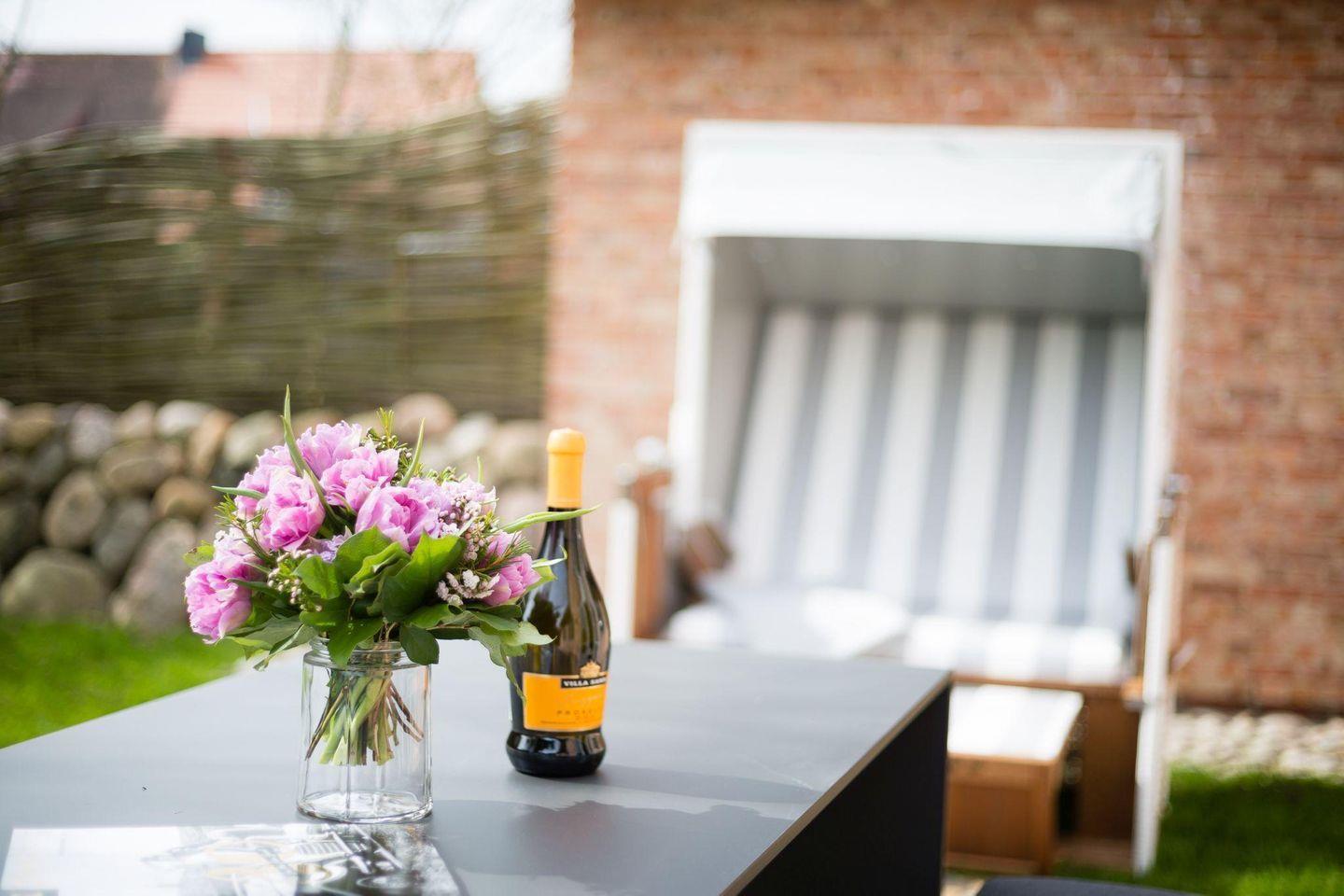 Das großzügige Wohnzimmer besticht durch nordisches Design und hochwertigen Komfort. Ein gemütlicher Kamin sorgt für wohlige Wärme an kühleren Abenden, während die großen Fensterfronten viel Licht hereinlassen und Ihnen direkten Zugang zum weitläufigen Garten und zu den beiden Terrassen bieten. Hier können Sie sich nach einem Tag am Strand entspannen, die Sonne genießen oder den Abend bei einem Glas Wein ausklingen lassen.