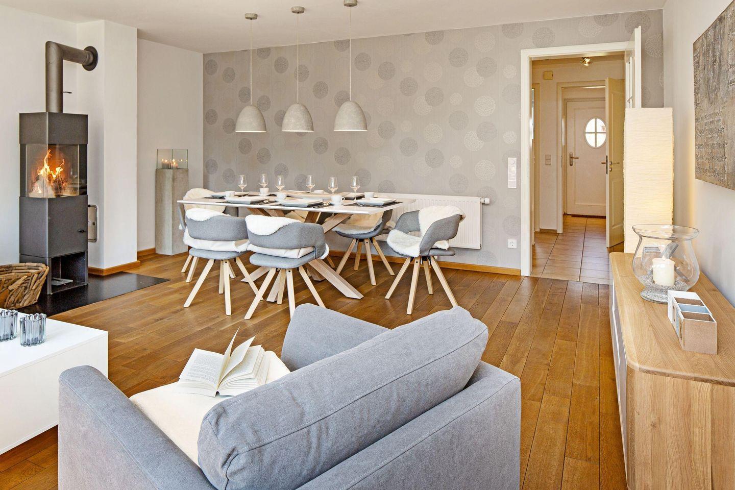 Das modern ausgestattete Ferienreihenhaus ist im Wohnbereich mit Eichenparkett und einem Kaminofen ausgestattet. Im 1. Stock befinden sich die drei Schlafzimmer zwei mit Doppelbett und eins mit großer Schlafcouch sowie ein Bad. Im EG bietet das Haus ein zweites Bad.