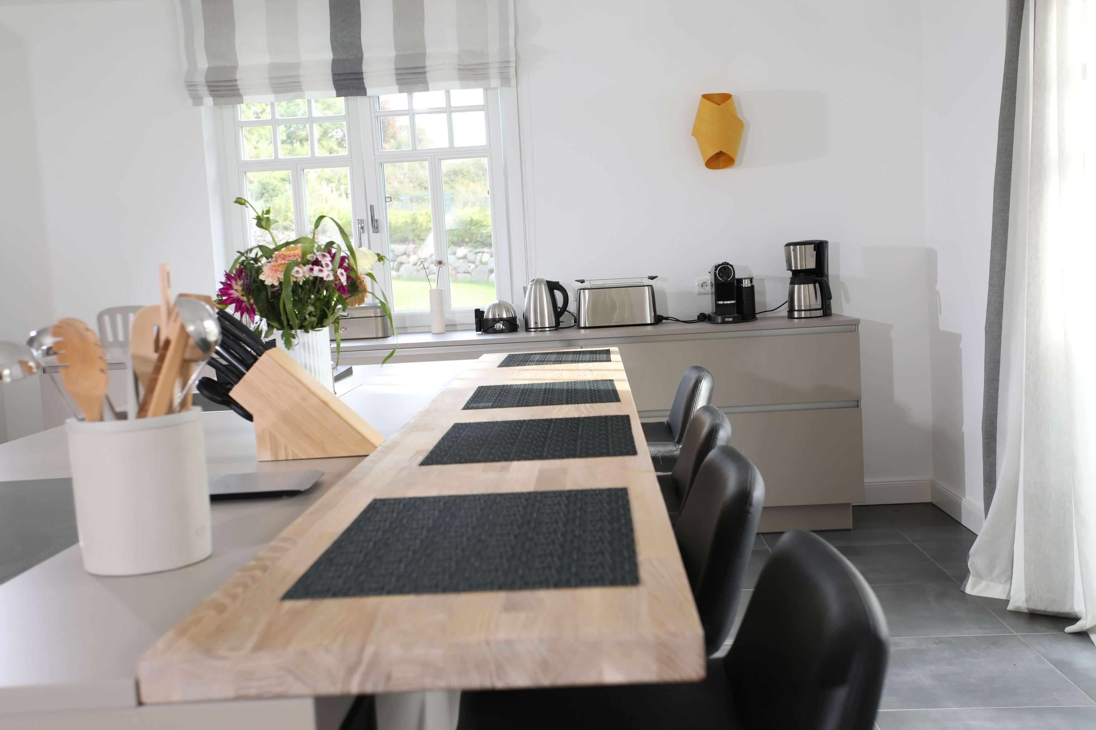 Für Romantik und behagliche Stunden nicht nur in der kühleren Jahreszeit sorgt der Panorama Kamin, sichtbar aus Küche, Ess- und Wohnbereich. Eleganz pur strahlt auch die große integrierte Küchenzeile mit freistehenden Kochinsel aus. Ausgestattet mit einem Backofen, einer Mikrowelle, einem Geschirrspüler, einem großen Kühlschrank mit Gefrierfach, einer Nespresso-Maschine, Kaffeemaschine, Toaster, Wasserkocher und diversen Kleininventar lässt sie das Herz jeden Hobbykochs sicher höher schlagen.