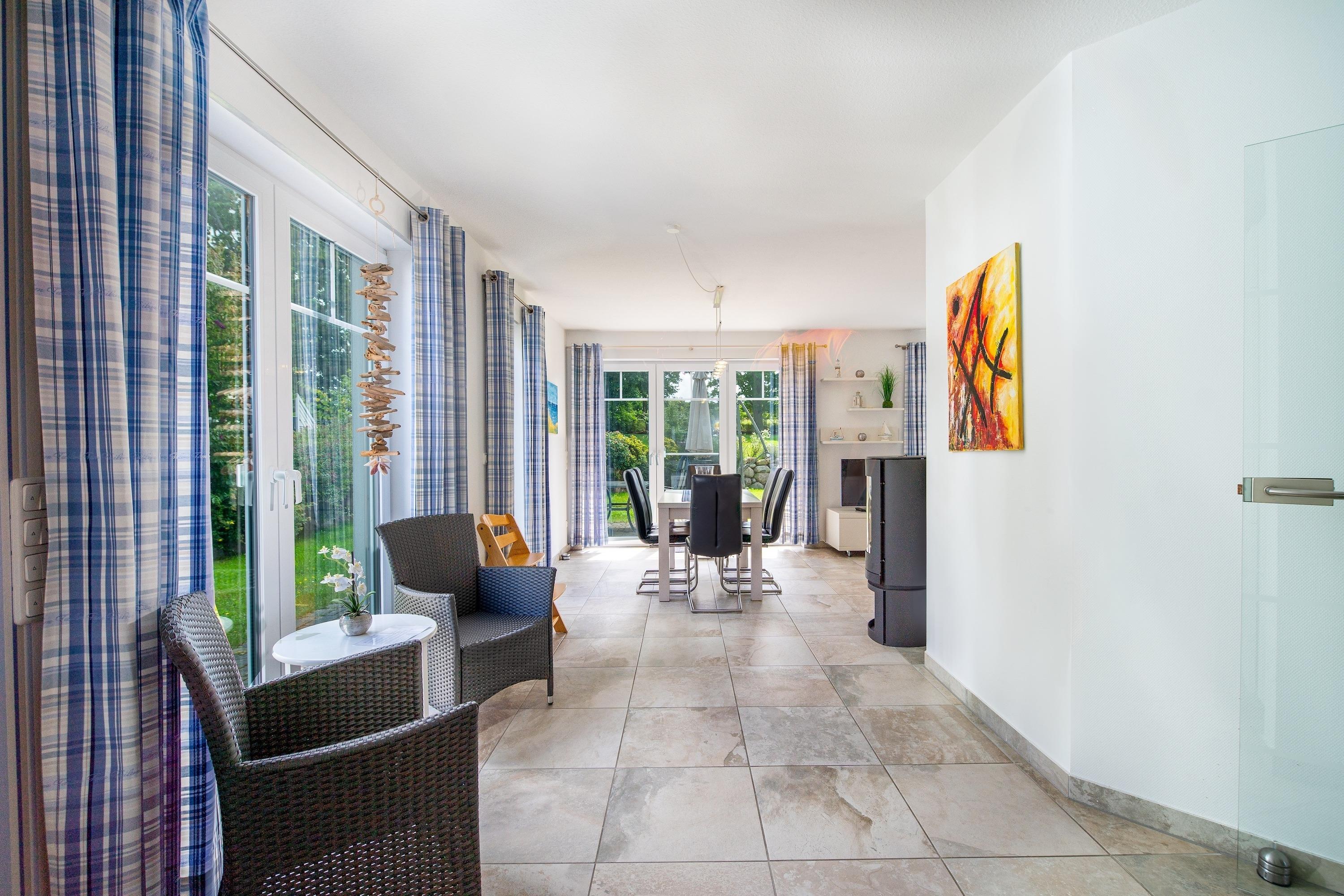 Das Haus erstreckt sich über zwei Etagen und empfängt Sie mit einem großzügigen, hellen Eingangsbereich, Garderobe, Abstellraum und Gäste-WC. Über eine Glastür gelangen Sie in den offenen Wohn- und Kochbereich. Die große, U-förmige Küche ist voll ausgestattet – vom Cerankochfeld über Geschirrspüler bis zur Kaffeemaschine – und lädt zum gemeinsamen Kochen ein.