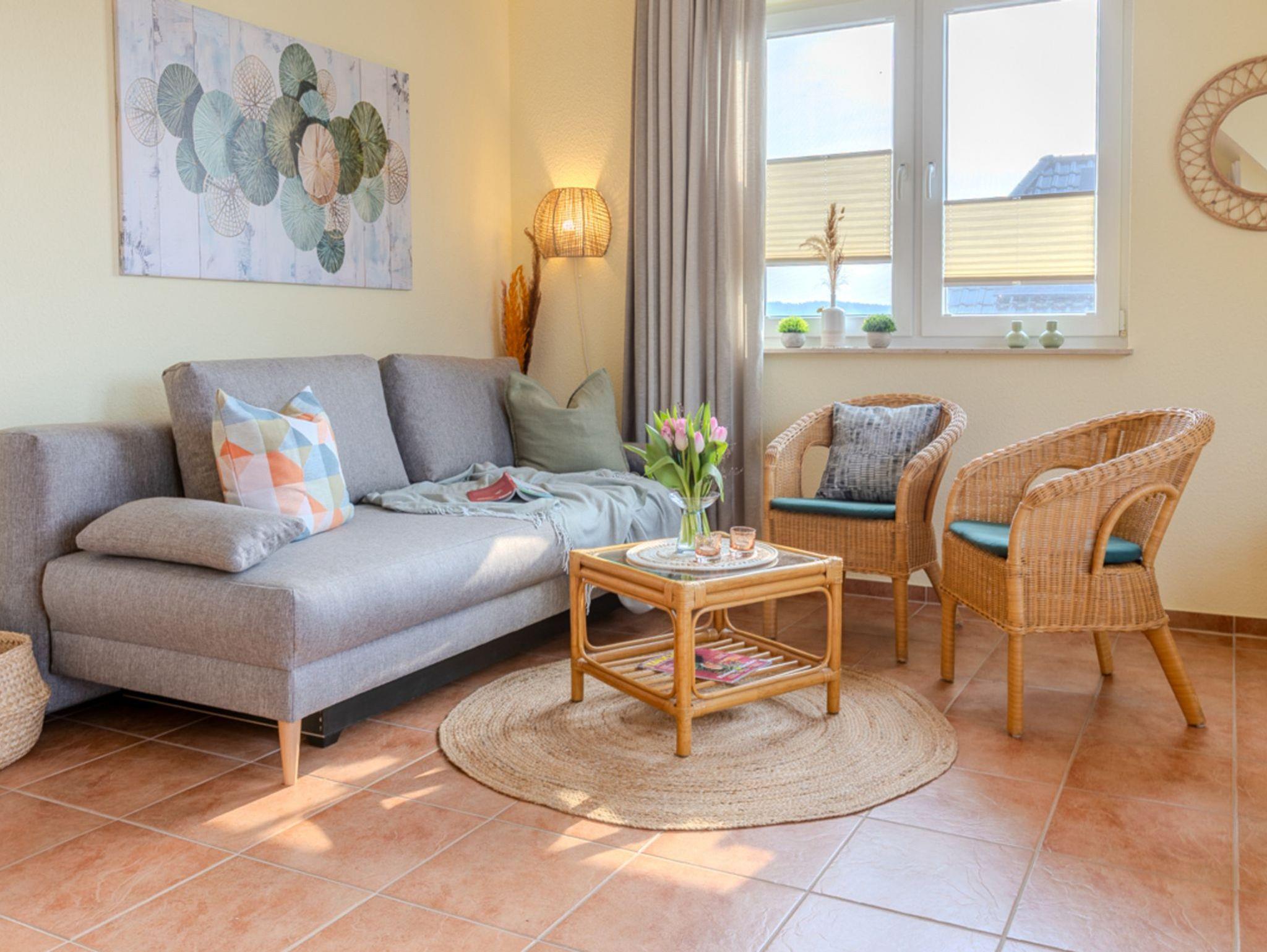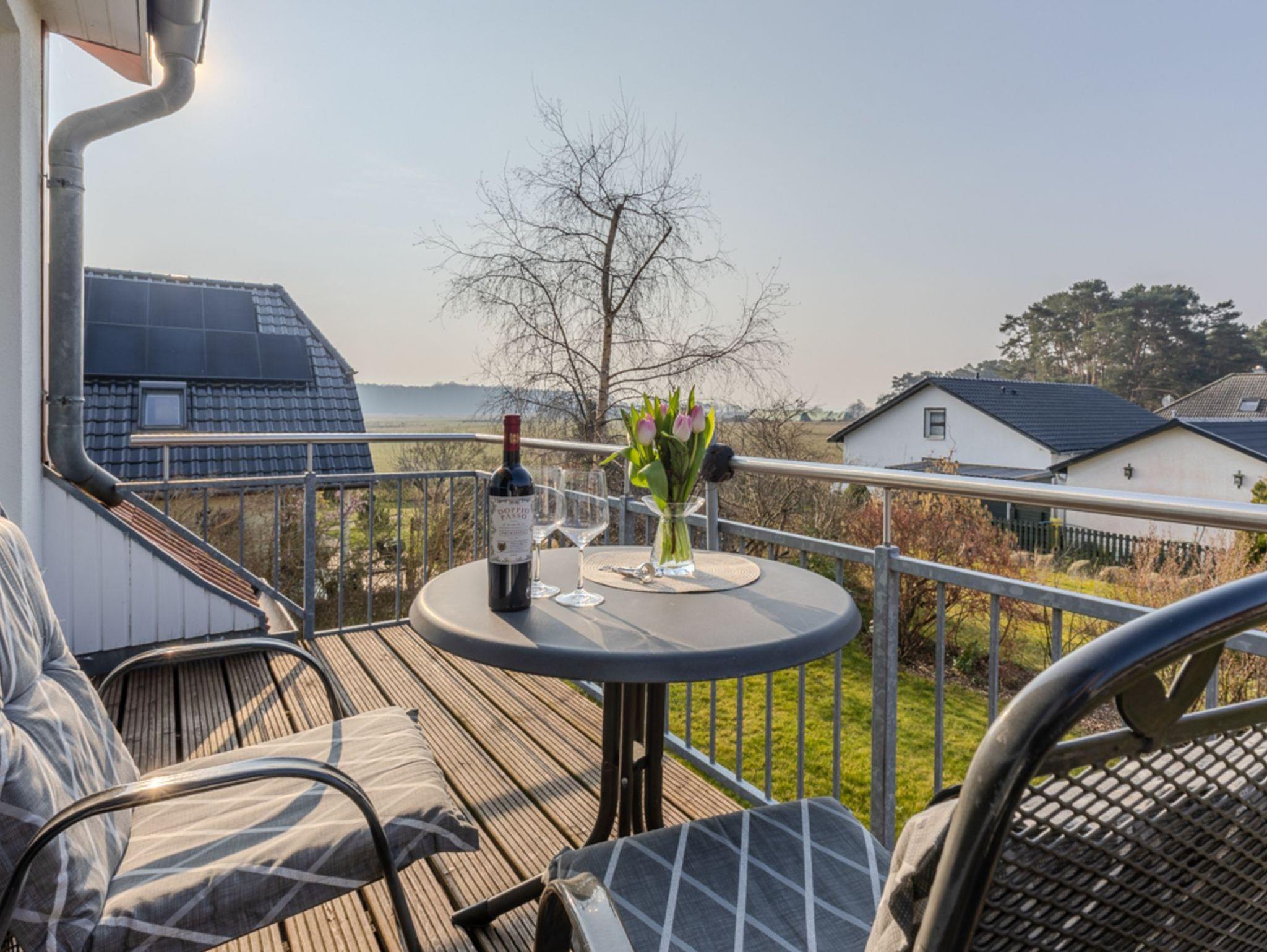 Die Dachgeschoss-Wohnung „Margarete“ ist großzügig geschnitten, ausgesprochen hell und freundlich gestaltet. Vor dem nach Süd-Westen ausgerichteten Wohnzimmer befindet sich ein geräumiger Balkon. Von diesem können Sie nicht nur zum Sonnenuntergang tief durchatmen und einen traumhaften Blick über die angrenzenden Wiesen auf das Achterwasser genießen.