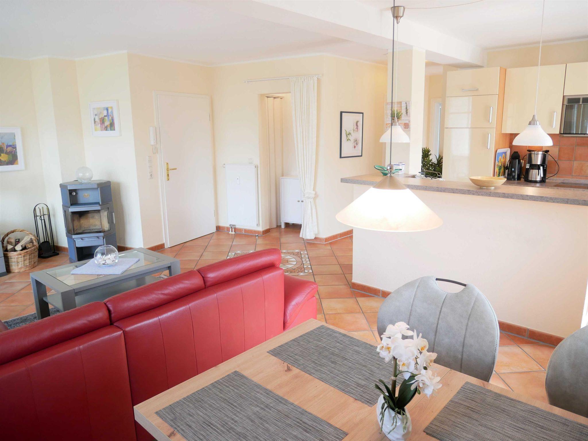 Die Wohnung verfügt über einen großzügigen Wohn- Essbereich mit offener, voll ausgestatteter Einbauküche welche über eine Kücheninsel, Kühlschrank mit Gefriermöglichkeit, Geschirrspülmaschine, Mikrowelle, Cerankochfeld, Backofen sowie Kaffeemaschine, Wasserkocher und Toaster verfügt. Der schöne Wohnbereich erwartet Sie mit einem Kamin, welcher gerade in der kalten Jashreszeit, für gemütliche Stunden sorgt sowie einer bequemen Couchecke, FLAT-TV und einem Esstisch.