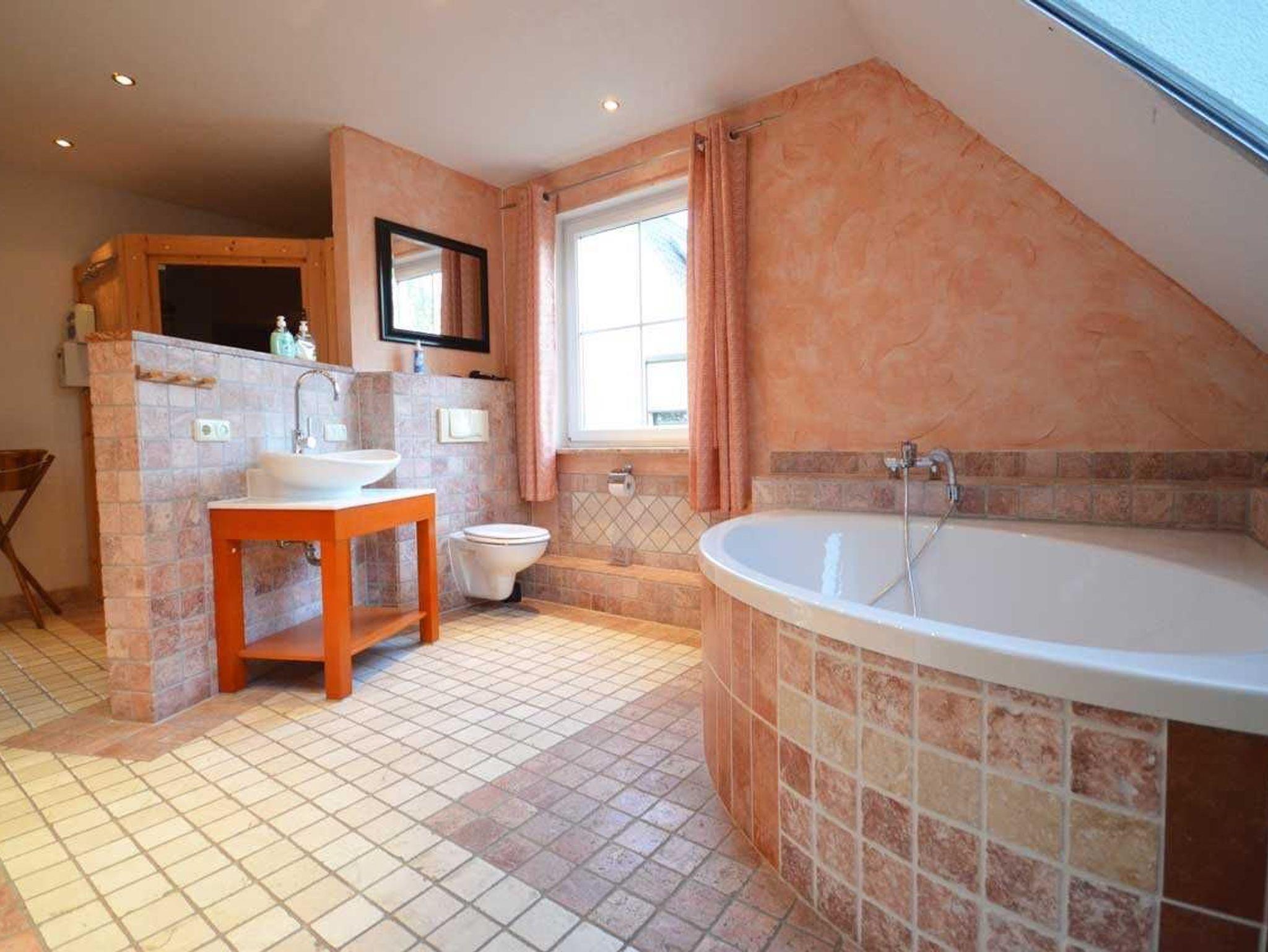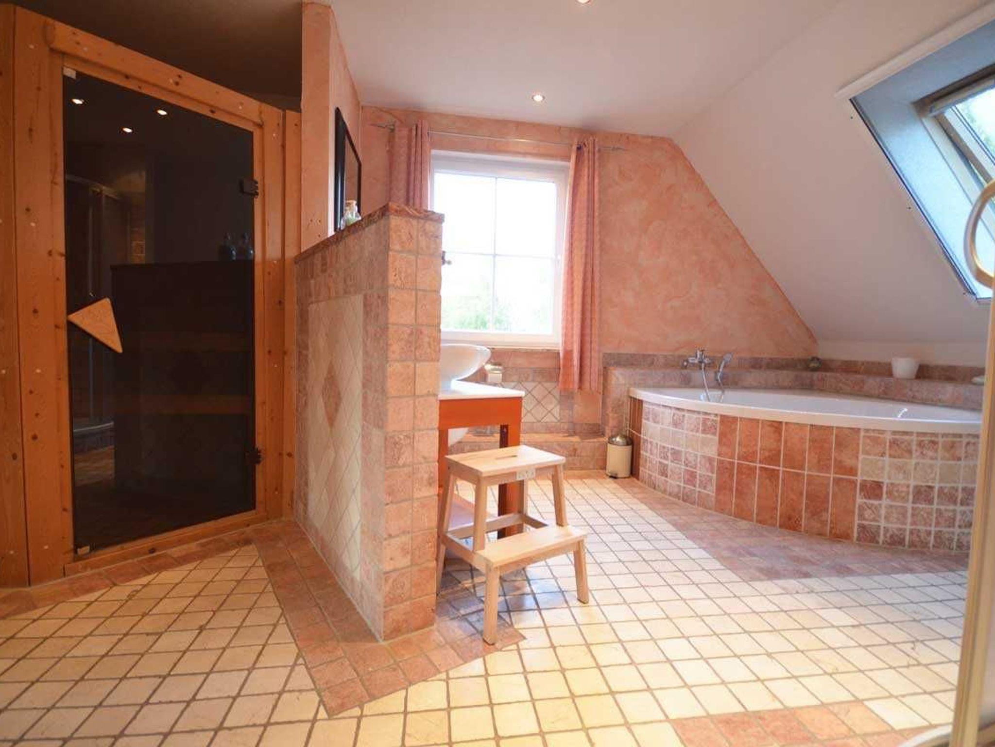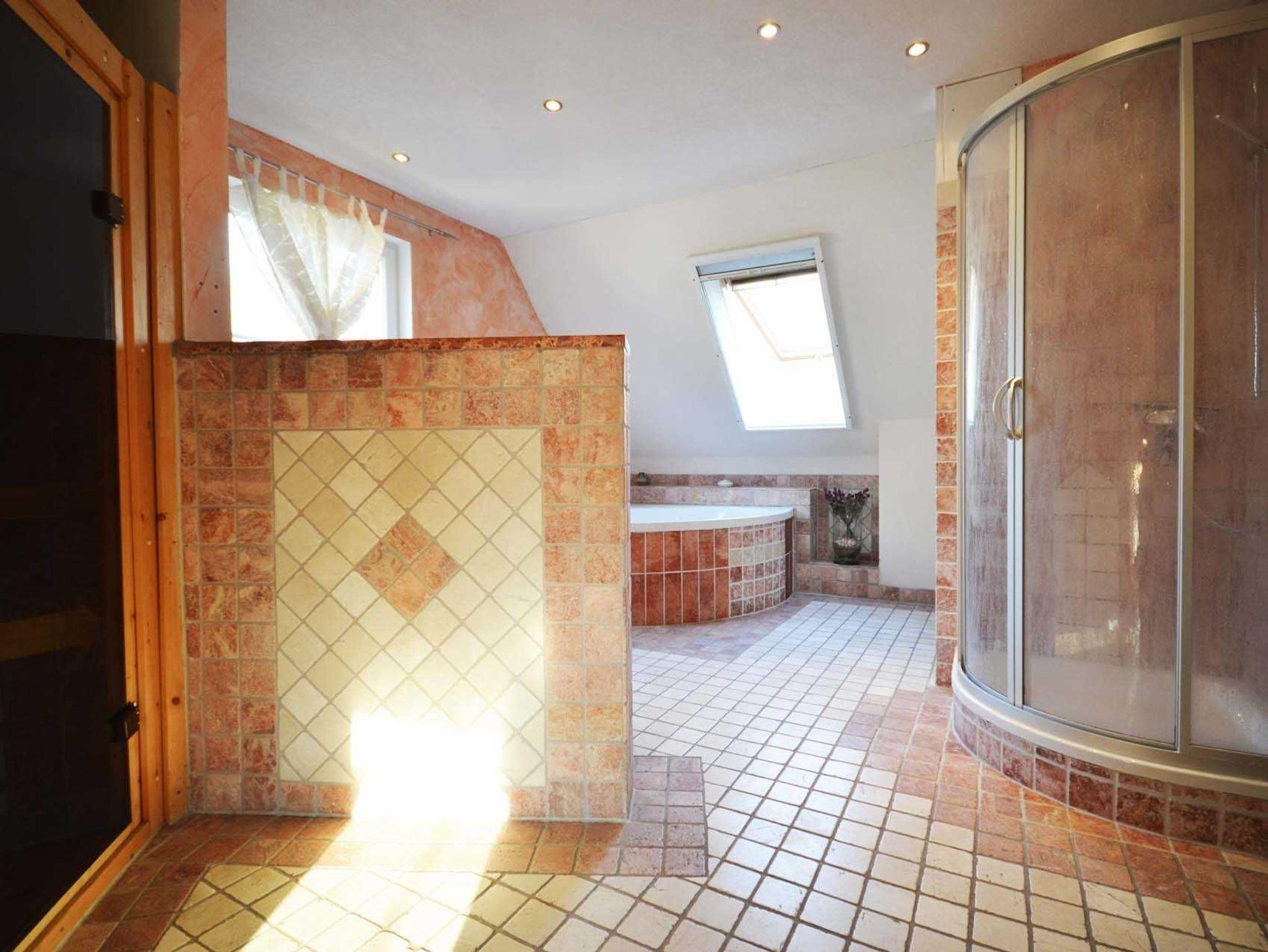 • Eigene Sauna im großen Bad mit Fußbodenheizung und Handtuchheizkörper, große Runddusche, große Eckbadewanne, Waschbecken, Toilette, Sauna (Münzeinwurf ca. 1 € pro 20 Minuten).