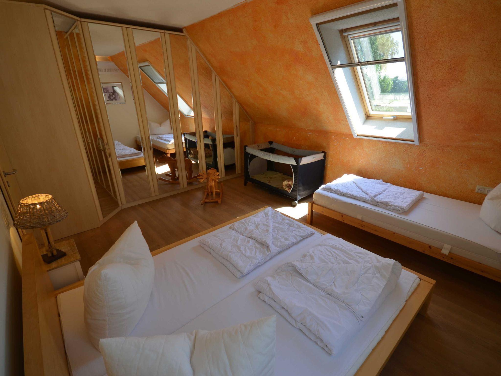 • Schlafzimmer 1 ist mit einem Doppelbett mit einer Größe von 160 x 200 cm, wie auch ein Einzelbett mit 90 x 200 cm, in dem auch ein bereits vorhandenes Babybett Platz findet. Großer Spiegelkleiderschrank.