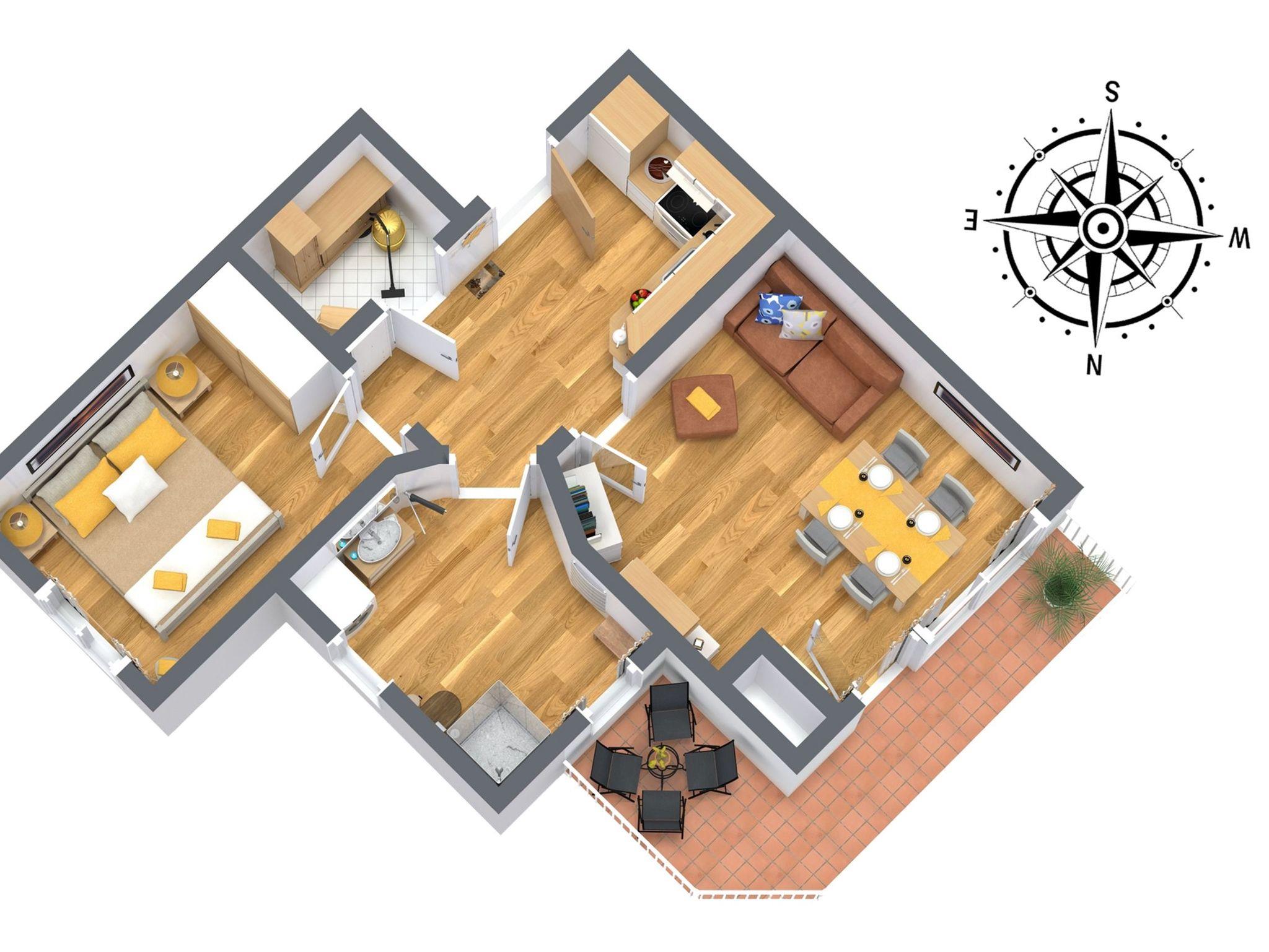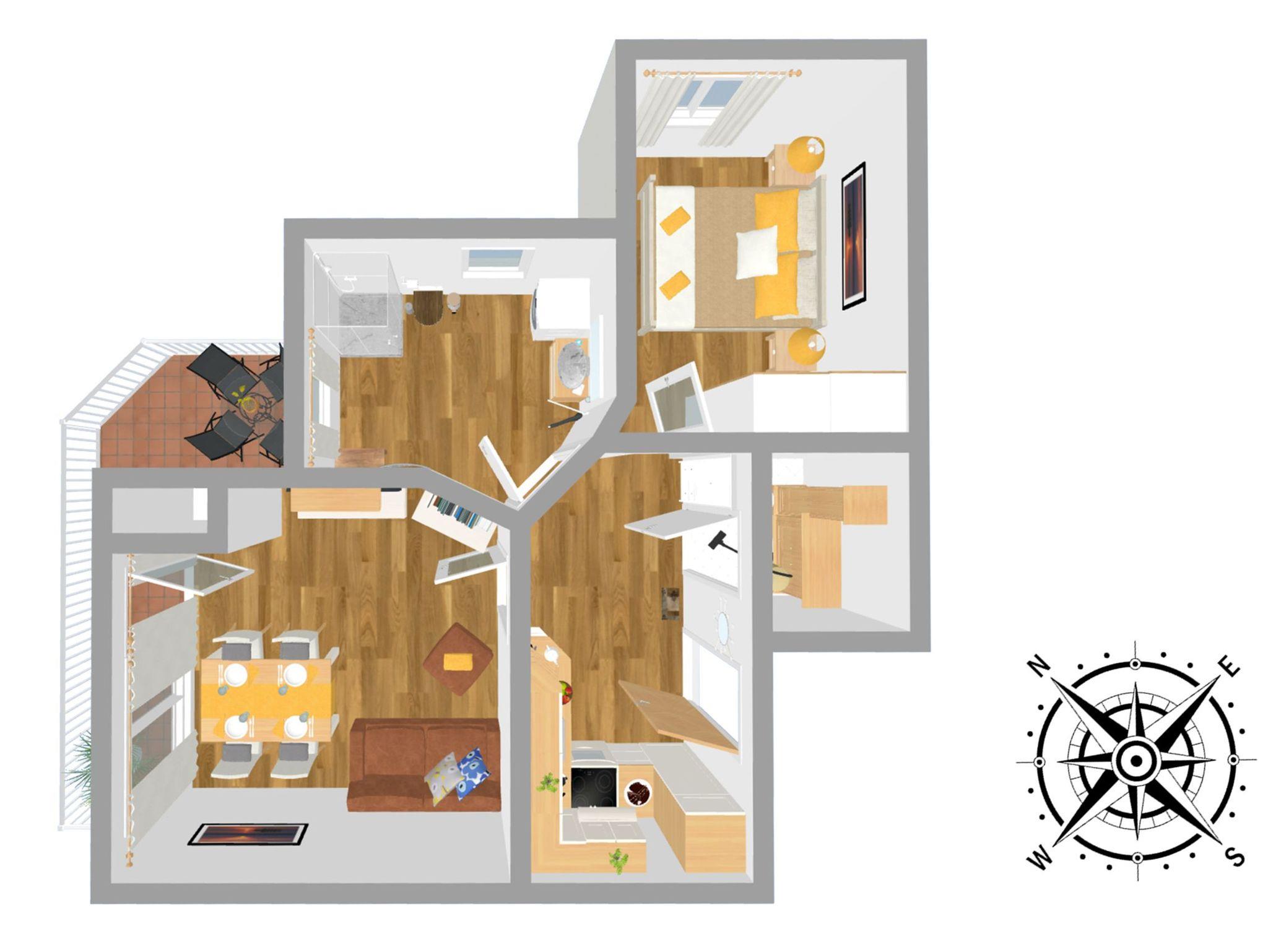 Die moderne 2- Raum Ferienwohnung befindet sich im 1. Obergeschoß der Villa Maria-Gabriele. Die Wohnung wurde im Jahr 2022 komplett modernisiert und mit viel Liebe zum Detail eingerichtet. Auf 44 qm erwartet sie ein gemütliches Wohnzimmer mit einer ausziehbaren Schlafcouch (Aufbettung für 3.+4. Pers. 1,80 x 2,00m), Smart- TV sowie einem Esstisch. Vom Wohnzimmer aus gelangen Sie auch auf den möblierten Balkon in Nord- West Lage. Die voll ausgestattete Küche ist mit Spülmaschine, Backofen, Ceran- Kochfeld, Mikrowelle, Kühlschrank mit Gefriermöglichkeit, Wasserkocher, Toaster und Kaffeemaschine ausgestattet und lässt keine Wünsche offen. Das Schlafzimmer verfügt über ein Doppelbett (1,80 m x 2,00 m), Smart-TV und einem Kleiderschrank. Das maritime Badezimmer ist mit Dusche, WC, Föhn und Waschmaschine ausgestattet. Ein Kinderbett, Kinderhochstuhl sowie Kindergeschirr stehen Ihnen kostenfrei zur Verfügung.