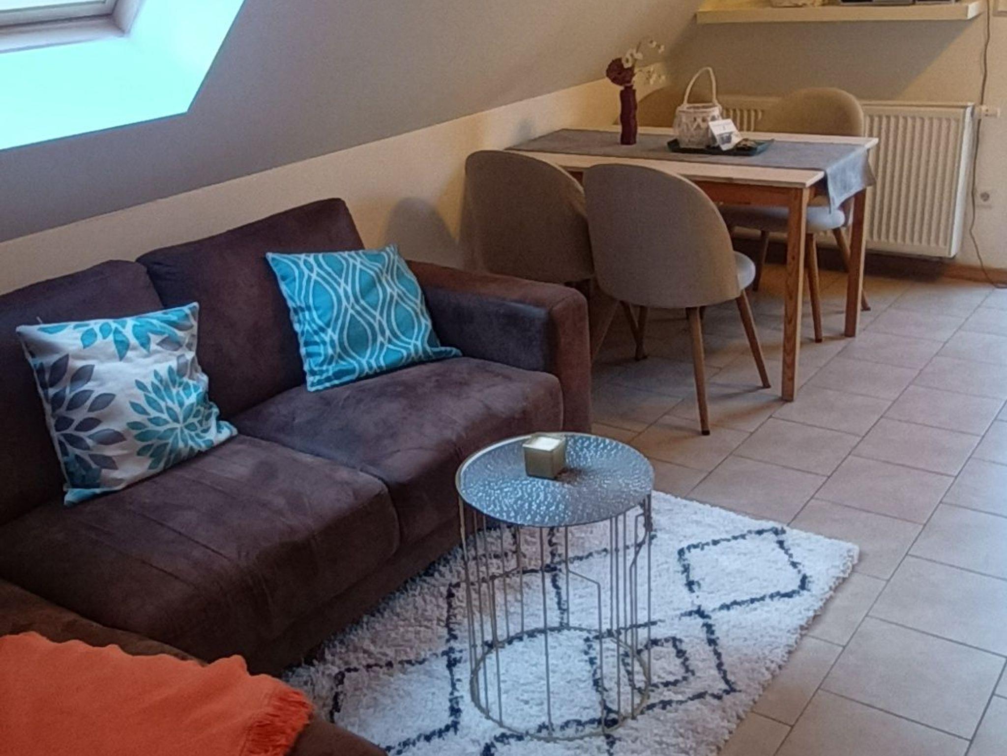 Die gemütliche Wohnung besteht aus einem Wohnzimmer mit integrierter Küche und zwei separaten Schlafzimmern. Das eine Schlafzimmer mit Doppelbett dient als Durchgangszimmer für das kleinere Schlafzimmer mit einem Tandembett.