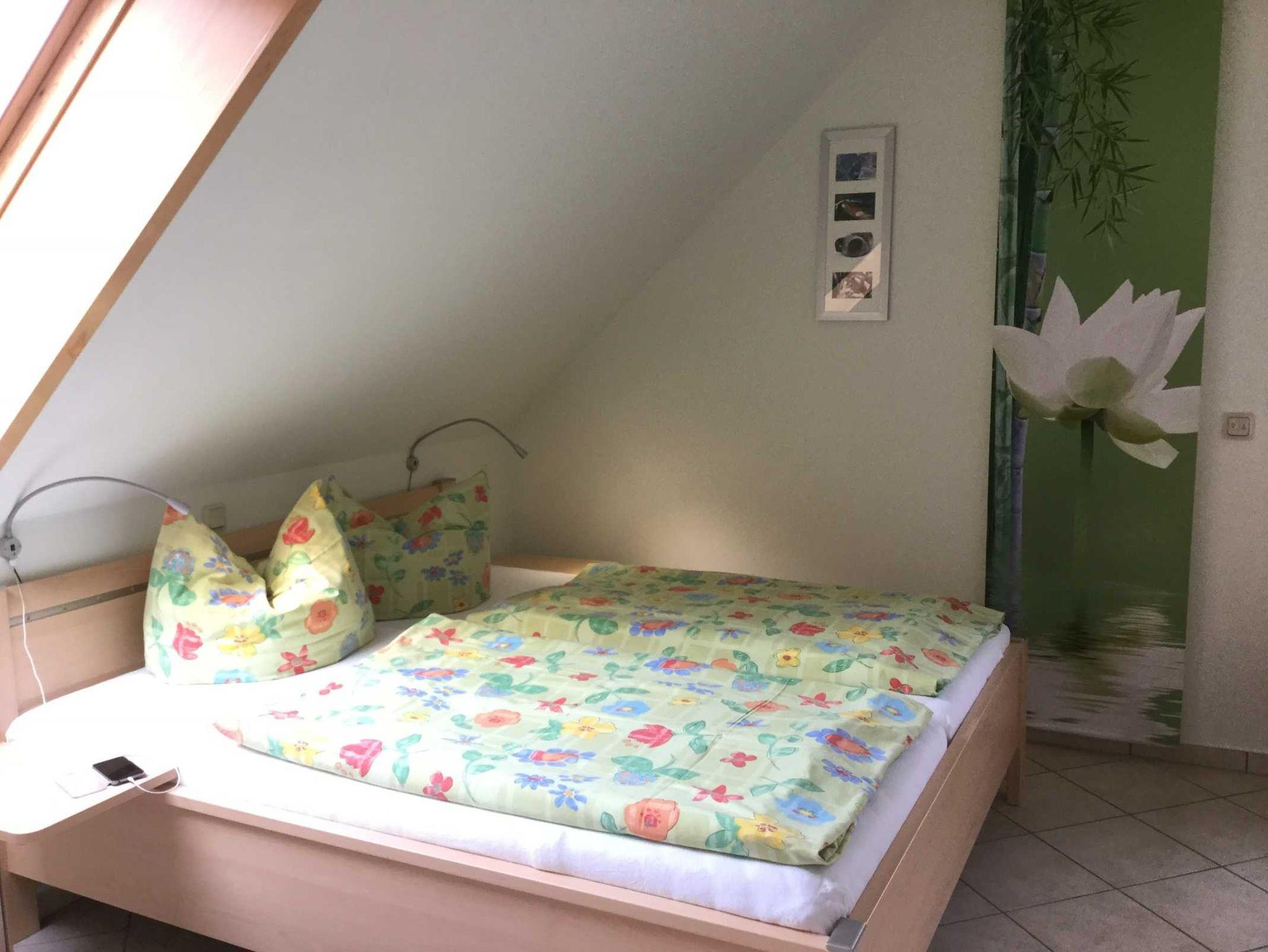 Die 2-Raum-Ferienwohnung (ca. 44 qm) befindet sich im Dachgeschoss. Sie hat ein separates Schlafzimmer, einen offenen Wohn- und Küchenbereich und Dusche/WC. Zur Ausstattung gehören LED-Flachbildschirm mit Radio und kostenfreiem WLAN. Im Schlafzimmer steht ein Doppelbett und ein Babybett kann hinzugestellt werden. Im Wohnbereich ist eine Aufbettung (Doppelbettcouch) für 2 Personen möglich.