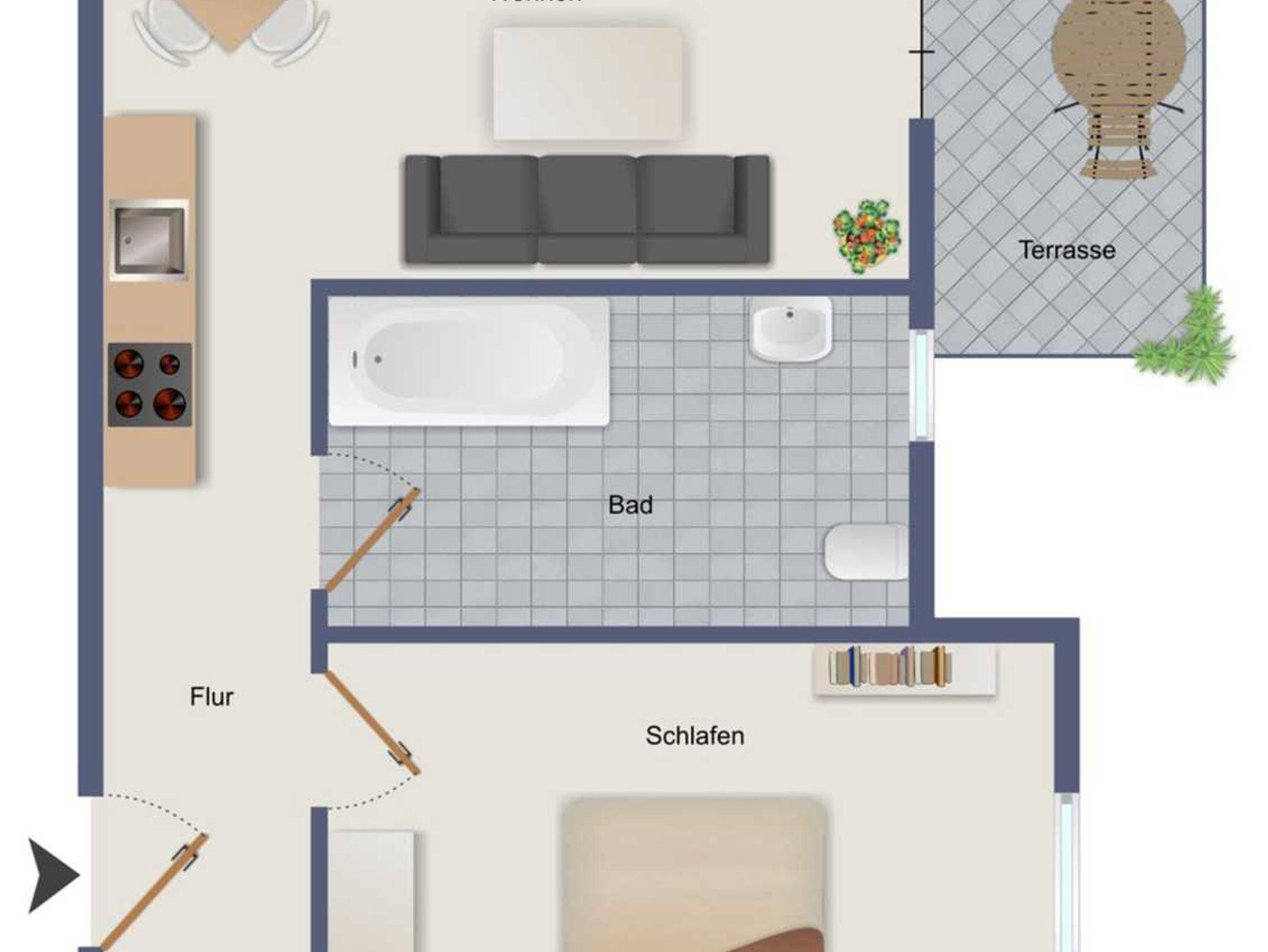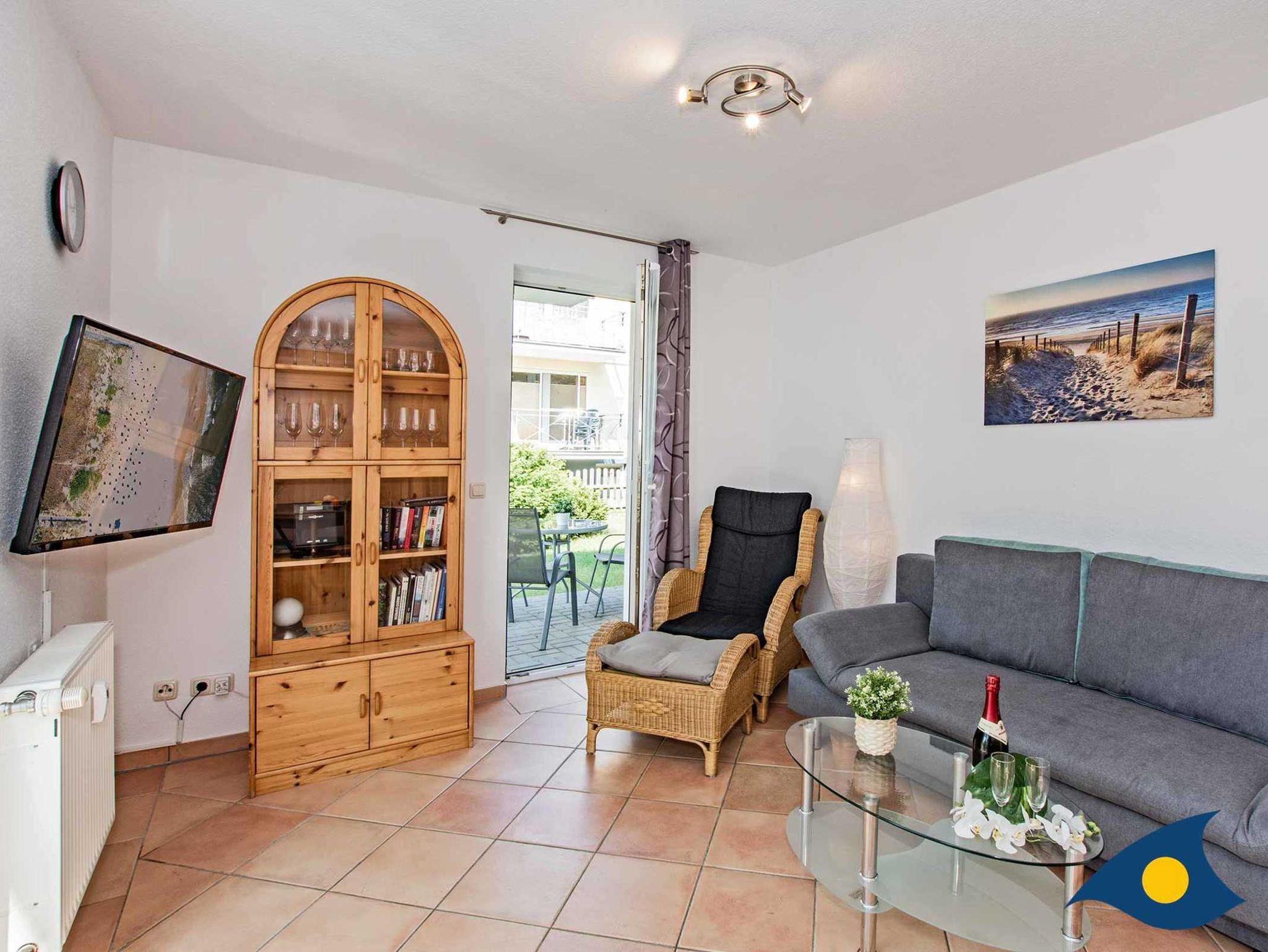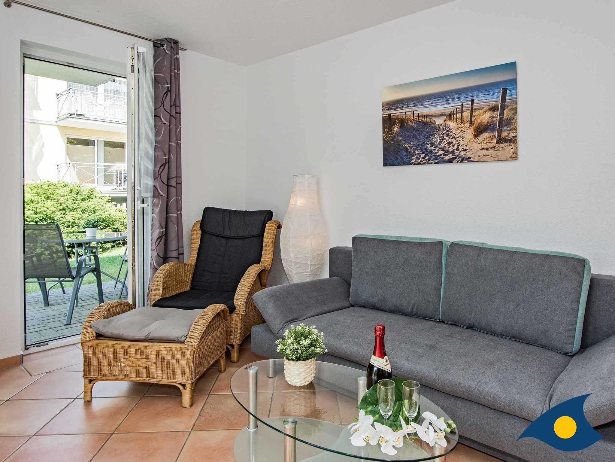 Dieses gemütliche 2-Raum-Appartement im Erdgeschoss der Villa Maria Gabrielle begrüßt Sie aufs Herzlichste. Der Wohnraum ist der Mittelpunkt des Appartements. Hier starten Sie mit einem ausgiebigen Frühstück in den Tag, planen Ausflüge, lassen den Abend mit einem Gläschen Wein vor dem Smart-TV ausklingen oder erholen sich von einem ereignisreichen Urlaubstag. Hier ist Platz für die Küchenzeile, dem großen Esstisch und einem bequemen Schlafsofa (Breite 1,50 m). Zudem erreichen Sie von hier aus die kleine Terrasse und den Garten des Hauses.