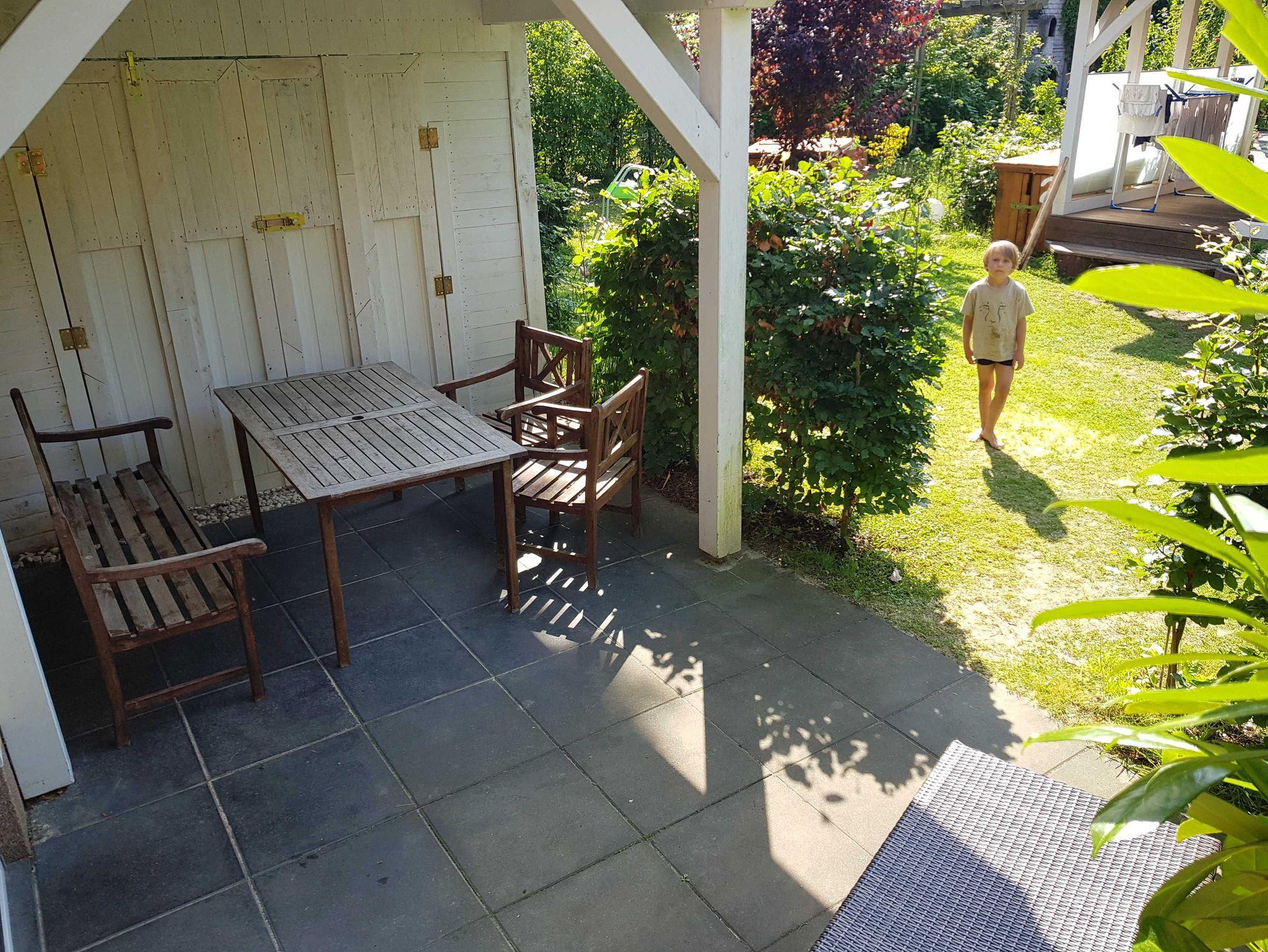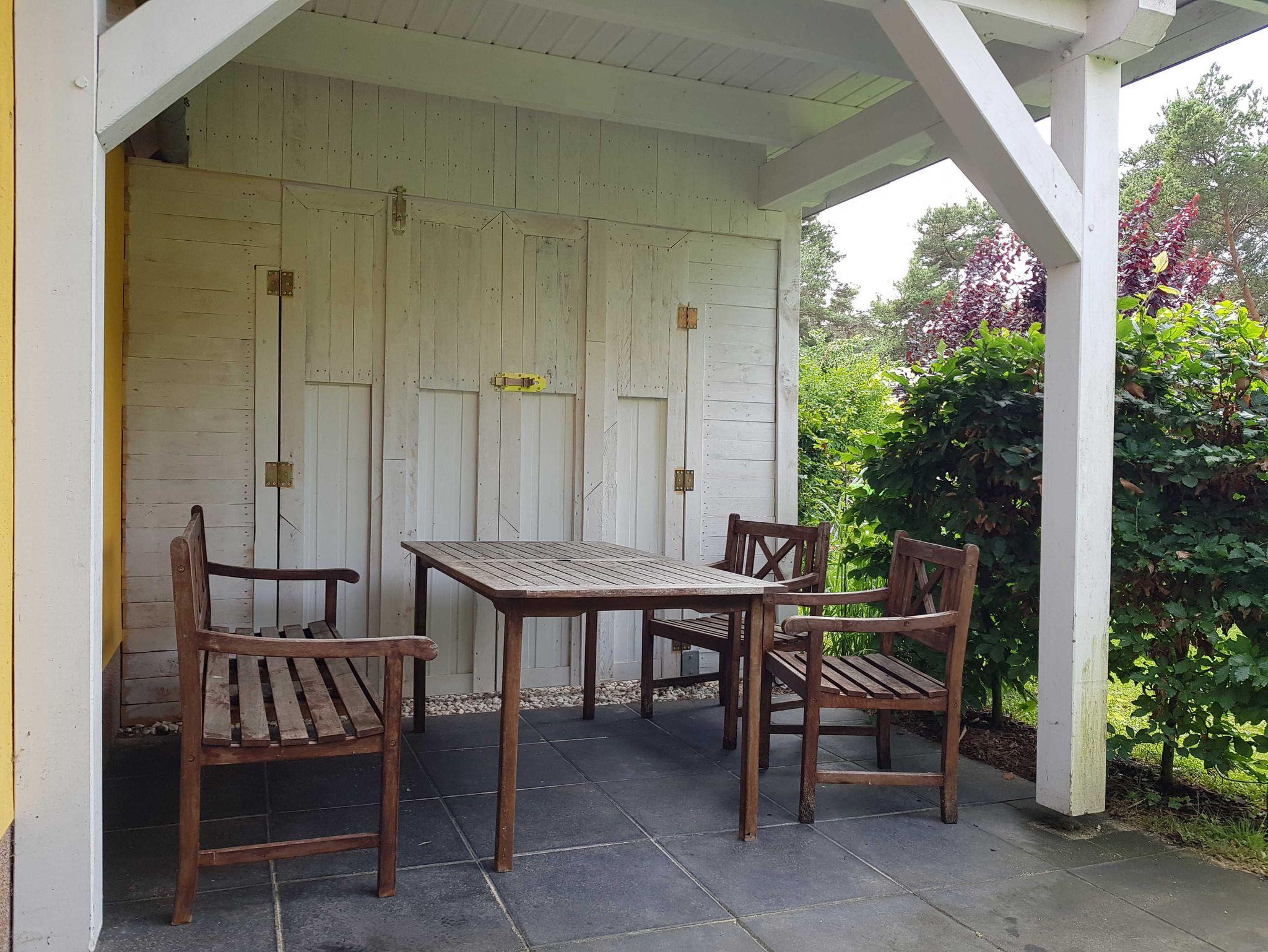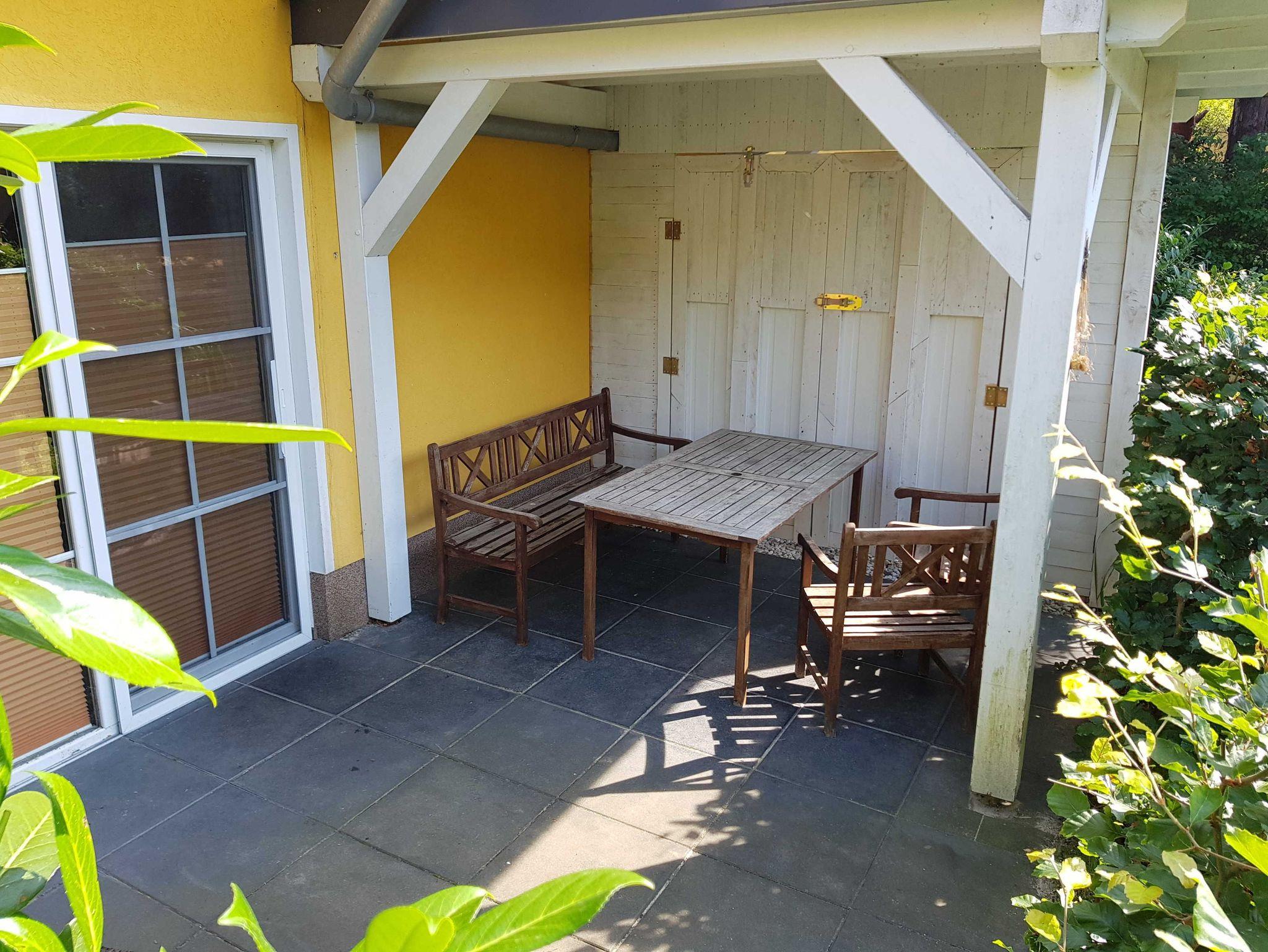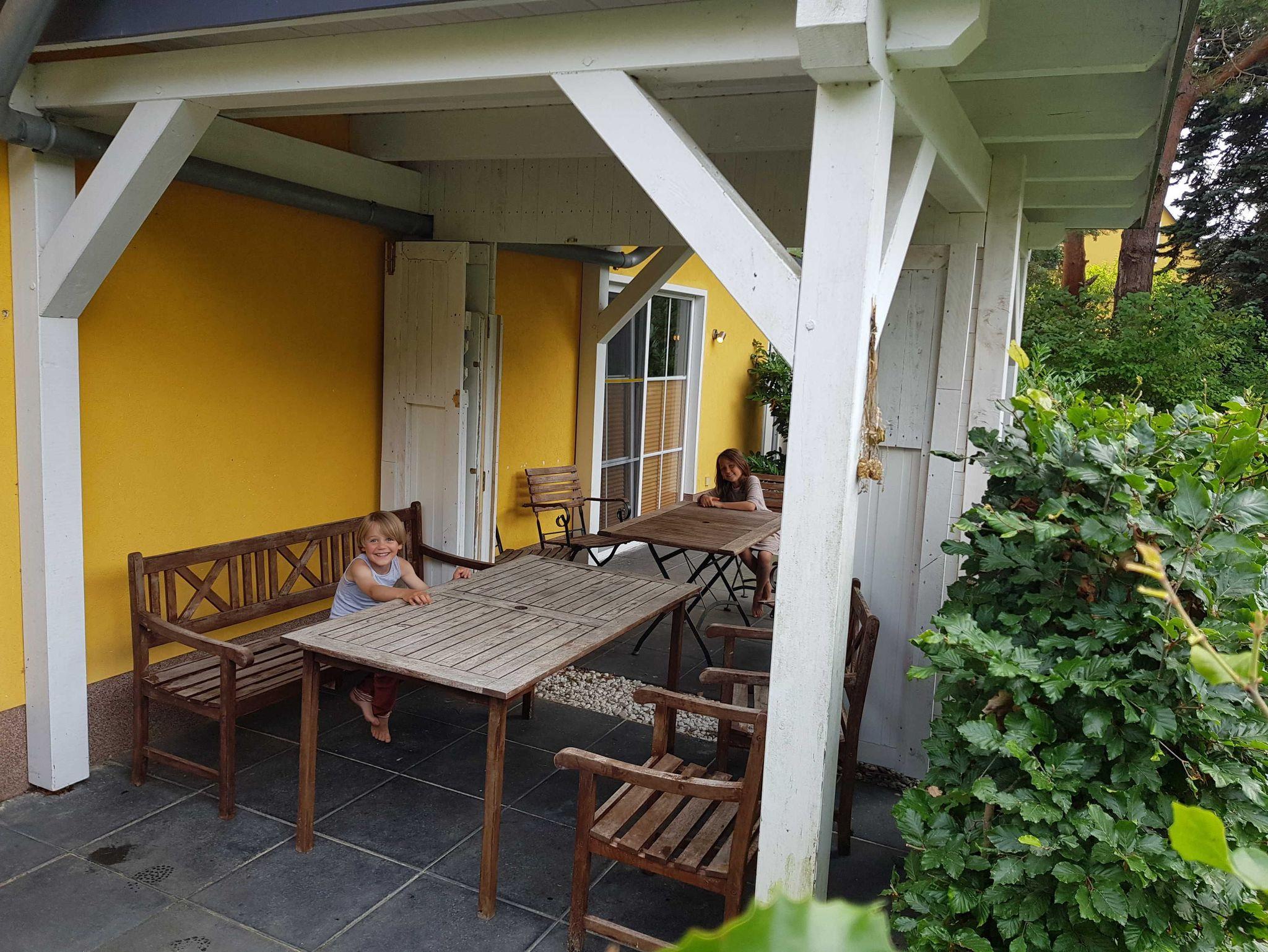 • Großzügigen Terrasse mit Gartenblick und mit Außensauna zur Nutzung. Mit stabiler Sitzgarnitur aus Holz. Für Fewo 1 mit 2 Stühlen, einer Bank und einem Tisch und für Fewo 2 mit 5 Stühlen und einem Tisch. Siehe Fotos. Terrassentür und das Terrassenfenster sind jeweils mit einem Plissee ausgestattet, welches Sie zum Schutz gegen Sonnenlicht oder Blicke nutzen können.