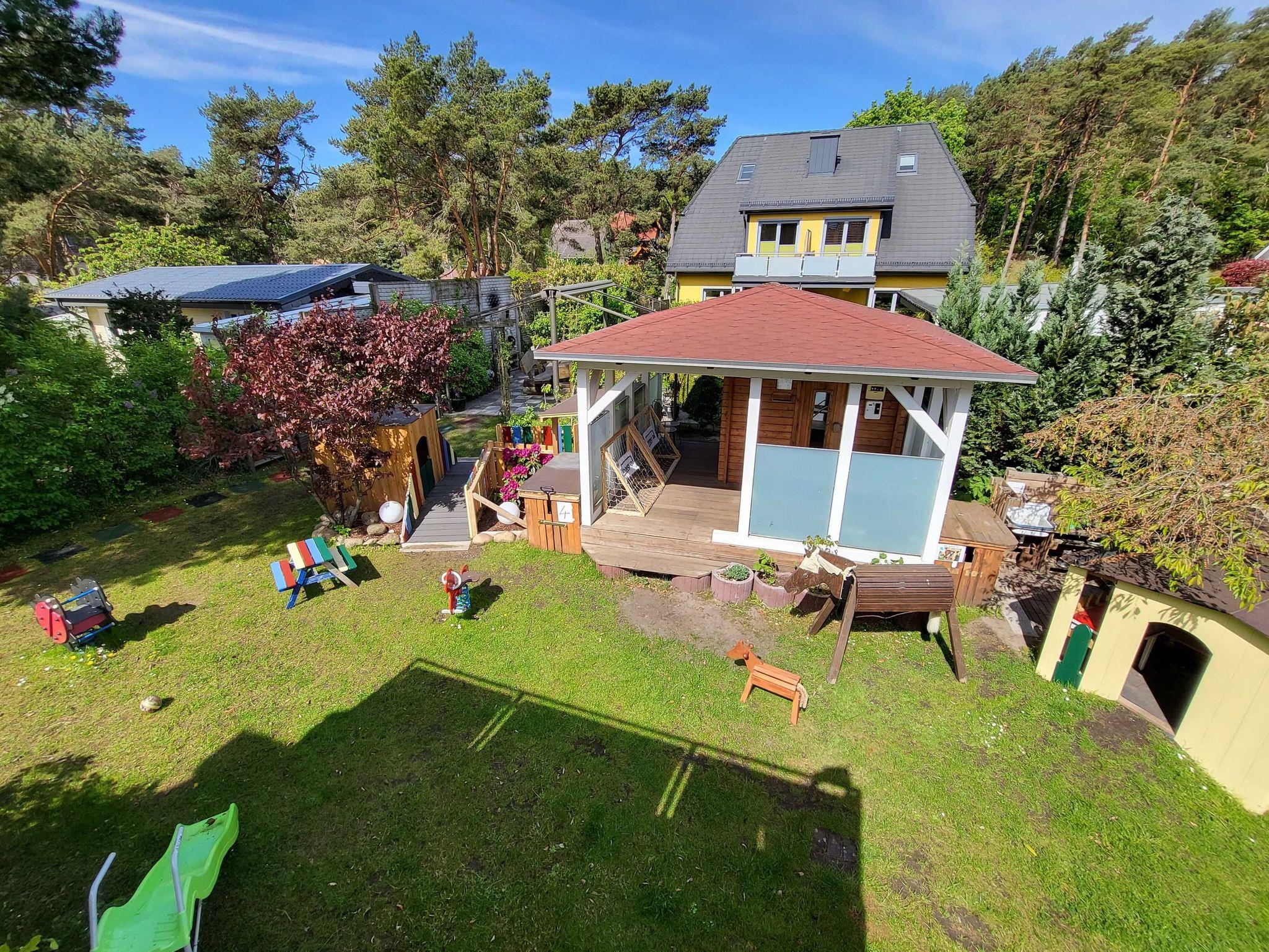 • Eine Kinderküche, Spielhäuser, eine Schultafel und mehrere Fahrgeräte stehen im Garten für alle Kinder bereit.