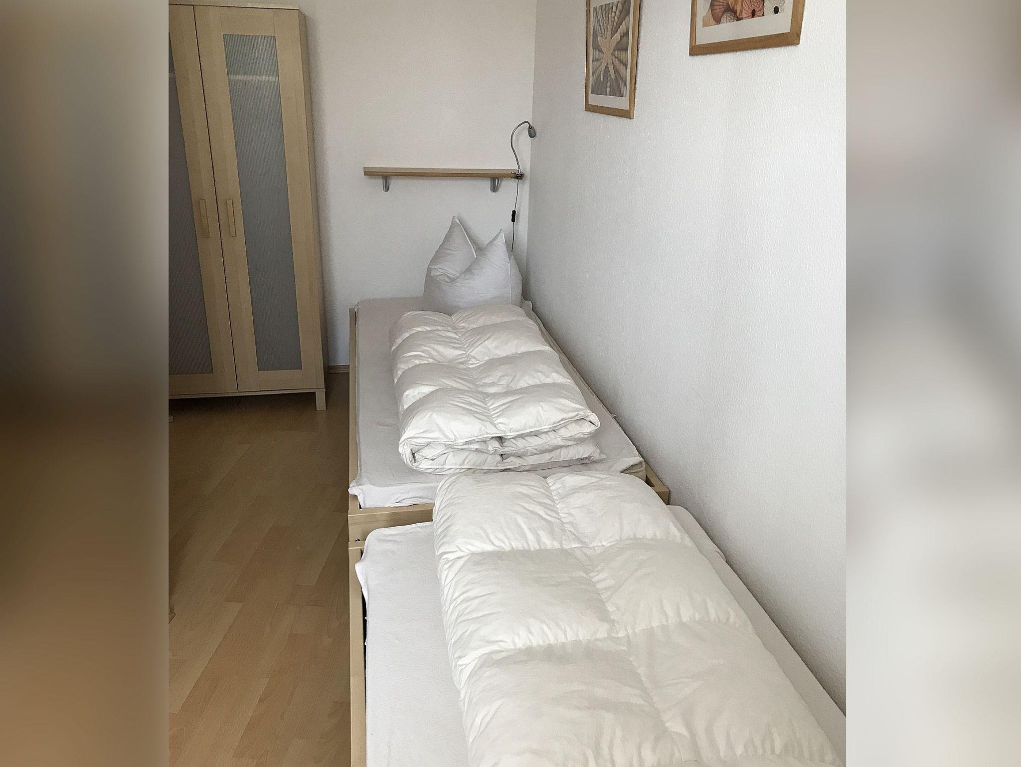 Die Wohnung verfügt über ein Schlafzimmer mit Doppelbett und ein Kinderzimmer mit zwei Einzelbetten. Beide Zimmer sind mit Vorhängen ausgestattet, die eine vollständige Verdunkelung ermöglichen. Das Bad mit Dusche verfügt über ein Fenster, das für ausreichend Tageslicht und gute Belüftung sorgt. Zur weiteren Ausstattung gehören ein praktischer Abstellraum, ein Flachbildfernseher, eine Stereoanlage und kostenloses WLAN.