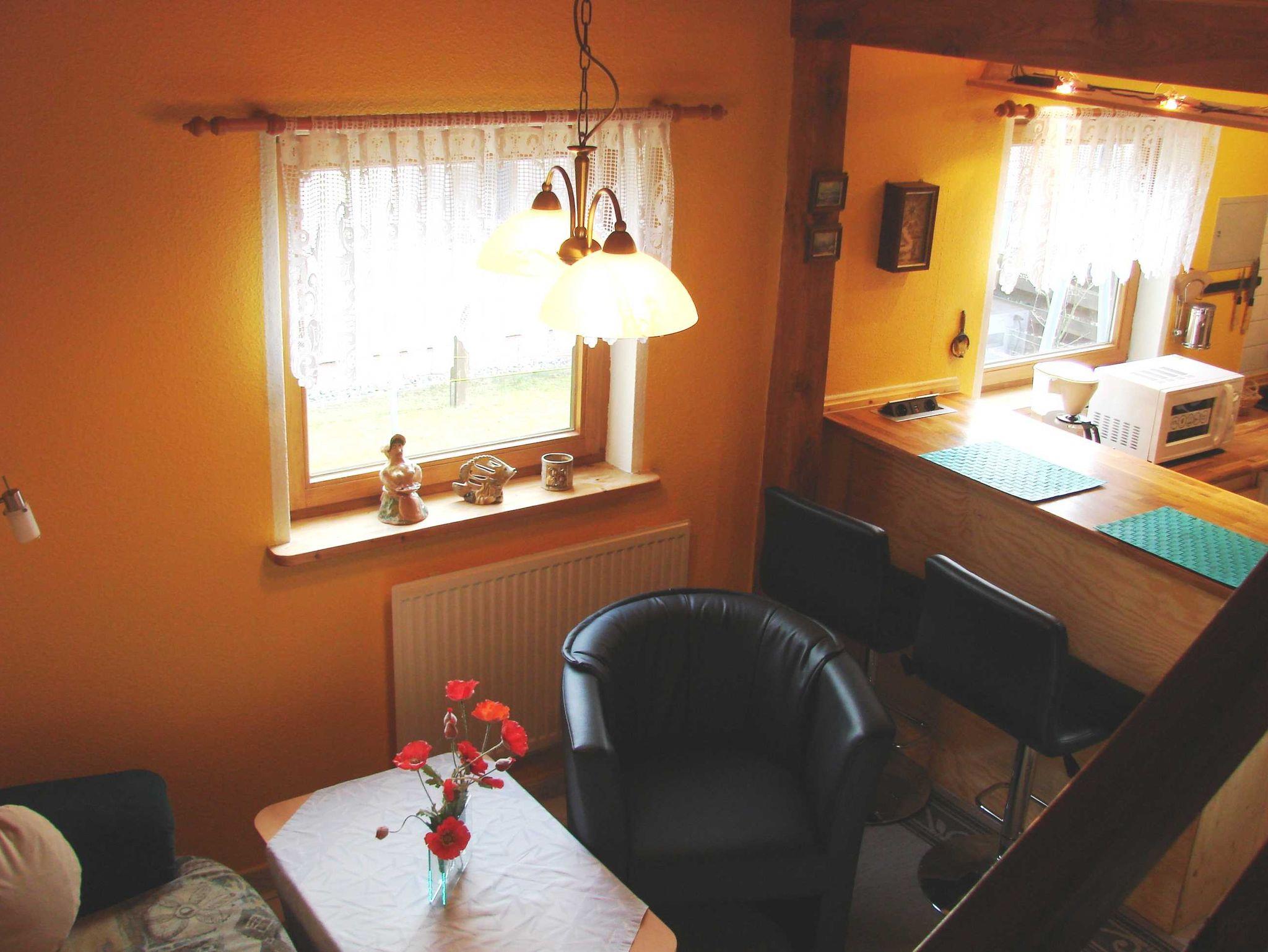 Das liebevoll eingerichtete Fachwerkhaus bietet Ihnen im Erdgeschoss einen offenen Wohn- und Küchenbereich mit Flat-TV, CD-Player & Radio. Die Küche ist mit einem Kühlschrank, Cerankochfeld, Backofen, Kaffeemaschine und einer Mikrowelle ausgestattet. Das Bad verfügt über Dusche/WC und einen Fön. Im Obergeschoss finden Sie auf der Galerie ein Doppelbett, sowie ein weiteres separates Schlafzimmer mit einem Einzelbett. und einem zusätzlichen Fernseher. Auf der großzügigen Sonnenterrasse mit Gartenpavillon und schönem Blick in den Garten & Wald stehen Ihnen Gartenmöbel und ein Grill zur Verfügung.