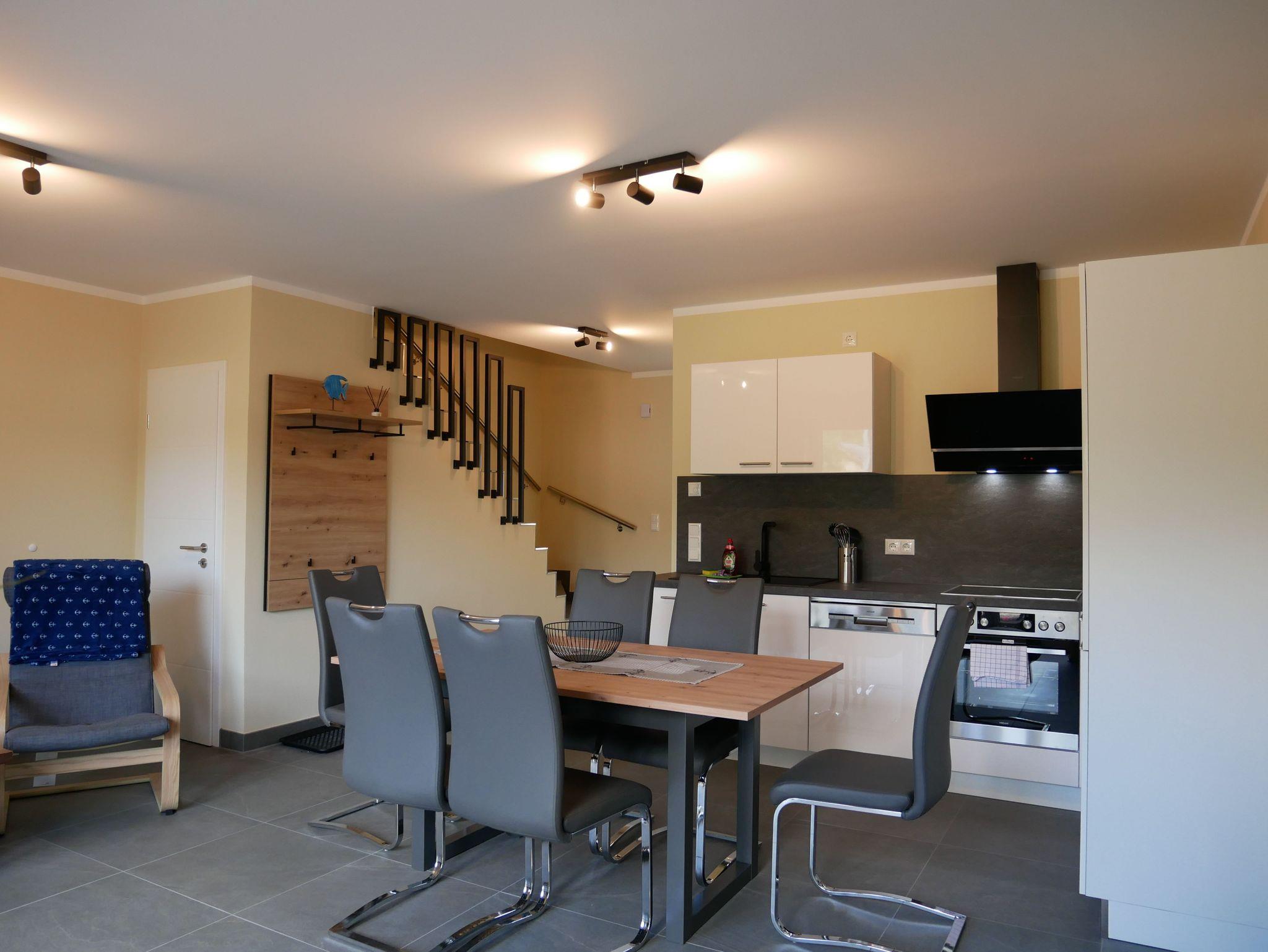 In Ihrer großzügigen, ca. 100m² großen Ferienwohnung im Kelm?s Küstennest erwartet Sie moderner Komfort auf zwei Etagen ? ideal für bis zu sechs Personen. Im Erdgeschoss befindet sich der offen gestaltete Wohnbereich mit einem gemütlichen Sofa und einem Smart-TV (Flachbildfernseher). Die angrenzende, voll ausgestattete Küche mit Esstisch und Stühlen bietet alles, was Sie für eine entspannte Selbstverpflegung benötigen: Herd, Backofen, Mikrowelle, Kühlschrank mit Tiefkühlfach, Spülmaschine, Toaster, Wasserkocher, Kaffeemaschine und Waschmaschine stehen Ihnen zur Verfügung.