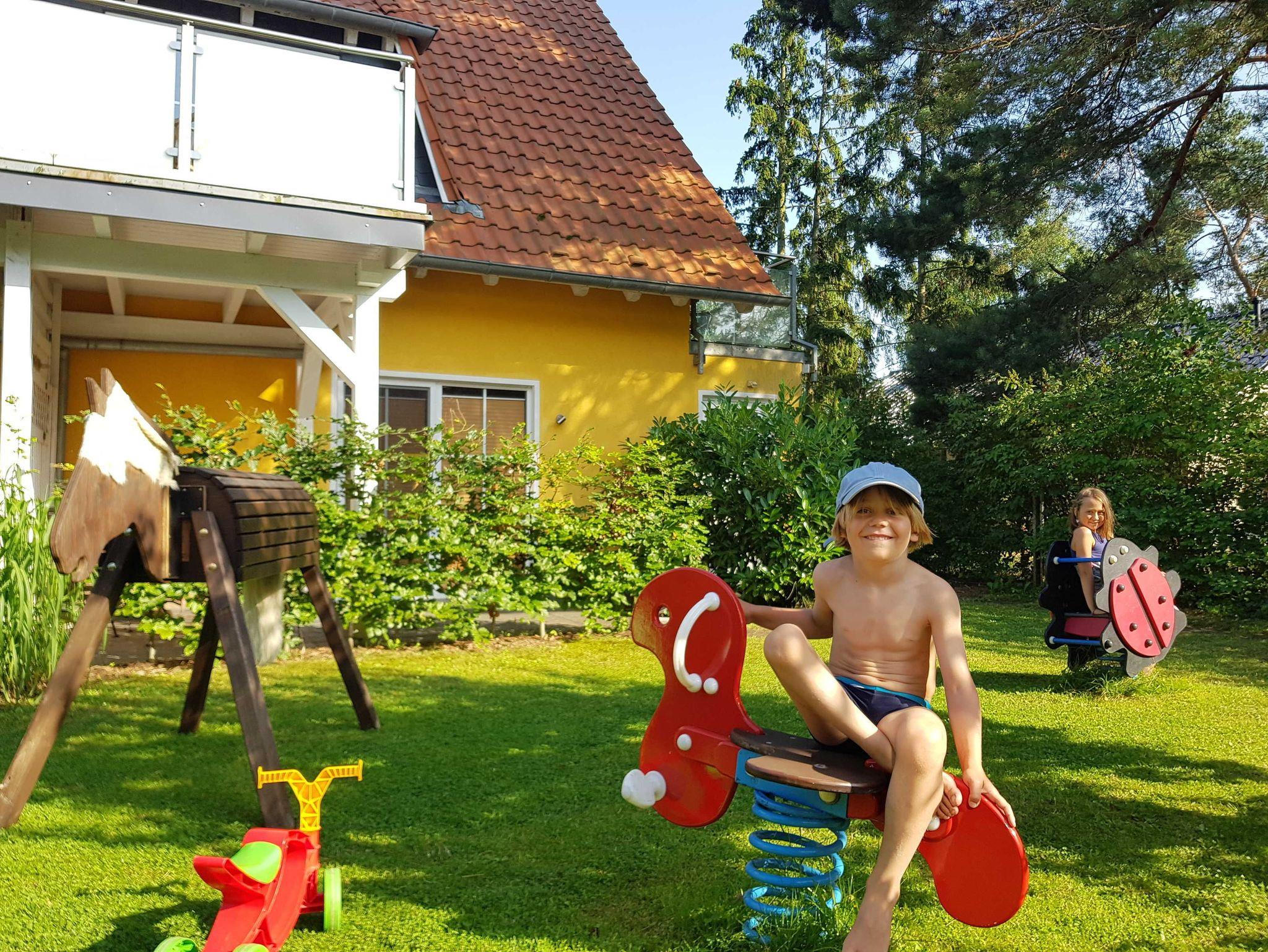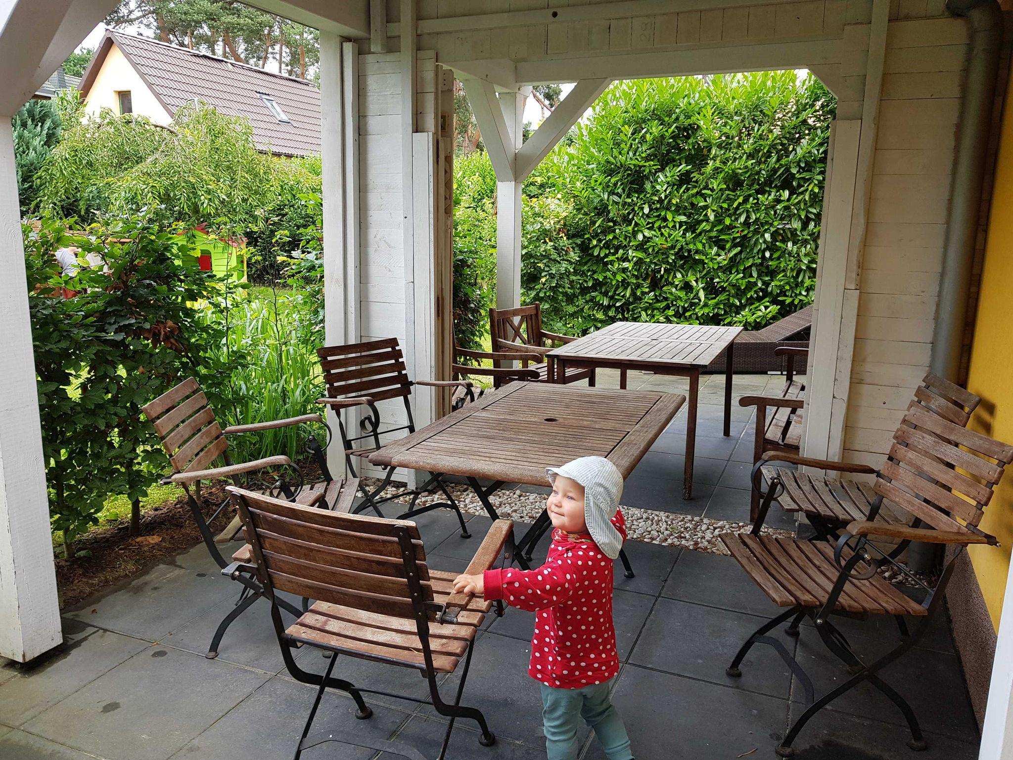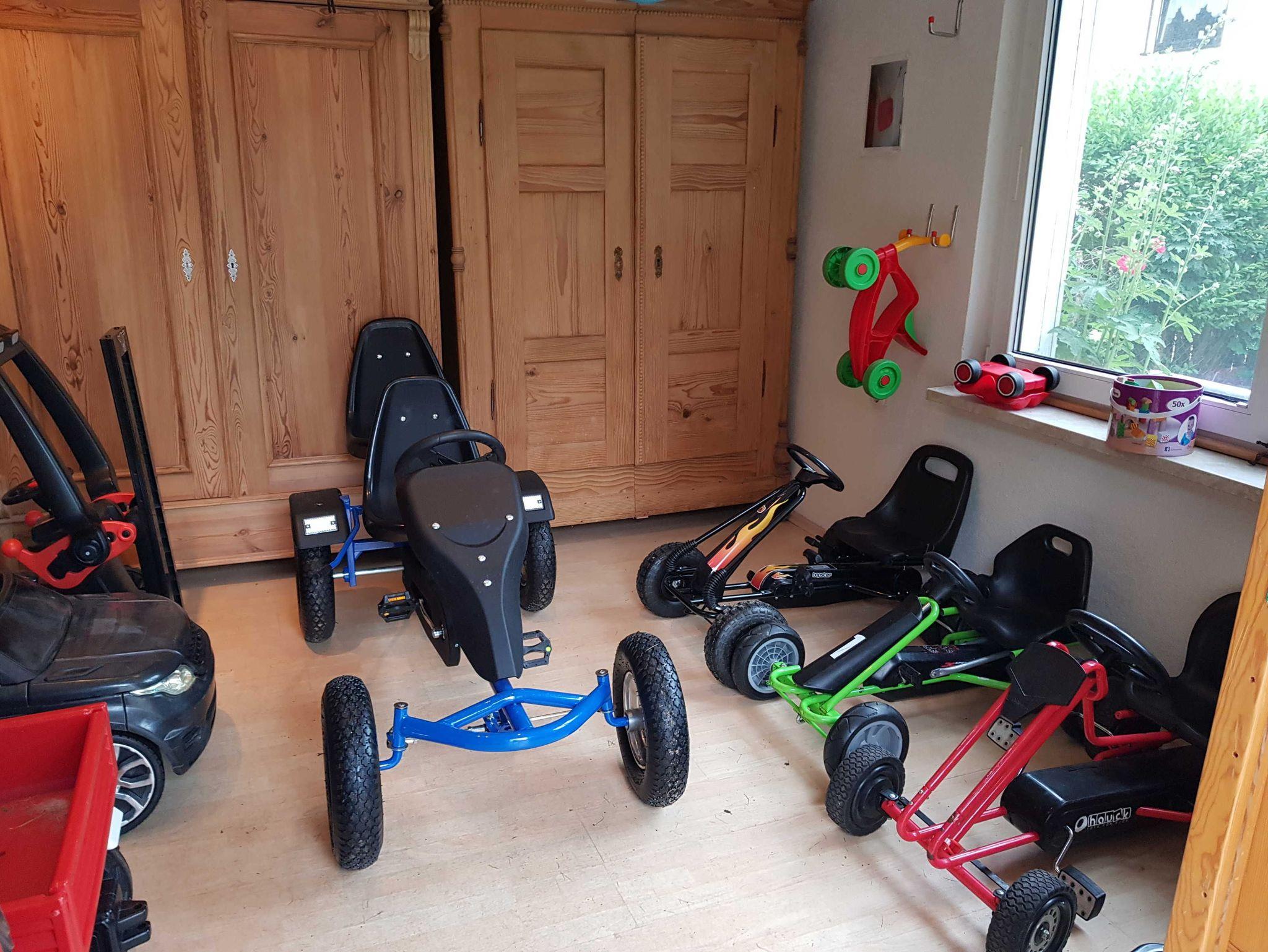• Eine Kinderküche, Spielhäuser, eine Schultafel und mehrere Fahrgeräte stehen im Garten für alle Kinder bereit.