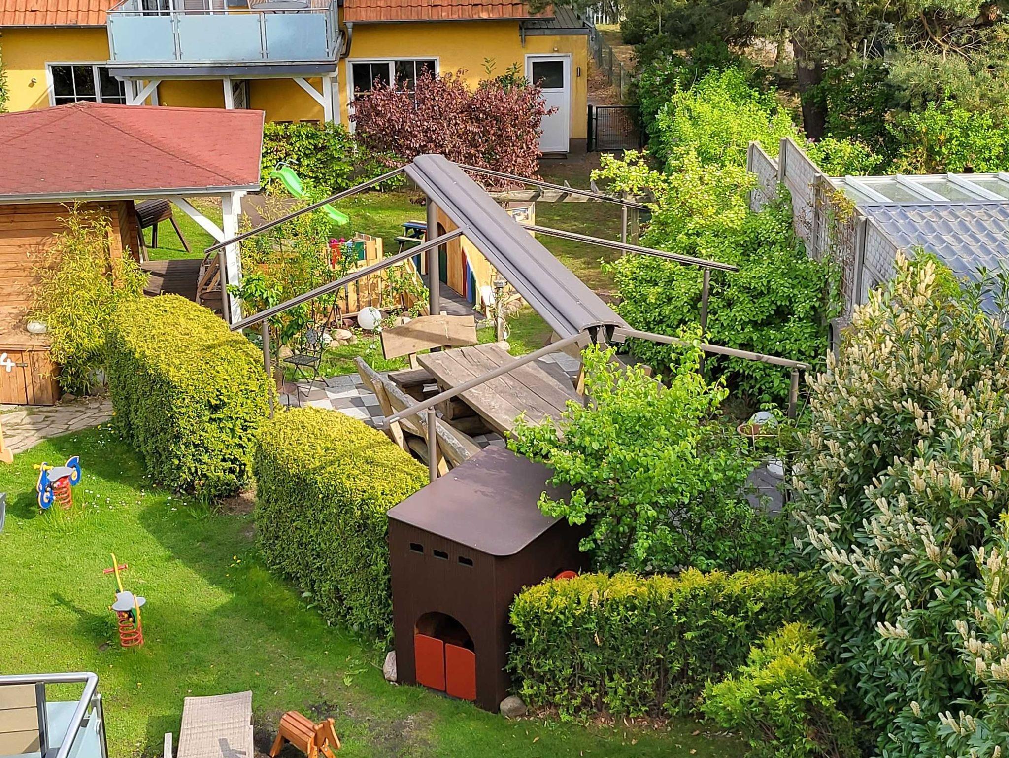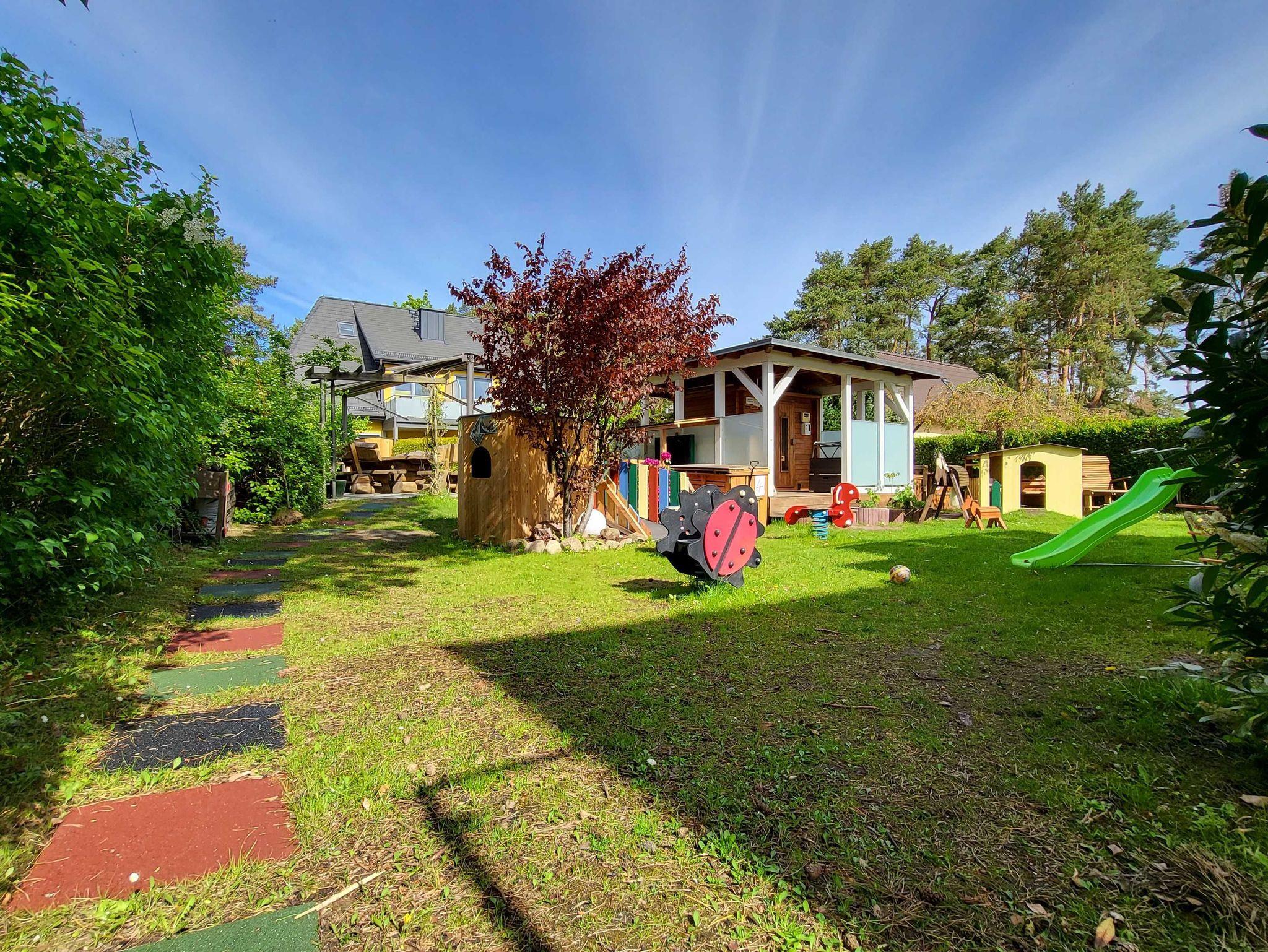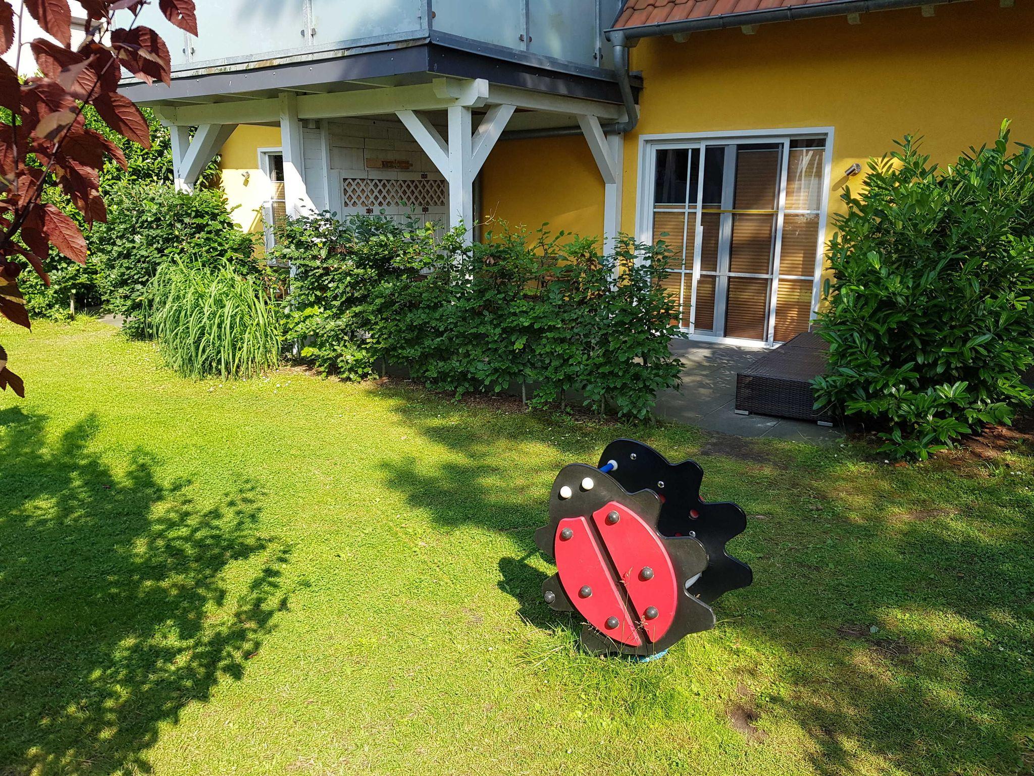 • Eine Kinderküche, Spielhäuser, eine Schultafel und mehrere Fahrgeräte stehen im Garten für alle Kinder bereit.
