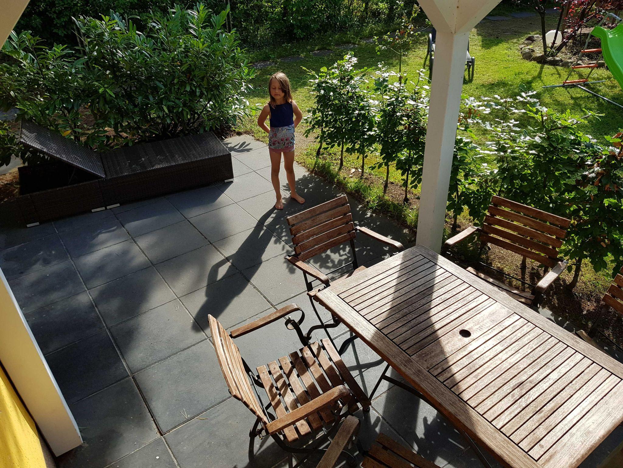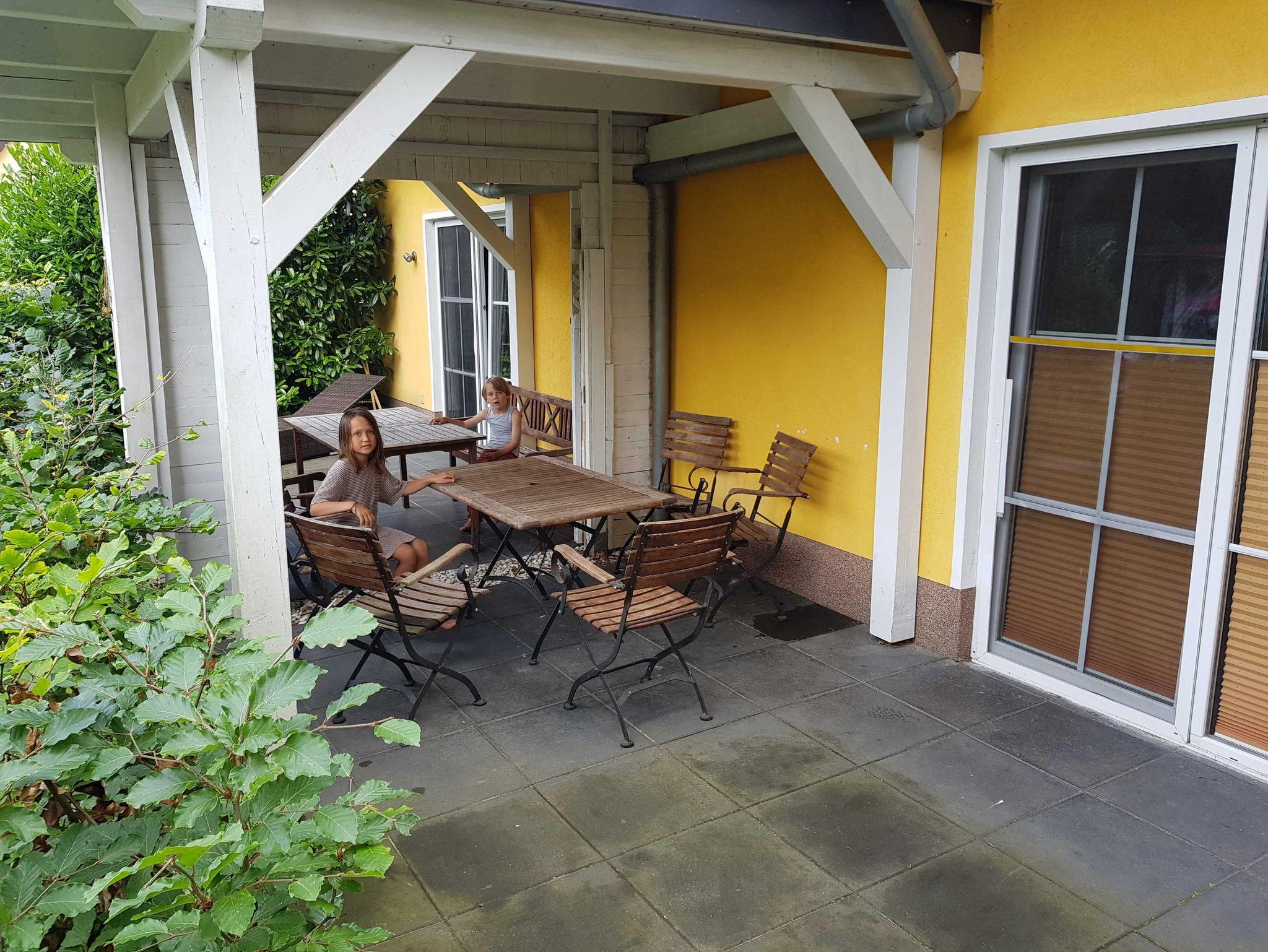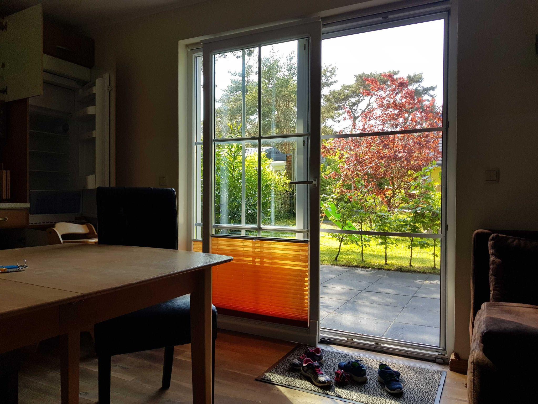 • Großzügigen Terrasse mit Gartenblick und mit Außensauna zur Nutzung. Mit stabiler Sitzgarnitur aus Holz. Für Fewo 1 mit 2 Stühlen, einer Bank und einem Tisch und für Fewo 2 mit 5 Stühlen und einem Tisch. Siehe Fotos. Terrassentür und das Terrassenfenster sind jeweils mit einem Plissee ausgestattet, welches Sie zum Schutz gegen Sonnenlicht oder Blicke nutzen können.