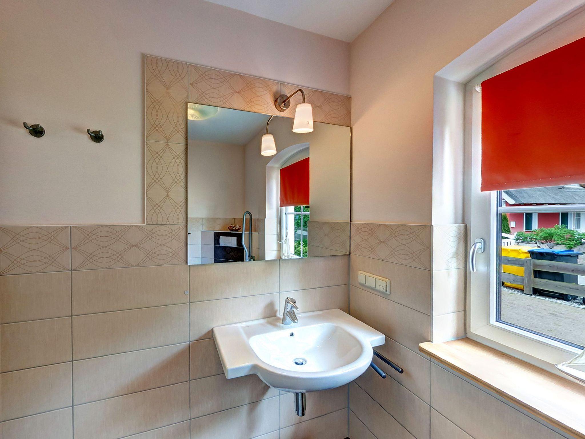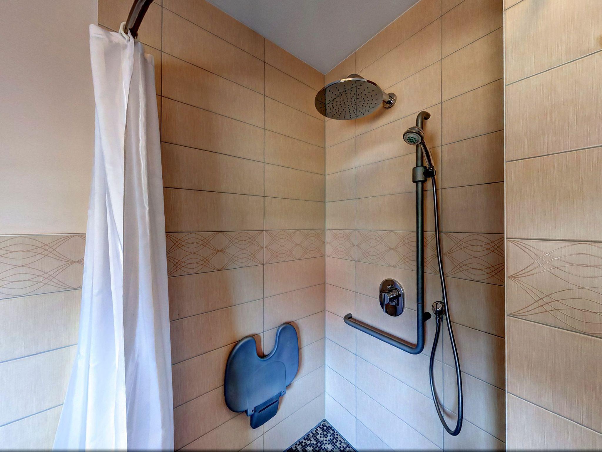 Ebenfalls im Erdgeschoss befindet sich ein Schlafzimmer mit einem komfortablen Doppelbett sowie ein behindertengerechtes Badezimmer mit Dusche und WC.