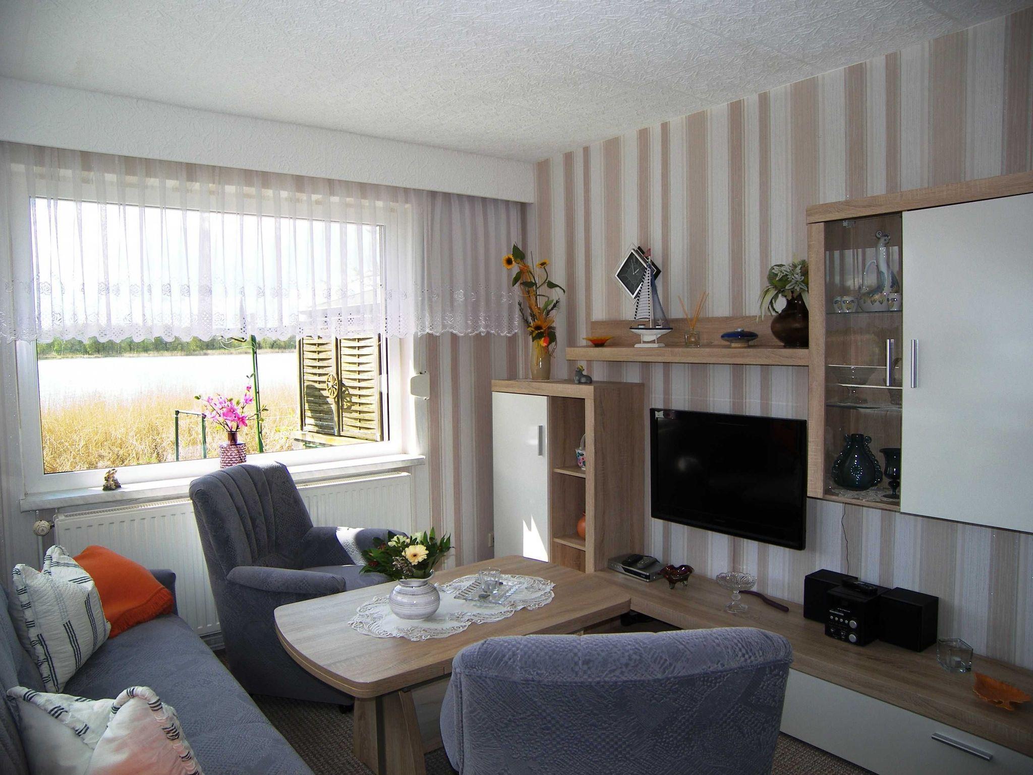 Das Ferienhaus liegt separat auf dem Grundstück der Vermieter und ist ca. 38 m² groß. Vom Wohnzimmer aus können Sie ebenfalls den Blick über den See genießen. Das Wohnzimmer ist ausgestattet mit einer Couchsitzecke, Wohnwand, Flachbildfernseher und Radio. Die offene Küche mit Mikrowelle, Kaffeemaschine, Toaster und Kapselkaffeemaschine integriert sich mit in den Wohnbereich. Das Schlafzimmer verfügt über ein Doppelbett und einen großen Kleiderschrank. Das Badezimmer ist mit einer Dusche ausgestattet. Die Bettwäsche ist bereits im Gesamtpreis enthalten. Handtücher sind bitte selbst mitzubringen. Diese werden nicht zur Verfügung gestellt.