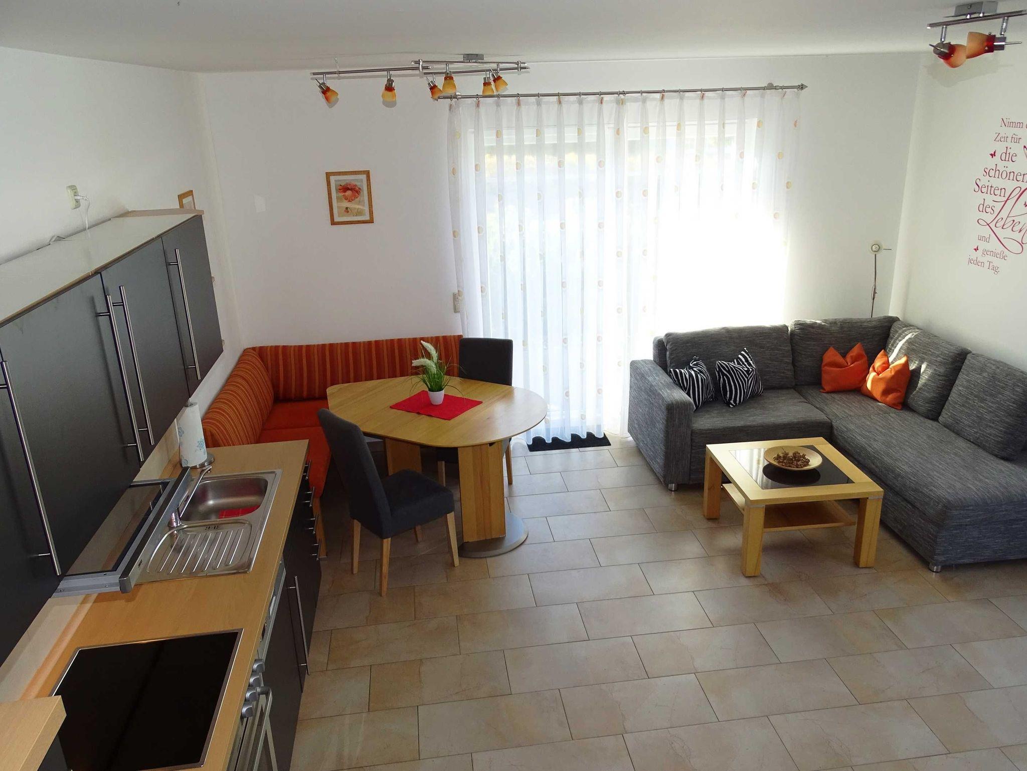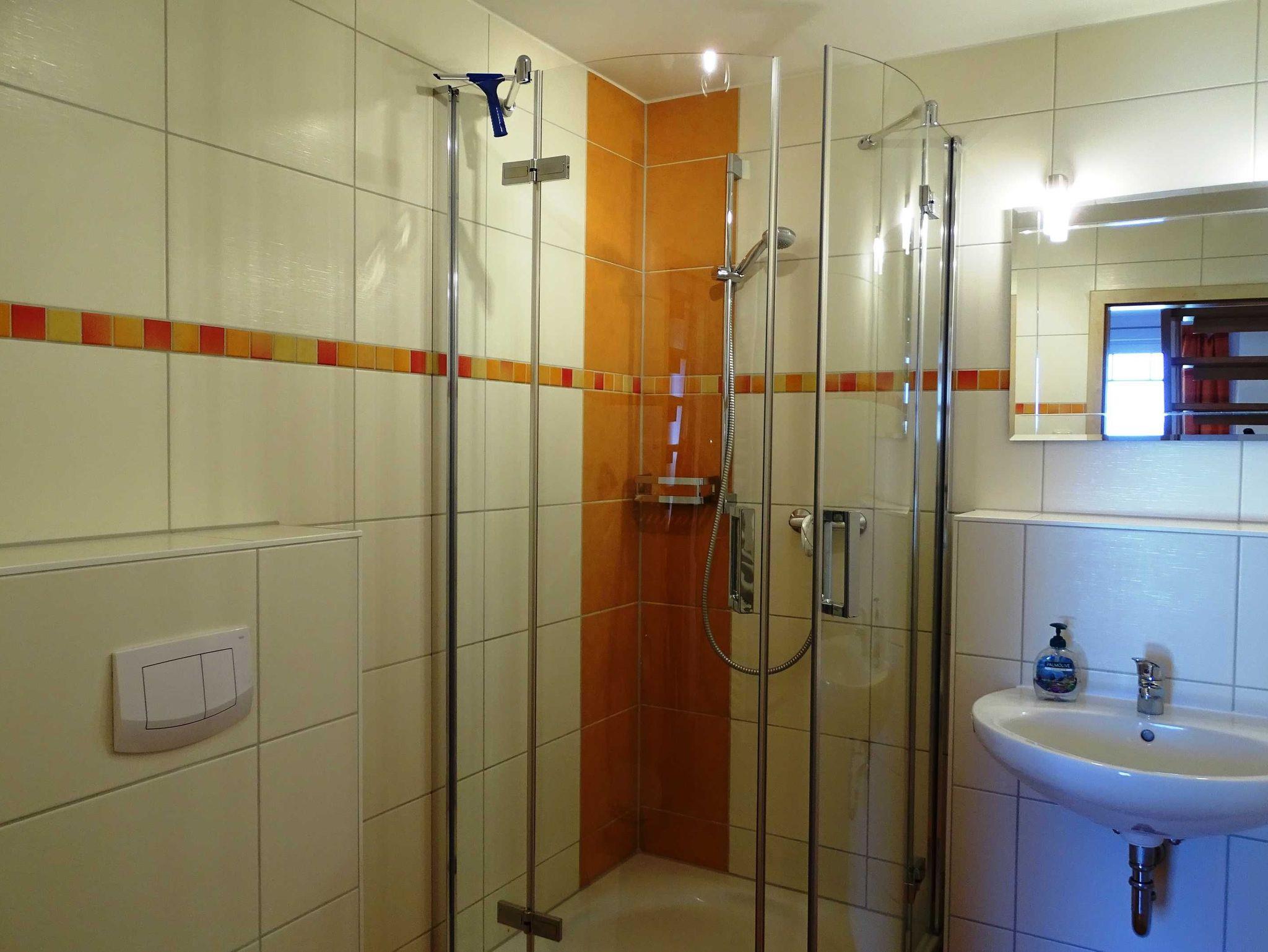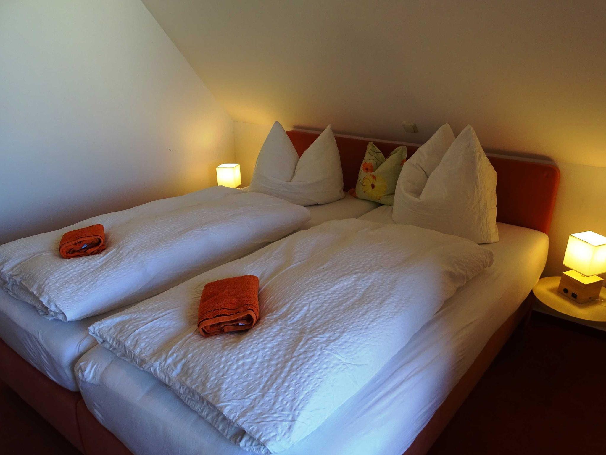 Die 70 m² große Ferienwohnung hat einen separaten ebenerdigen Eingang und jeweils eine Terrasse in Süd- und in Westlage mit Sitzgruppen. Erleben Sie hier einen unvergesslichen Sonnenuntergang! Im Erdgeschoss befindet sich das Wohnzimmer mit integrierter voll ausgestatteter Küche sowie ein Gäste-WC. Im ersten Obergeschoss befindet sich ein Schlafzimmer mit einem Doppelbett sowie ein Bad mit Dusche/WC. Vom ersten Obergeschoss erreichen Sie über eine normale Treppe den ausgebauten Schlafboden mit zwei Betten.