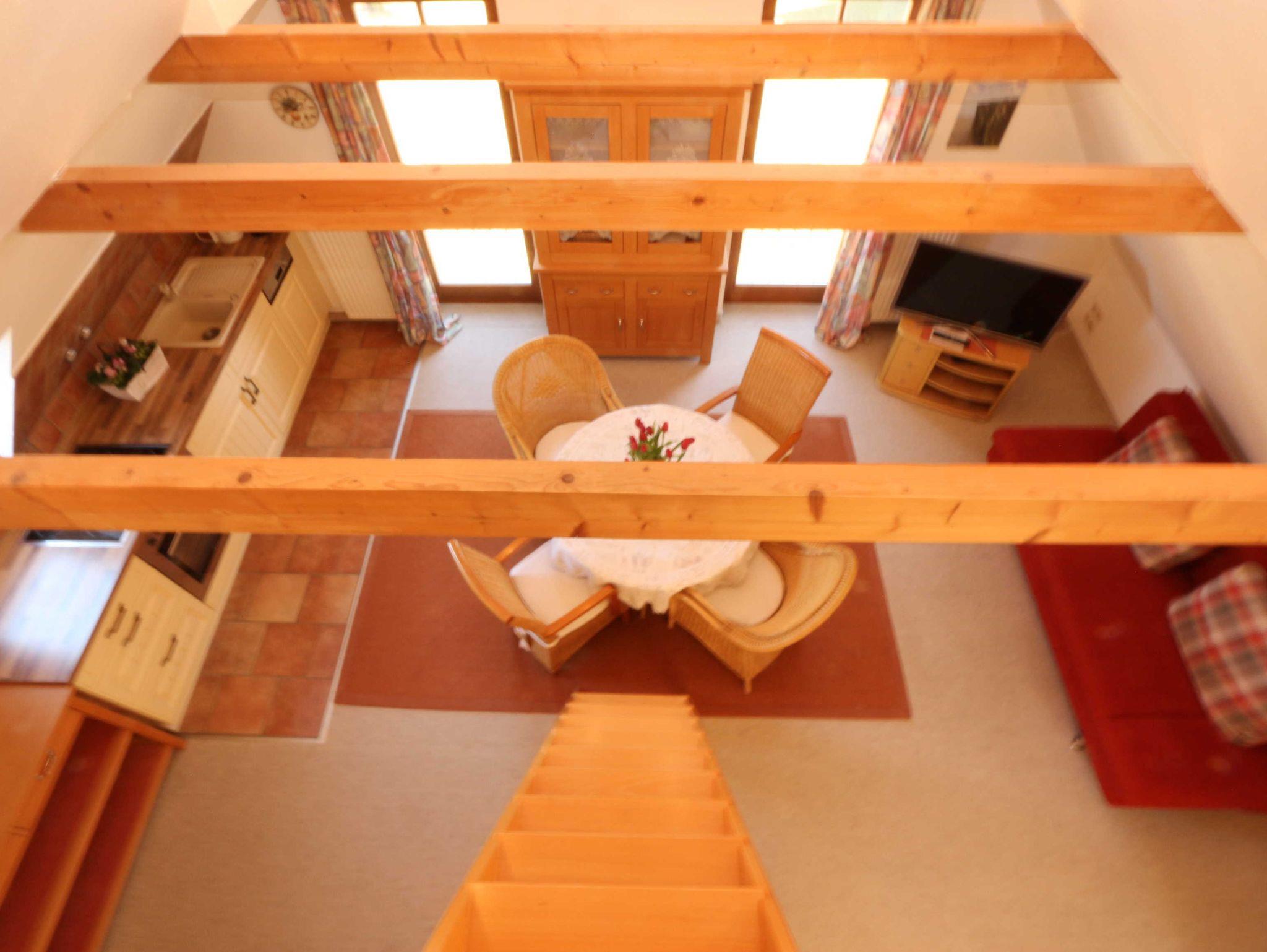 Zur Wohnung gehört eine Schlafzimmer, ein Bad mit Dusche, ein offener Schlafboden und ein Wohn- und Esszimmer mit Küchenzeile.