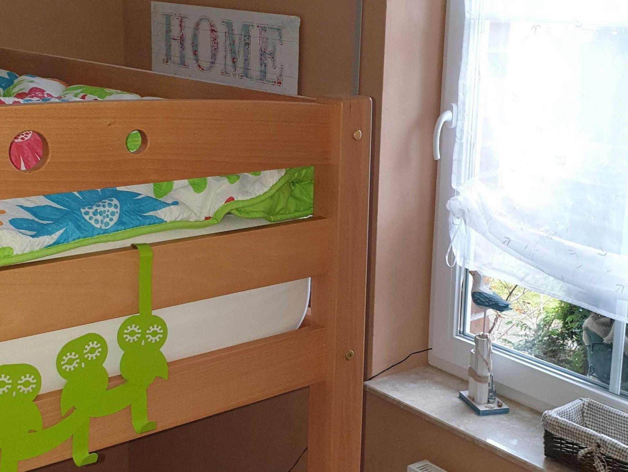 Die Ferienwohnung in der Doppelhaushälfte erstreckt sich über zwei Etagen. Im Erdgeschoss befinden sich das Wohnzimmer mit integrierter Küche (Zwei-Platten-E-Kocher, Kühlschrank, Kaffeemaschine, Toaster, Geschirr etc.), das Bad mit Dusche und WC sowie ein Schlafzimmer mit Etagenbett. Im Frühjahr 2024 wurde die Wohnung noch einmal renoviert.