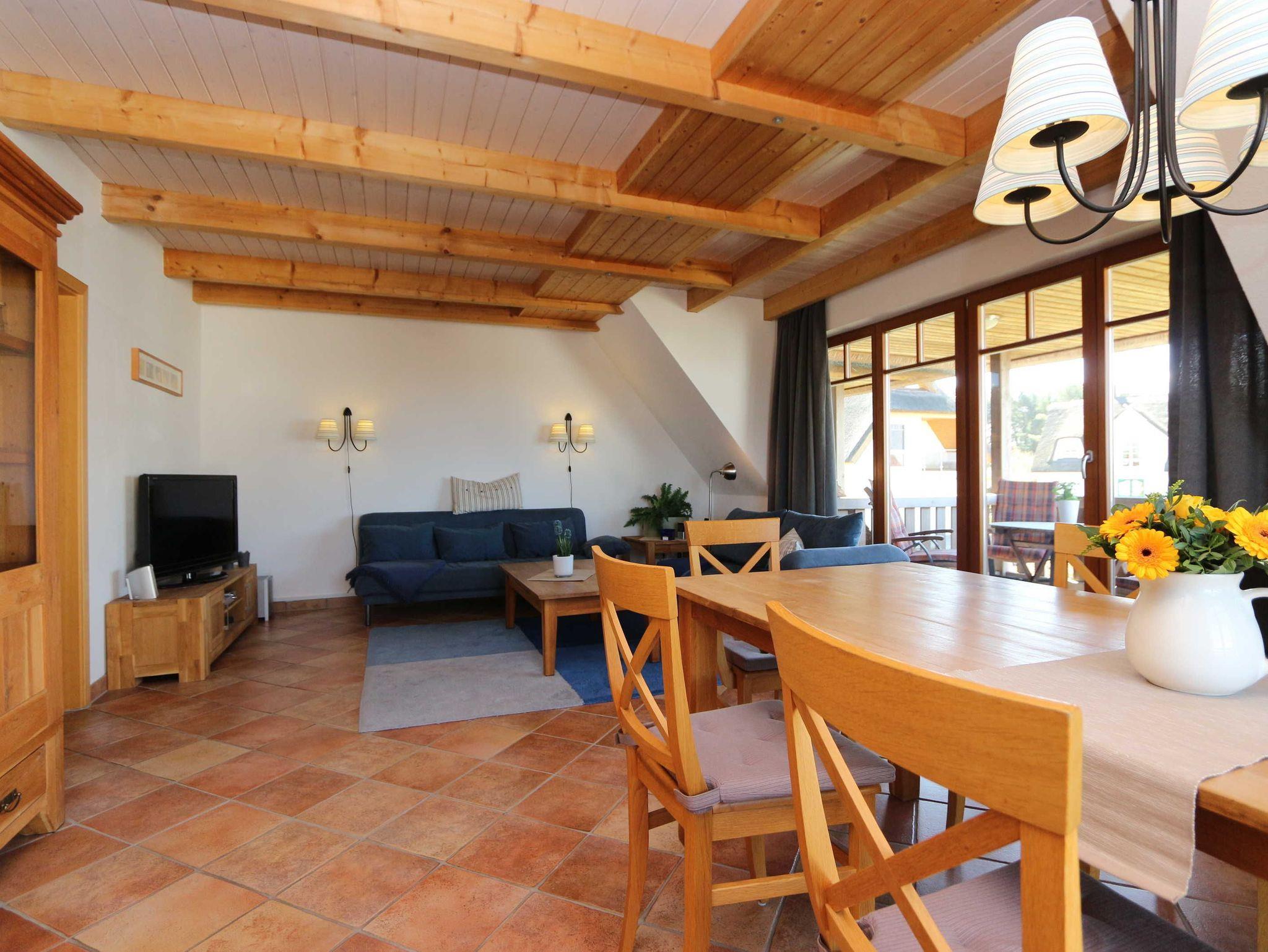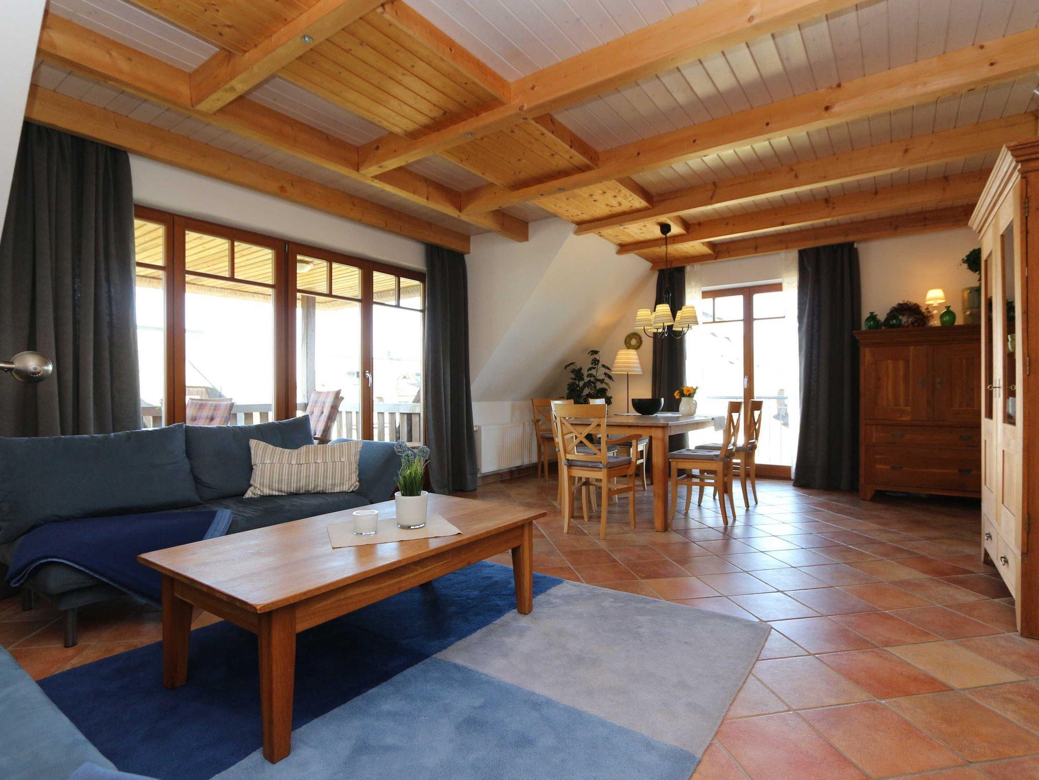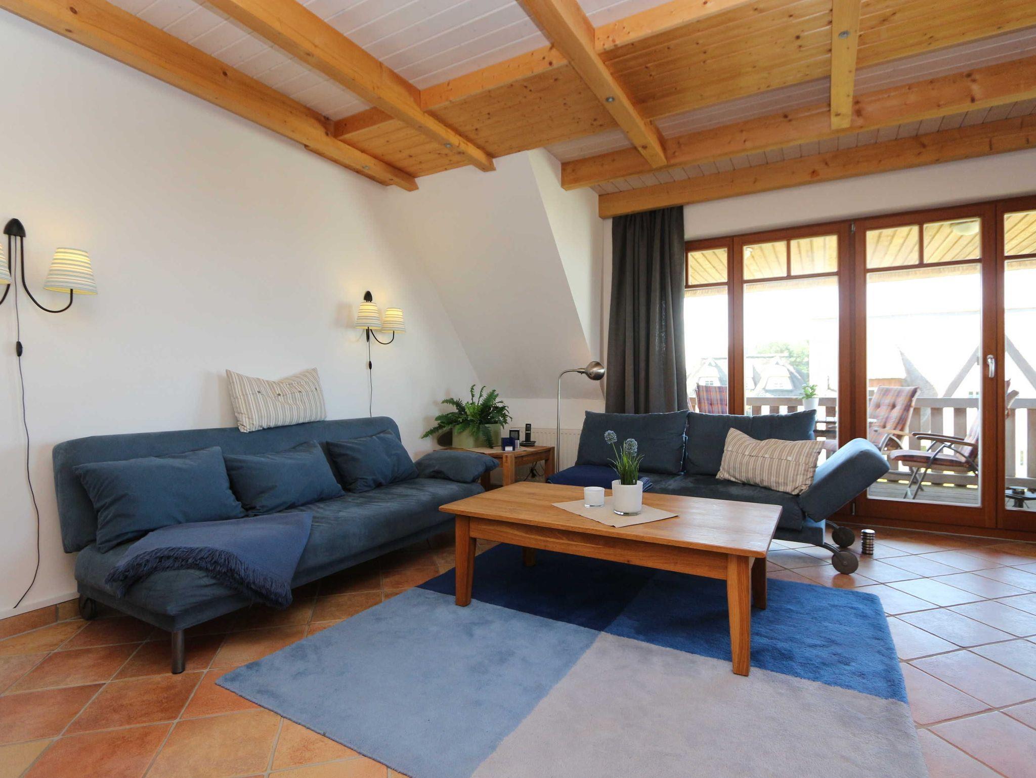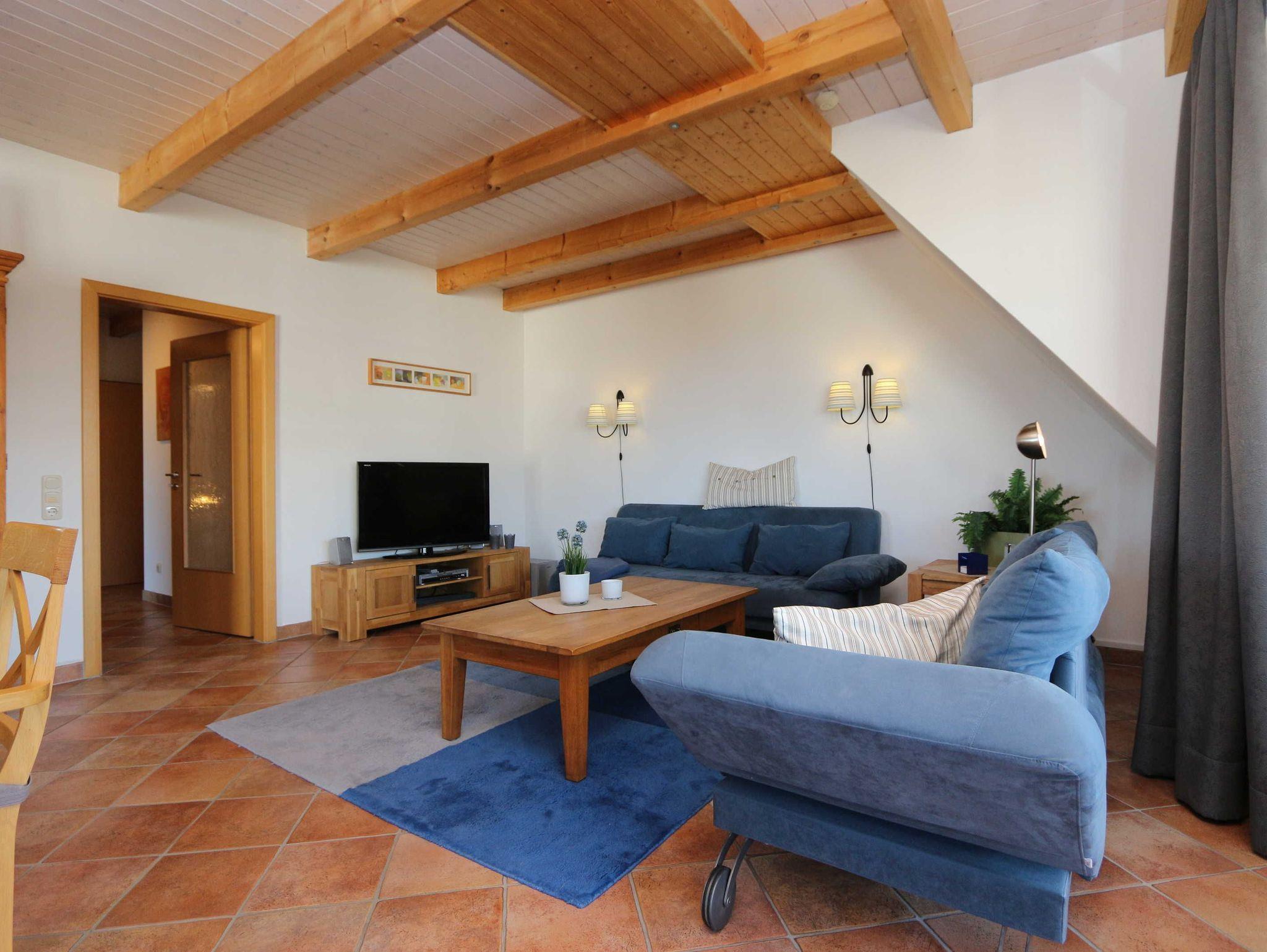 - Wohnzimmer mit zwei bequemen und gemütlichen Sofas, Couchtisch, Fernseher, Anrichte, die Sofas können auch als alternative Schlafmöglichkeiten genutzt werden;