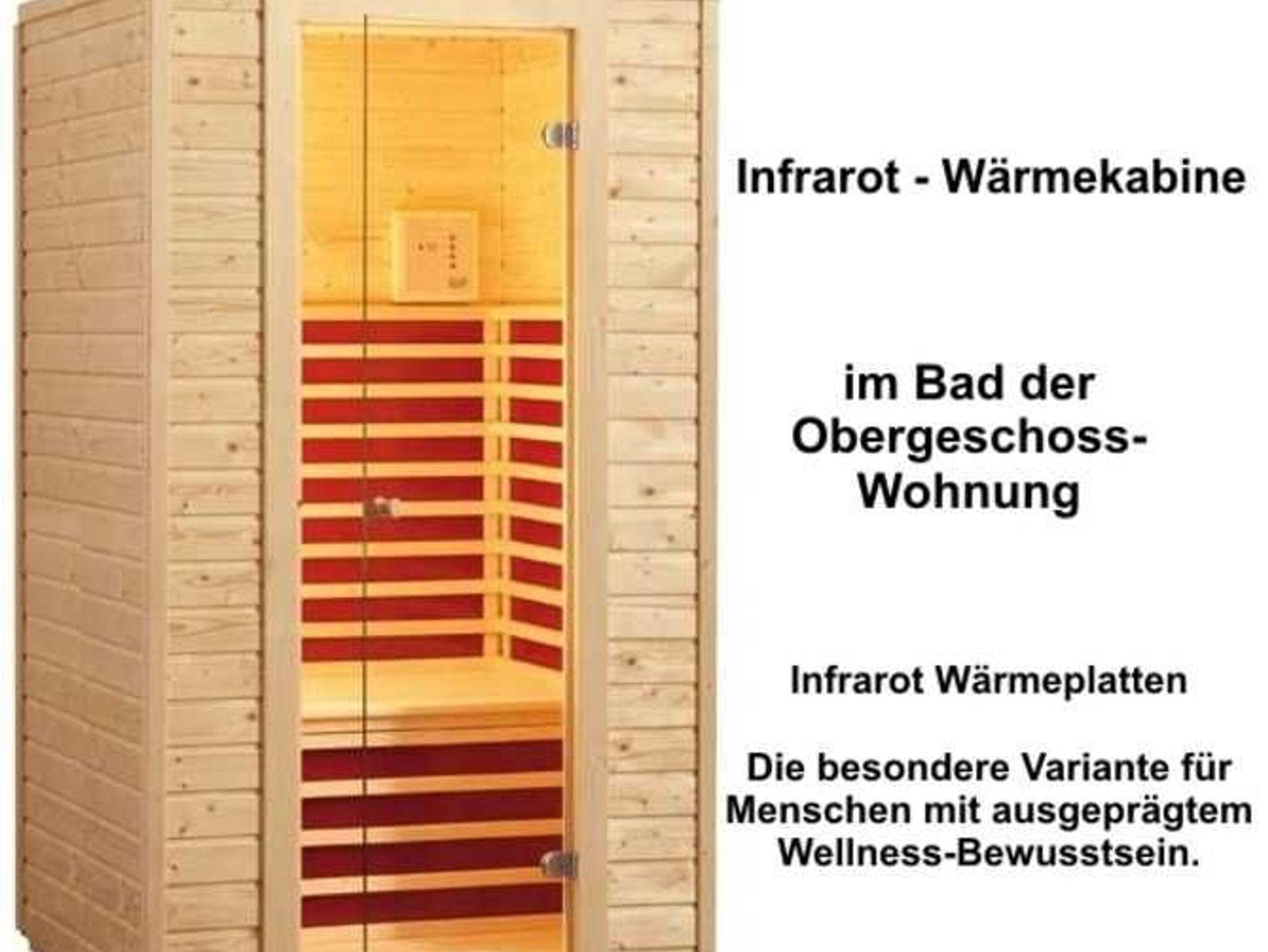 • Für unsere Gäste haben wir im Bad eine hochwertige Infrarot-Wärmekabine mit IR-Wärmeplatten zur kostenfreien Benutzung eingebaut. Die Erwärmung in der Infrarot-Wärmekabine erfolgt nach dem Prinzip der Sonne (Strahlung). Die Durchblutung wird angeregt, die Entschlackung reinigt den Körper von Giftstoffen und die optimale Sauerstoffsituation steigert den Energiehaushalt.