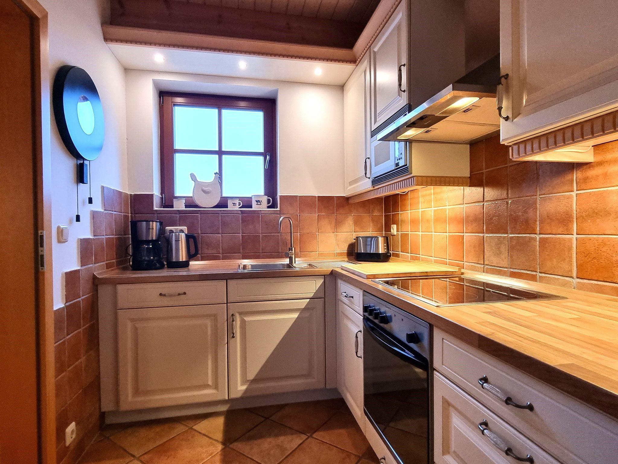 - Küche mit Einbauküche, Spülmaschine, Backofen, Glaskeramikkochfeld, Mikrowelle, Wasserkocher, Kaffeemaschine, Toaster, Mixer, Kühlschrank mit Gefrierfach und reichlich Geschirr;