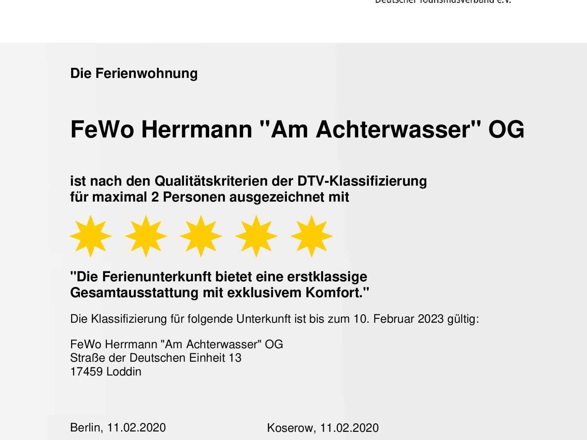 • Diese Wohnung wurde vom DTV (Deutscher Tourismusverband) mit 5-Sternen bei einer Belegung mit 2 Personen klassifiziert. Bei einer Belegung von mehr als 2 Personen ist der DTV-Sterne-Standard von 5-Sternen nicht mehr gewährleistet.
