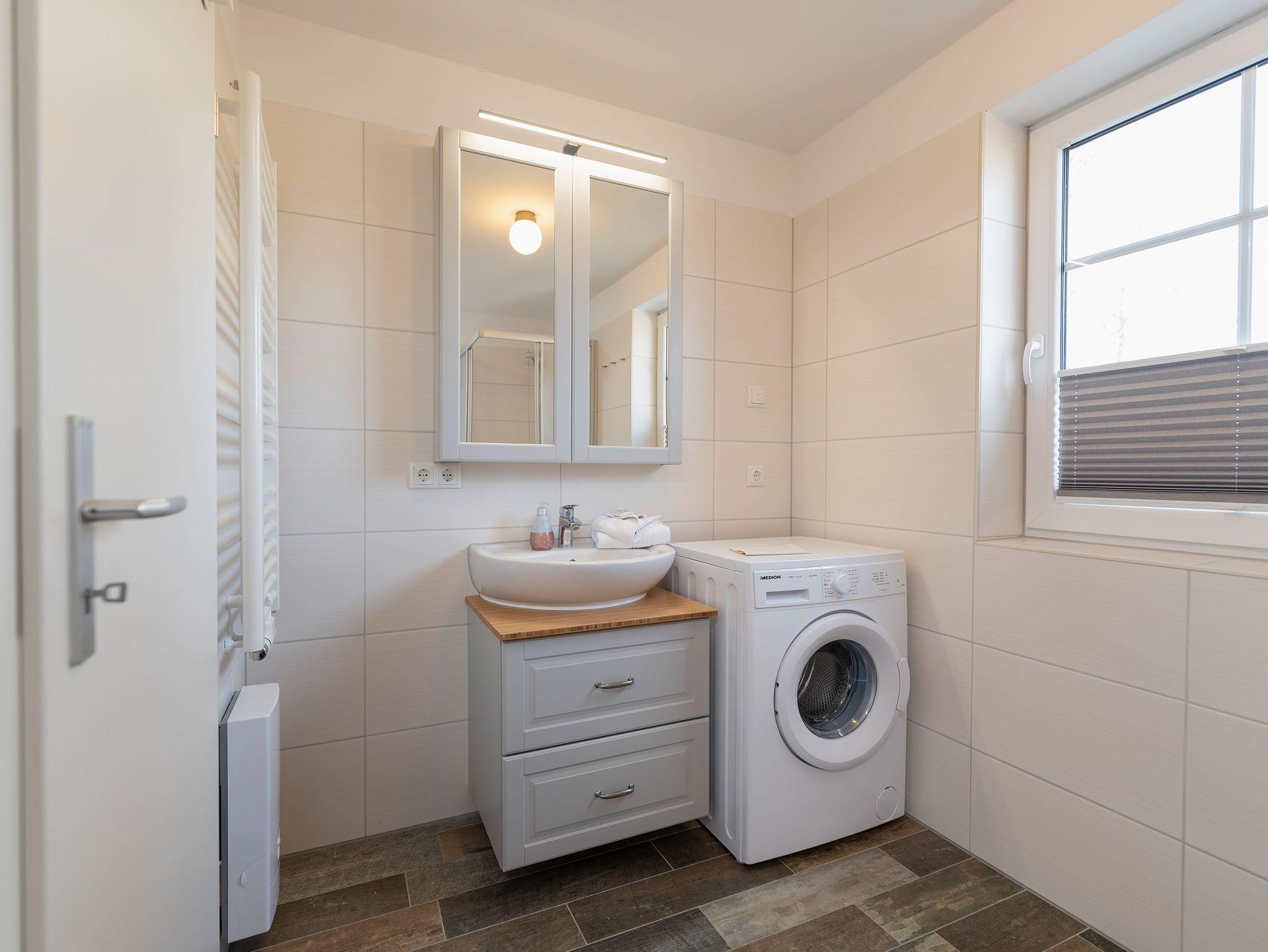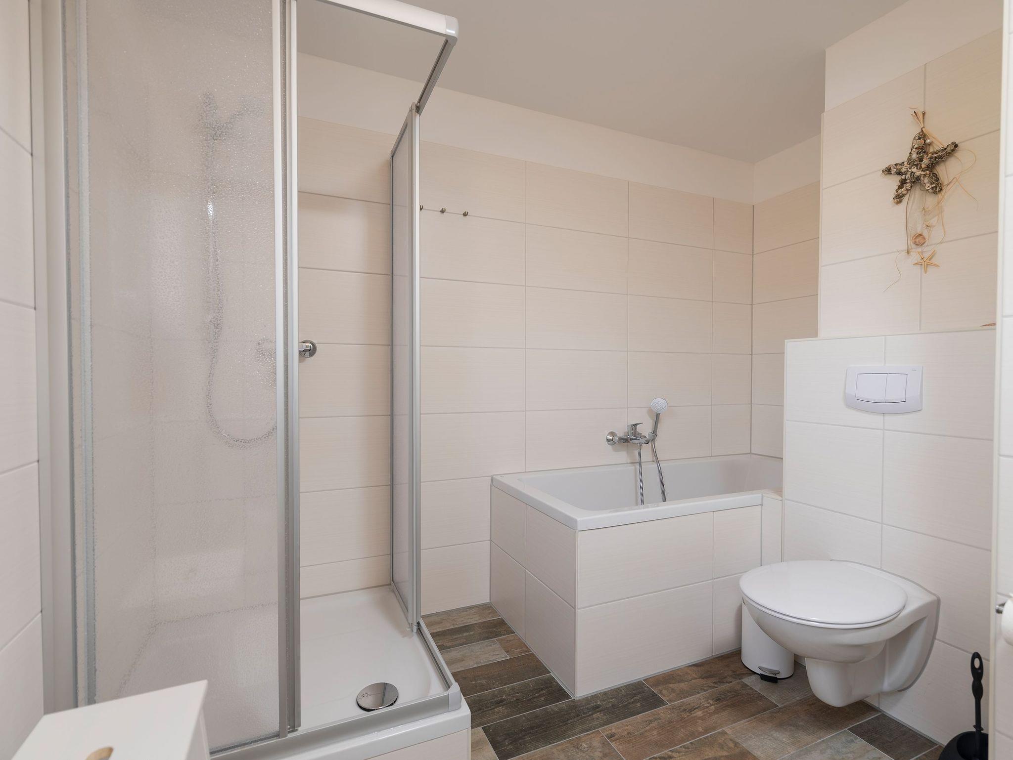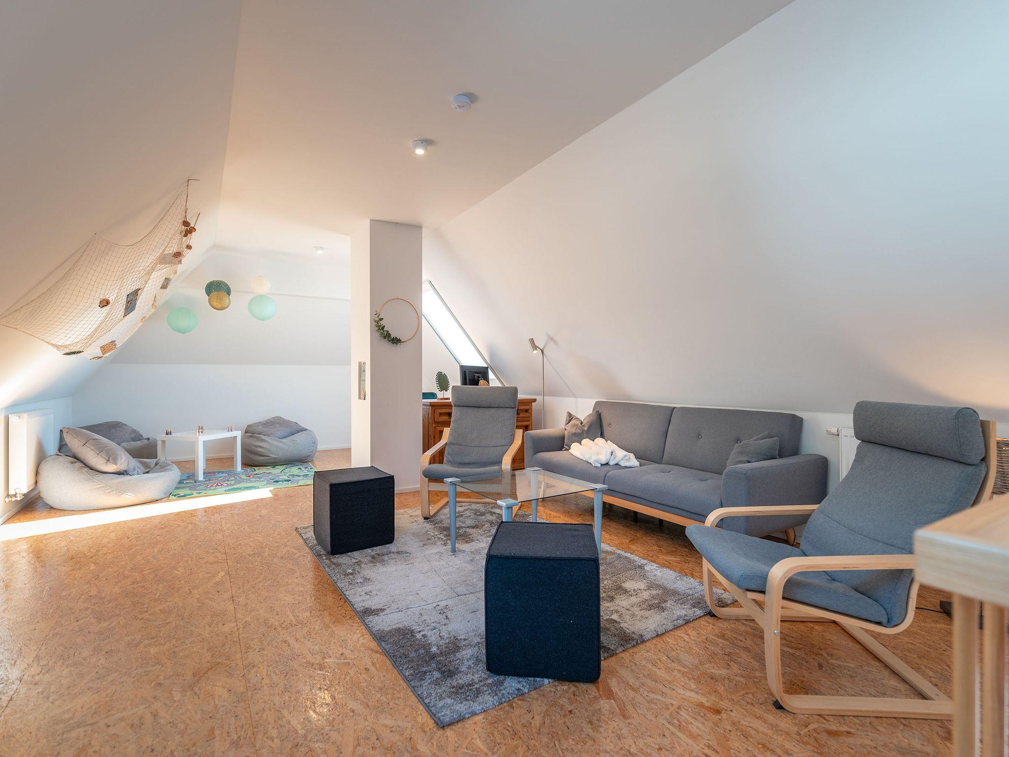 Die Ferienwohnung Schwanensee im Seebad Loddin auf Usedom, nahe dem Achterwasser, bietet eine Oase der Ruhe und Natur. Diese einladende Wohnung im Obergeschoss verteilt sich auf zwei Etagen und ist perfekt für Familien oder kleine Gruppen, die Entspannung suchen. Im unteren Bereich finden Sie ein großzügiges Schlafzimmer mit einem bequemen Doppelbett sowie ein zweites Zimmer, ausgestattet mit einem Etagenbett, das zu einem weiteren Doppelbett (1,60 m) umfunktionierbar ist, ergänzt durch ein Babybett für die jüngsten Gäste. Ein modernes Badezimmer mit Dusche und Badewanne sowie eine Waschmaschine stehen für Ihren Komfort bereit.