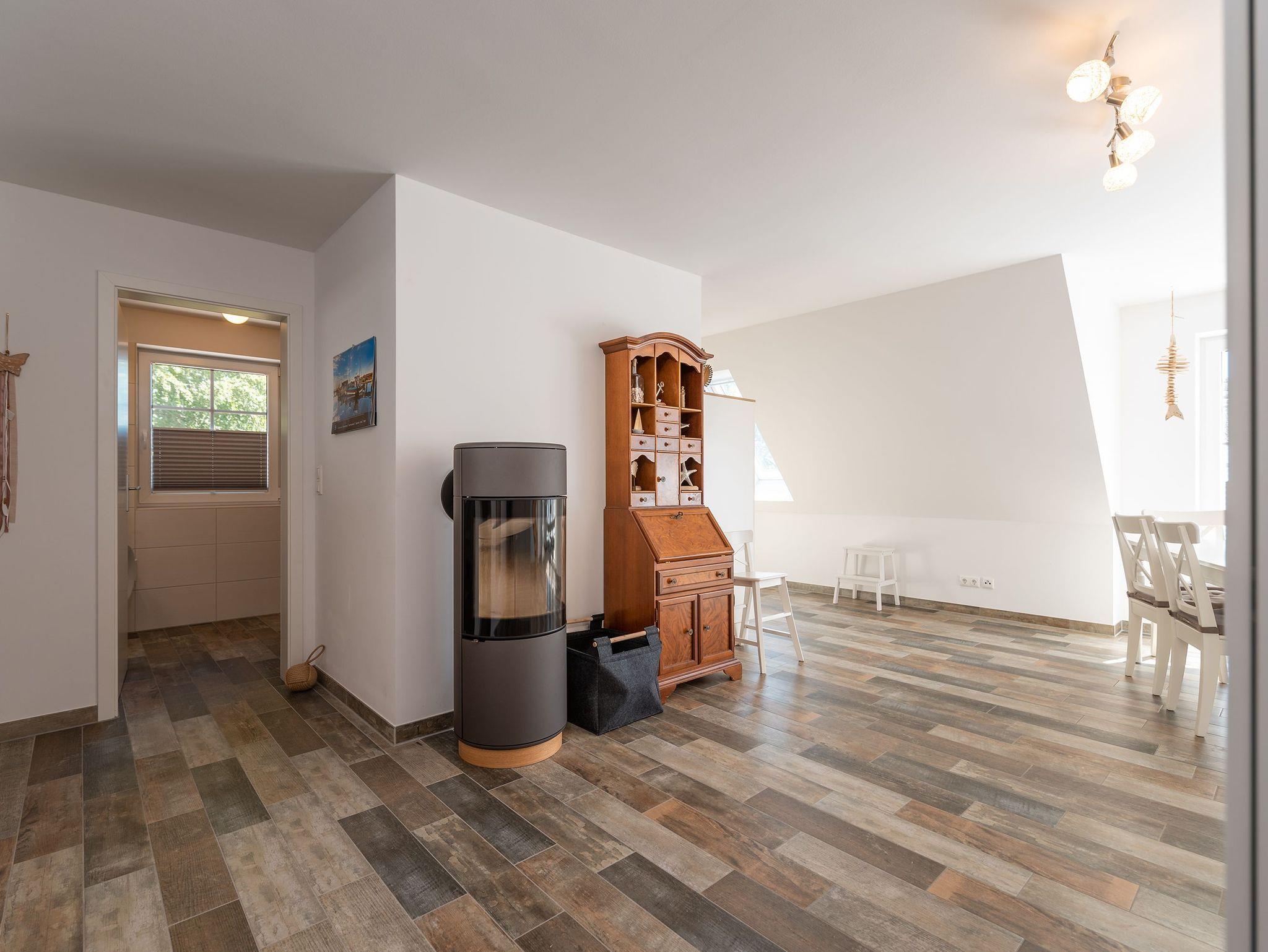 Die voll ausgestattete Küche und der angrenzende Essbereich mit Platz für sechs Personen laden zu gemeinsamen Mahlzeiten ein, während der Kamin gemütliche Stunden verspricht. Der Balkon, zugänglich vom Essbereich, ermöglicht entspannte Momente im Freien. Die obere Etage beherbergt ein geräumiges Wohnzimmer mit Flat-TV, bequemen Sitzmöglichkeiten und einem Schreibtisch, ideal für Erholung oder auch Homeoffice.