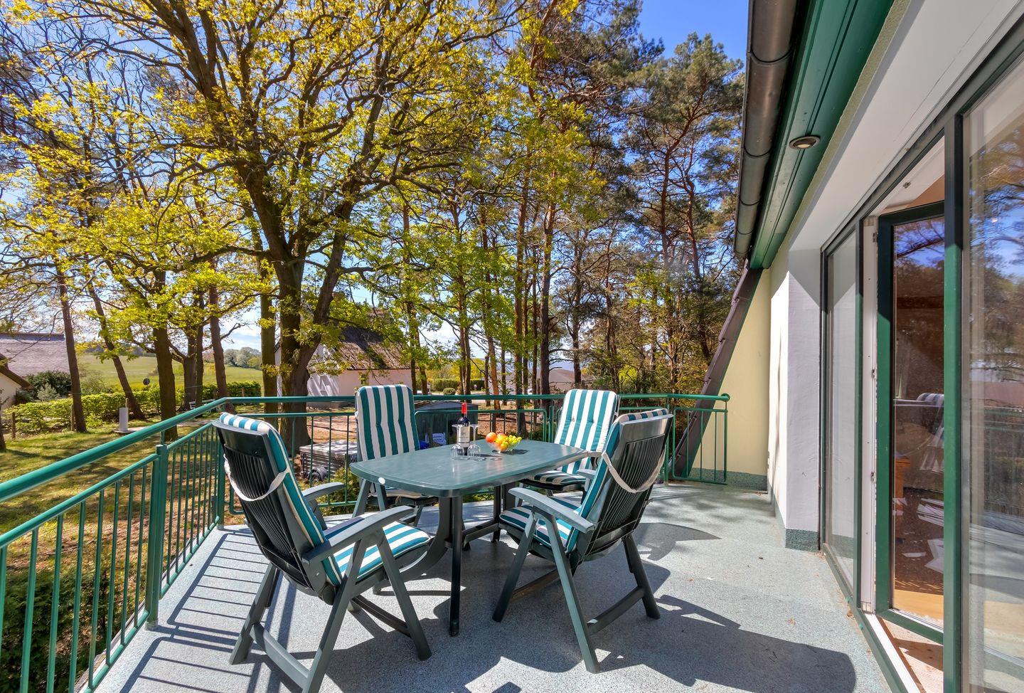 Die Ferienwohnung Krabbengalerie bietet einen großzügigen Südbalkon mit Gartenmöbeln und seitlichem Blick auf das Achterwasser.