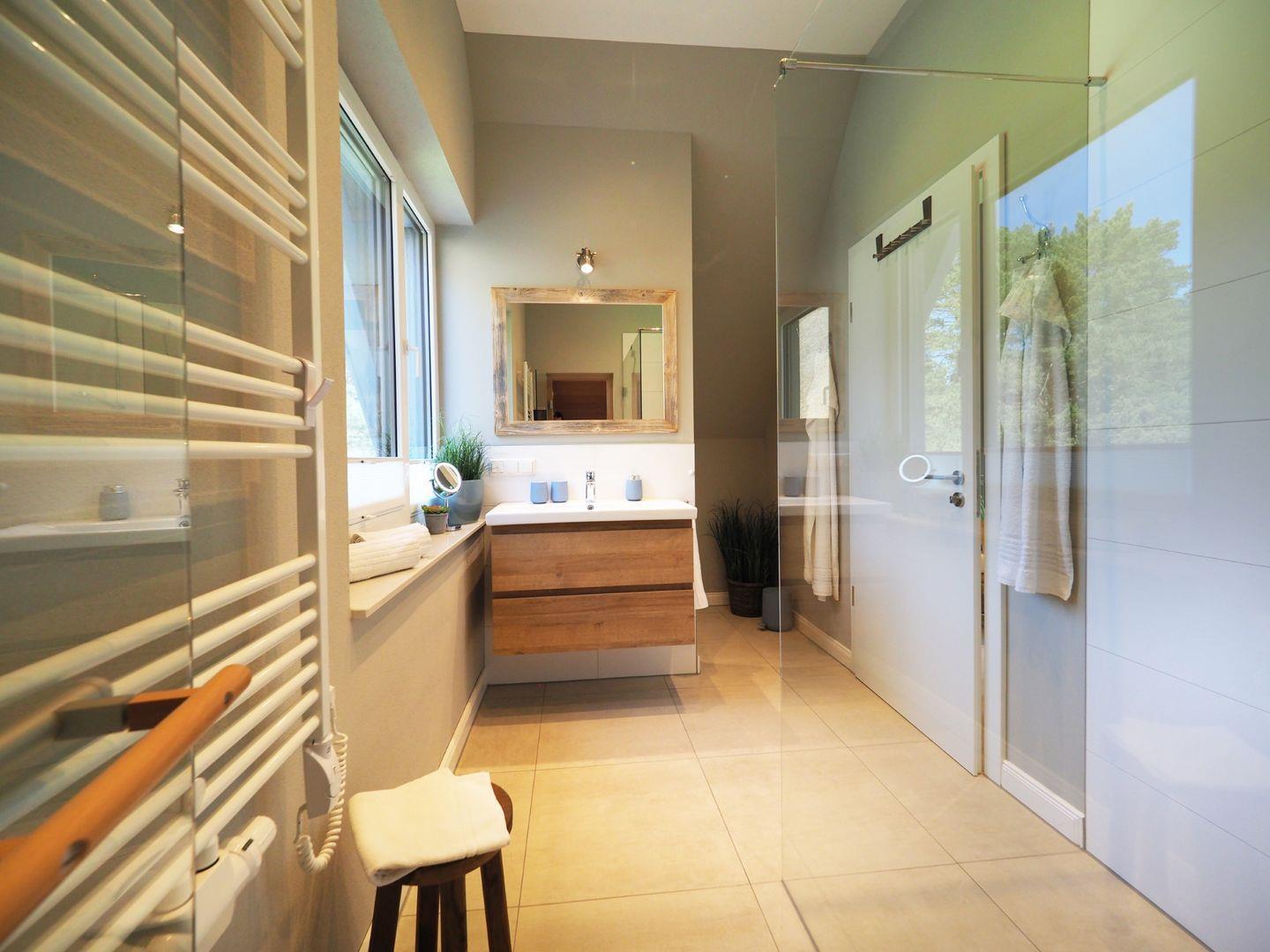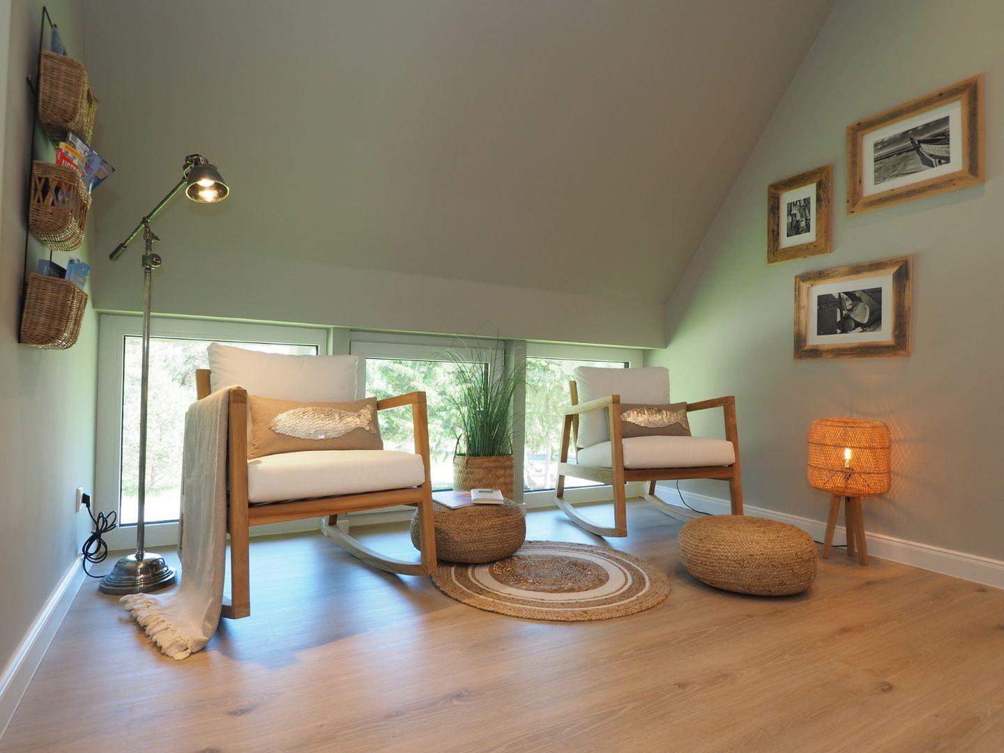 Im Erdgeschoss empfängt Sie ein lichtdurchfluteter Wohn-Essbereich mit offener Küche, welche durch hochwertige Einbaugeräte und alle notwendigen Utensilien zum gemeinsamen Kochen und Backen einlädt. Im Wohnbereich mit gemütlicher Sitzecke und Kamin lassen Sie gemeinsame Abende bei einem Glas Wein ausklingen. Der Essbereich bietet einen traumhaften Blick in den schönen Garten und den angrenzenden Kiefernwald. Des Weiteren befindet sich im Erdgeschoss ein Schlafzimmer mit zwei bequemen Einzelbetten und einem internetfähigen Sat-TV sowie ein großes Bad mit Walk-In-Rainshower vis-à-vis.