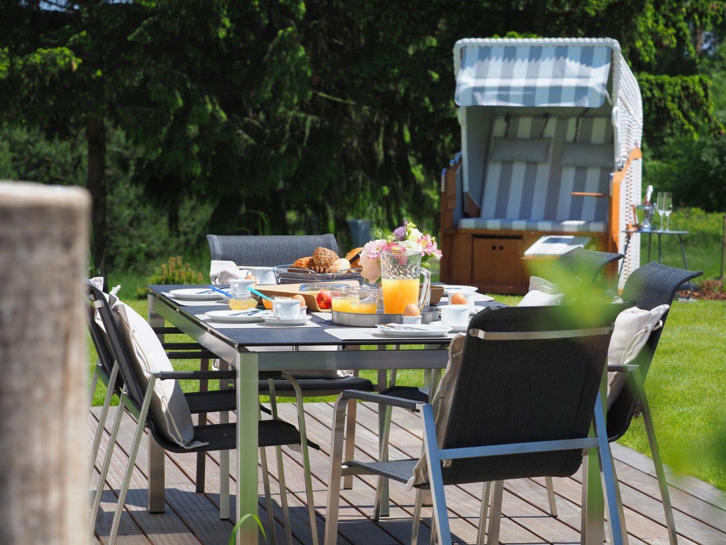 Die große Bangkirai-Terrasse mit Südausrichtung, ausgestattet mit einem großen Gartentisch und 6 Sitzplätzen sowie einem Sonnenschirm, lädt zum Genießen und Verweilen ein. Für gemütliche Grillabende gibt es eine Grillstation aus Naturstein. Zum Entspannen stehen Ihnen auf dem großen Grundstück außerdem ein Strandkorb, Loungesessel sowie Sonnenliegen zur Verfügung. Direkt vor dem Haus gibt es zwei Pkw-Stellplätze. Ihre Fahrräder können sicher und bequem an die dafür vorgesehenen Radständer angebunden bzw. im Hausanschlussraum verstaut werden. Dort finden Sie auch Waschmaschine und Trockner sowie einen Wäscheständer.
