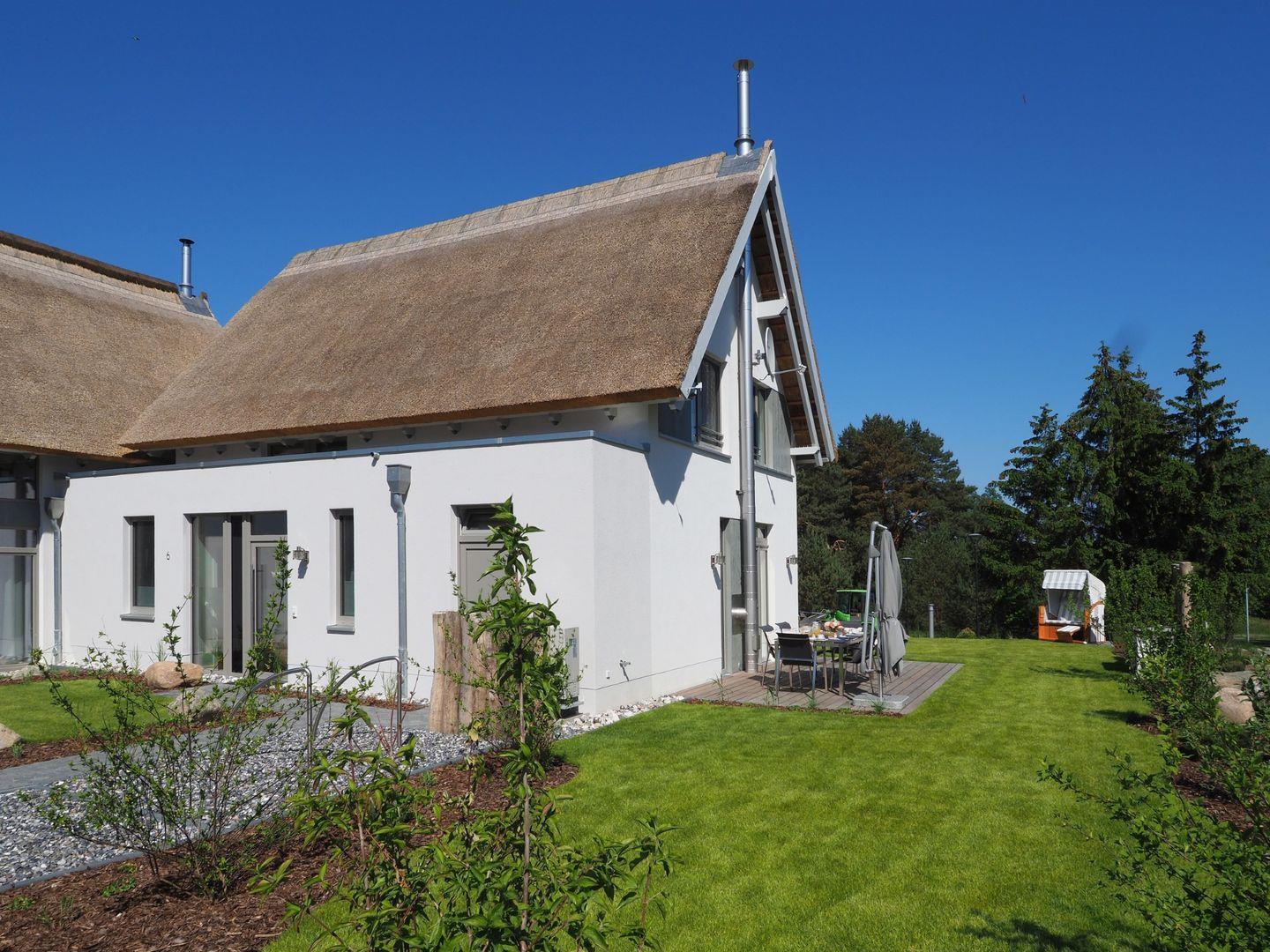 Unser im Jahr 2021 neu erbautes 5-Sterne- Reethaus bietet auf einer Wohnfläche von ca. 135 m² verteilt auf 2 Etagen einen großzügigen Wohn-Essbereich mit offener Küche und Kamin, 3 Schlafzimmer, 2 Bäder mit großen Walk-In-Duschen, ein weiteres Gäste-WC, einen kleinen Relax- sowie einen Saunabereich. Alle Zimmer sind mit Fußbodenheizung sowie Insektenschutz ausgestattet. Durch die großzügigen Fensterflächen lässt sich die Natur auch im Haus erleben!