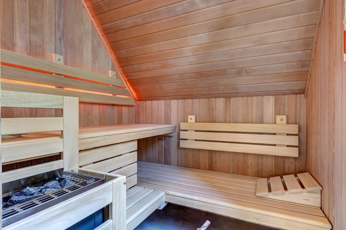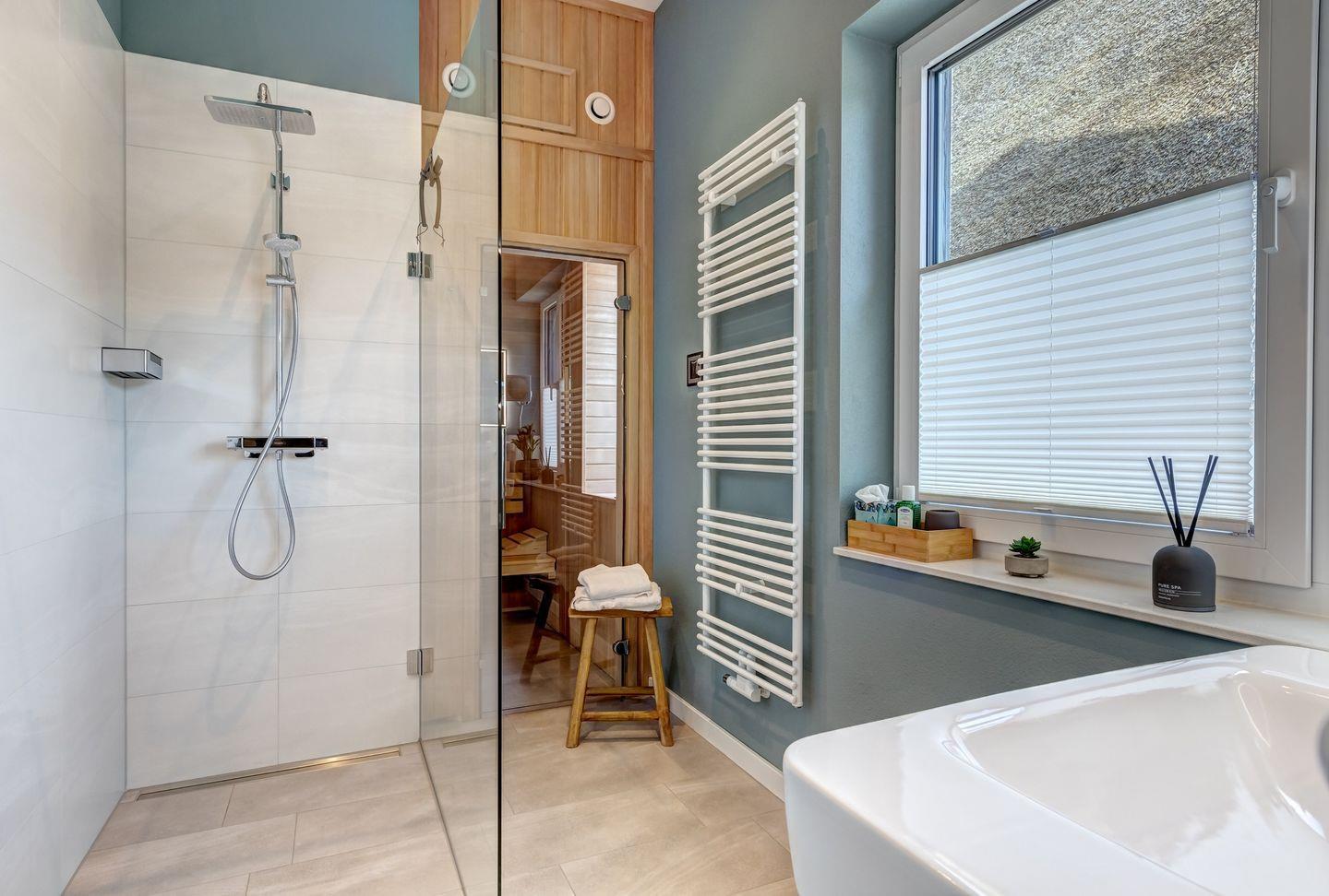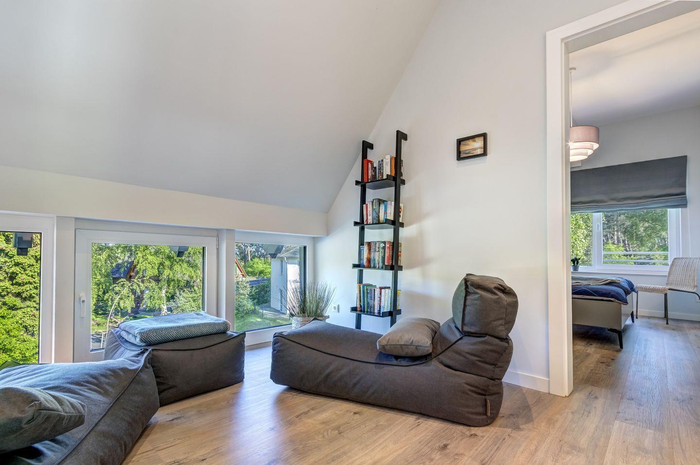 Im Obergeschoss sind ein Gäste-WC, zwei Schlafzimmer mit Möller Design Betten und Flat- TV sowie ein großes Wellness-Bad mit abgetrennten WC, Sauna und Walk-In-Dusche zu finden. Der angrenzende Relax-Bereich mit Leseecke und toller Aussicht lädt zum Verweilen und Entspannen ein.