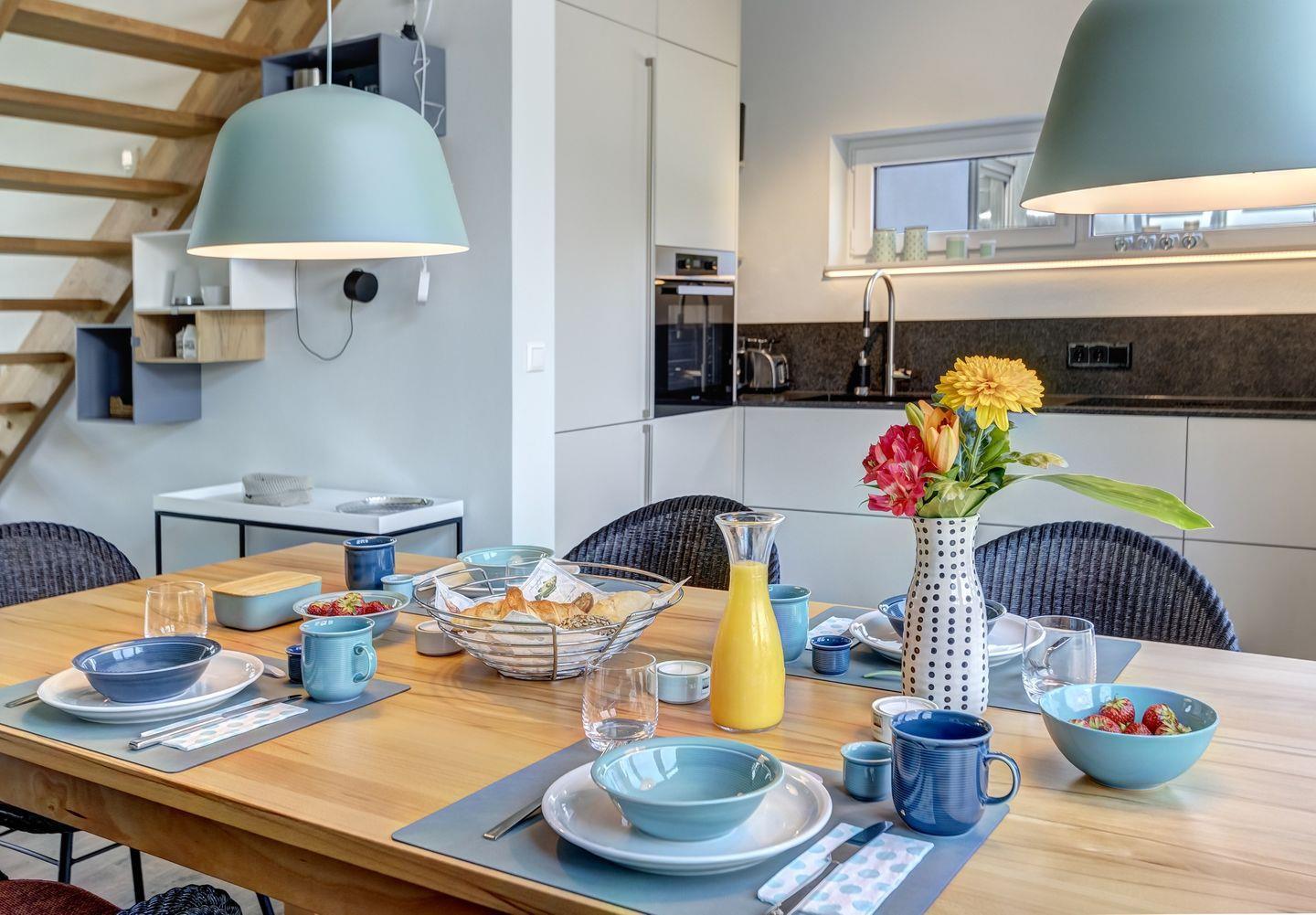 Farblich haben wir im Innern viele Grün- und Türkis-Töne gewählt, die sofort ein Urlaubsgefühl am Meer vermitteln. Das EG ist aufgrund von bodentiefem Fenster mit Tageslicht durchflutet.