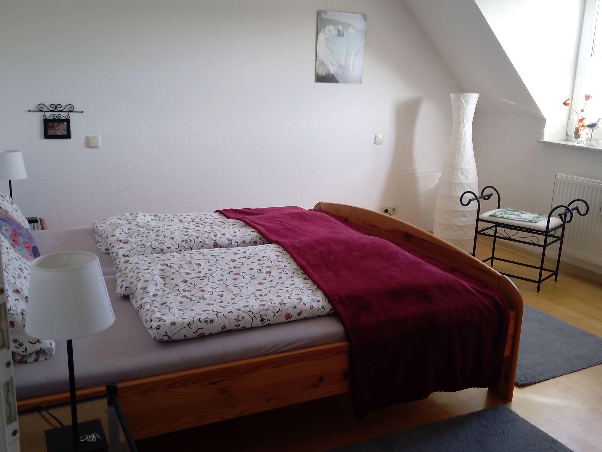 Die modern eingerichtete Wohnung, mit Blick über Felder und Gärten, befindet sich im Dachgeschoss des am Rande des Nationalparks Jasmund stehenden Ferienhauses im kleinen Dorf Hagen mit Wohnzimmer und integrierter, gut ausgestatteter Küchenzeile sowie Essbereich, separatem Schlafzimmer mit Doppelbett (1,8 x 2, 0 Einzelmatratzen), Diele und Duschbad. Für die Kinder verschiedenen Alters stehen Spiele und Bilderbücher bereit.