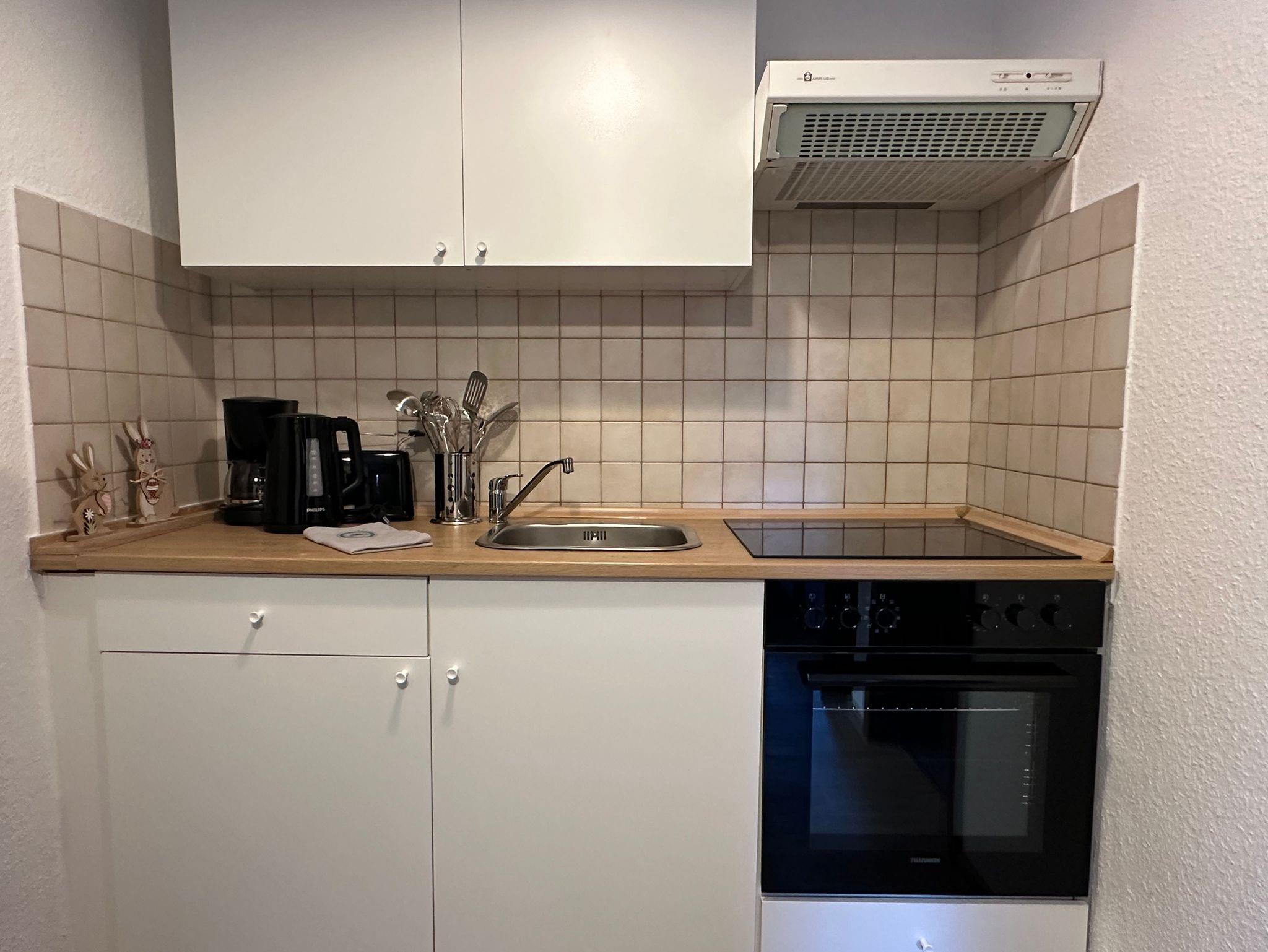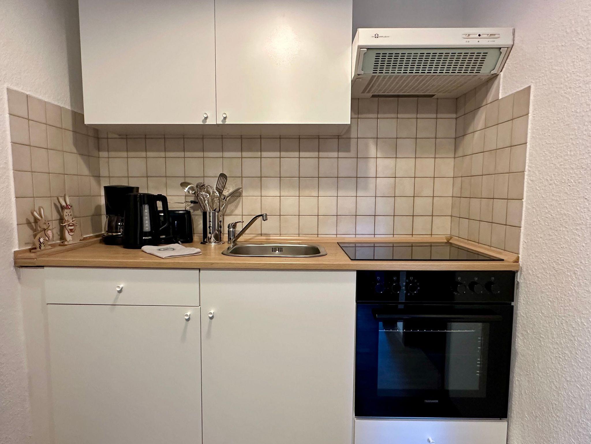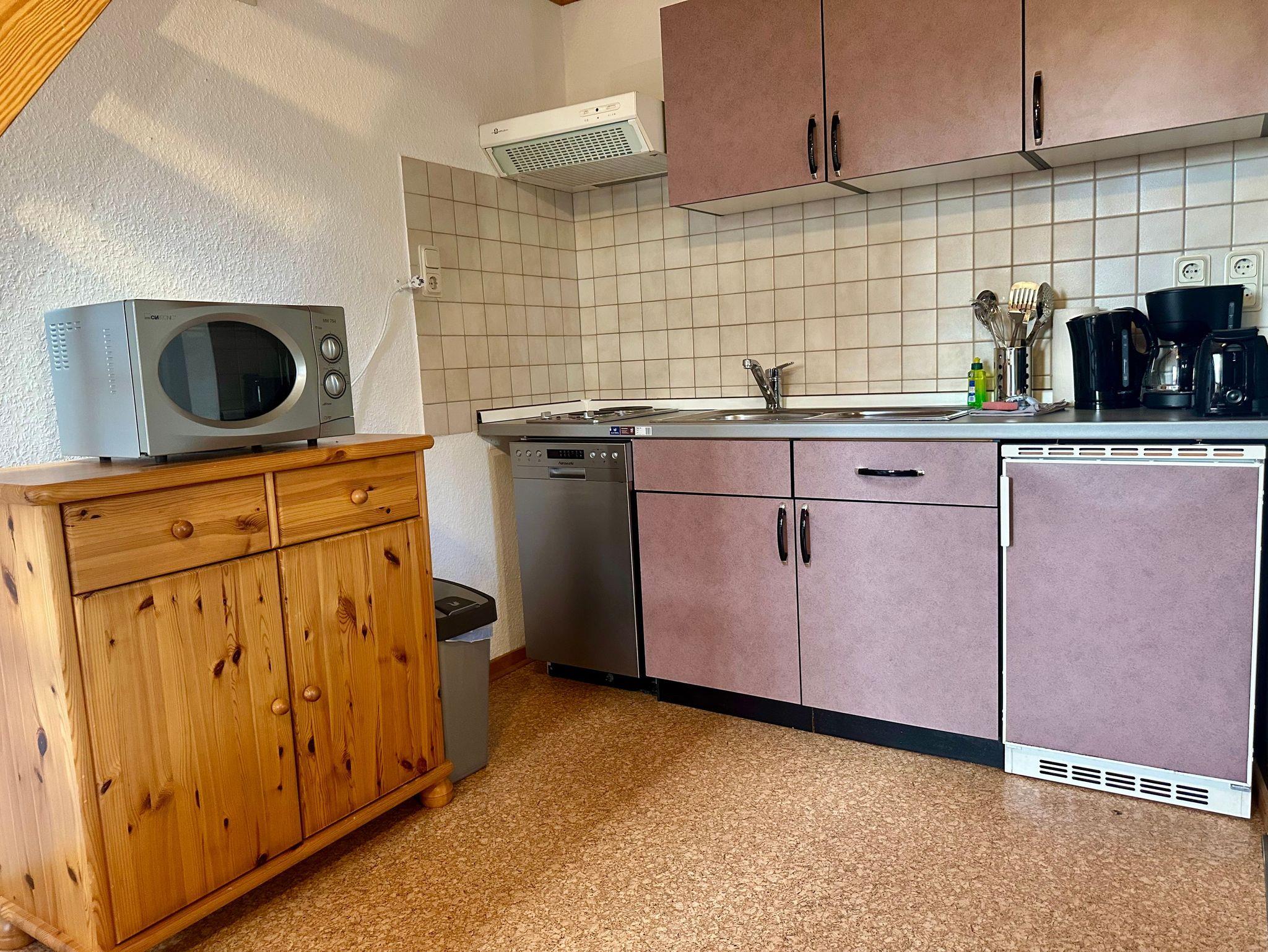 * Küche mit Herd (Ceranfeld) und Backofen, Geschirrspüler, Mikrowelle, Toaster, Kaffeemaschine,
