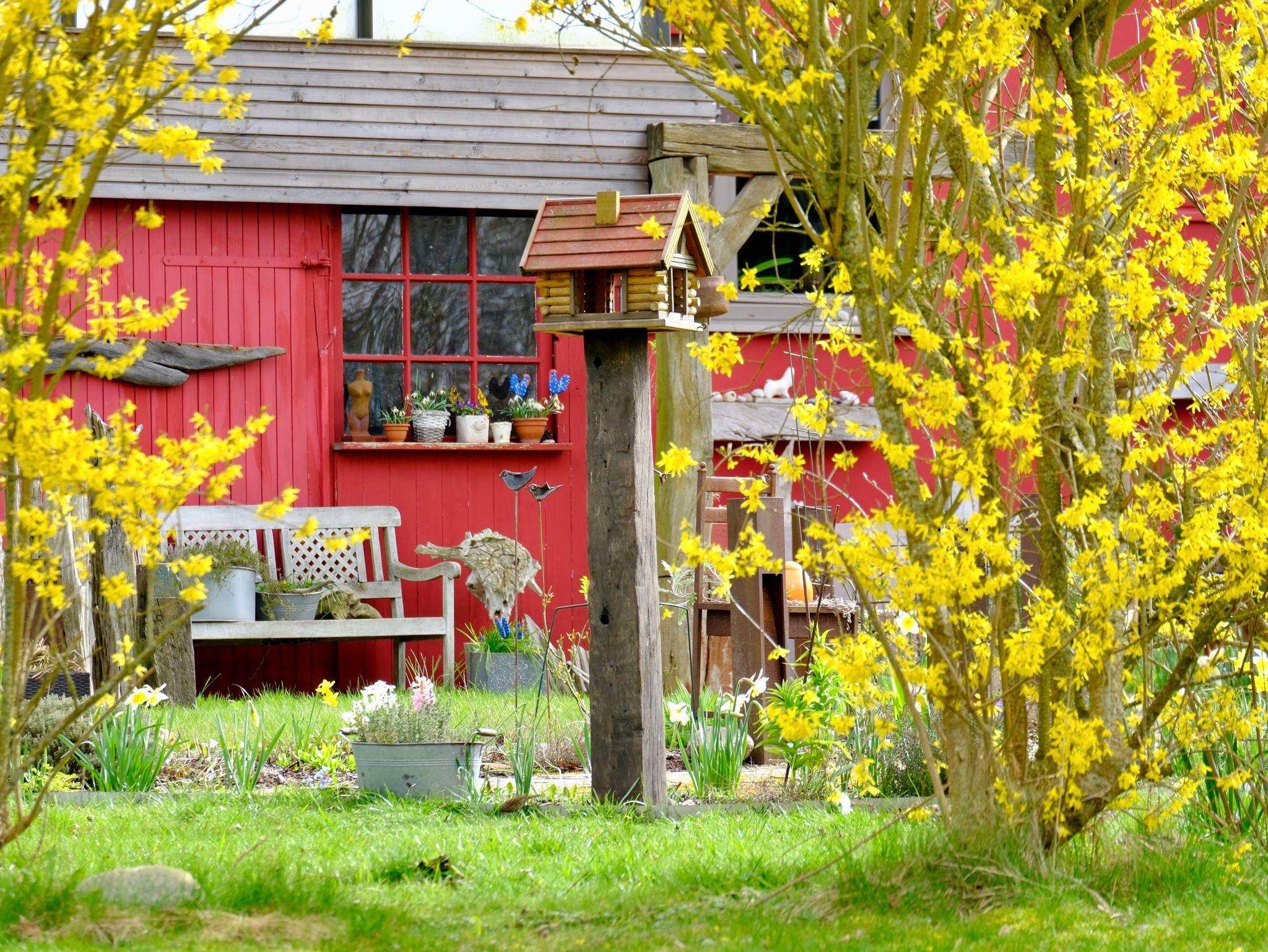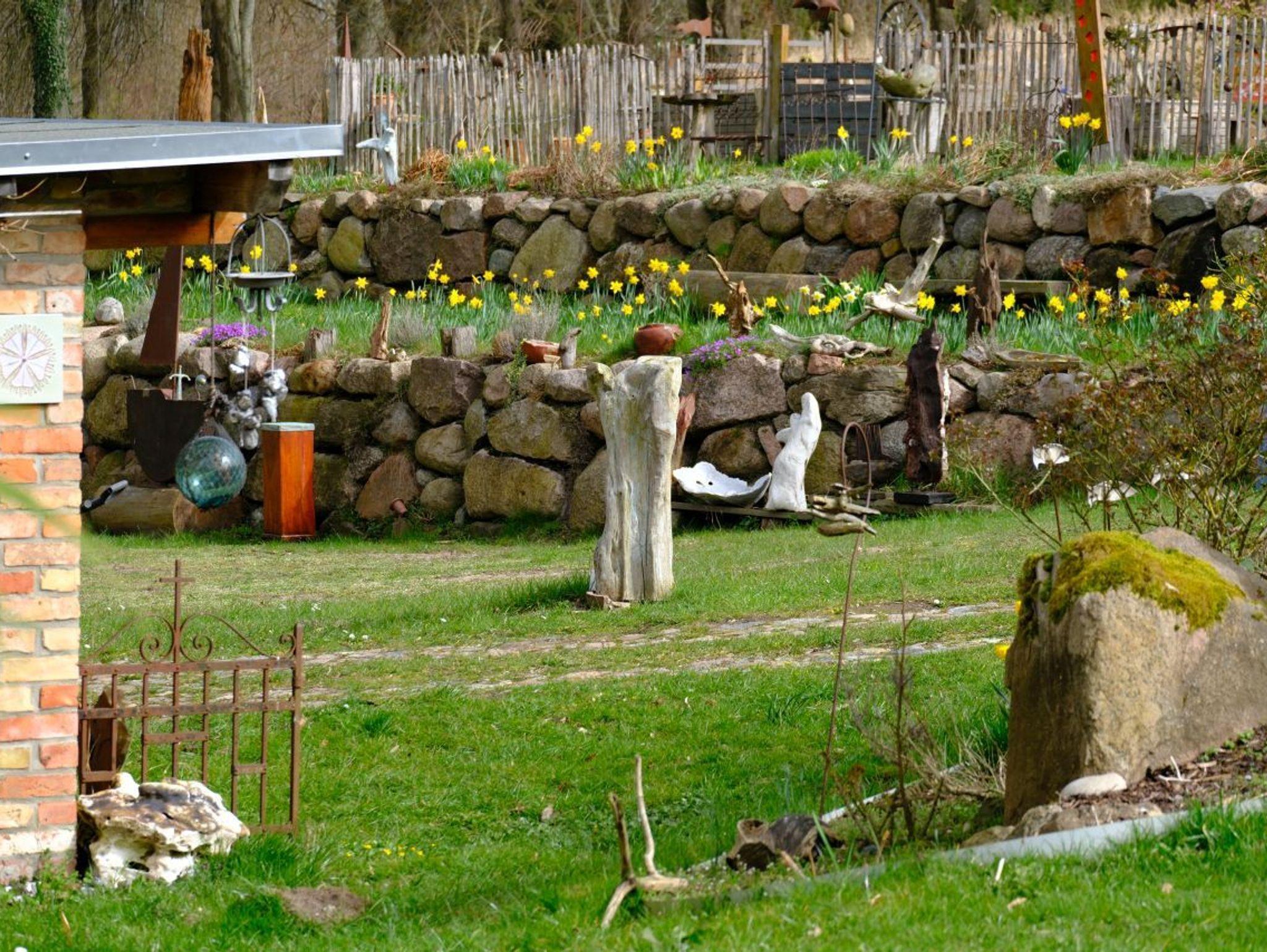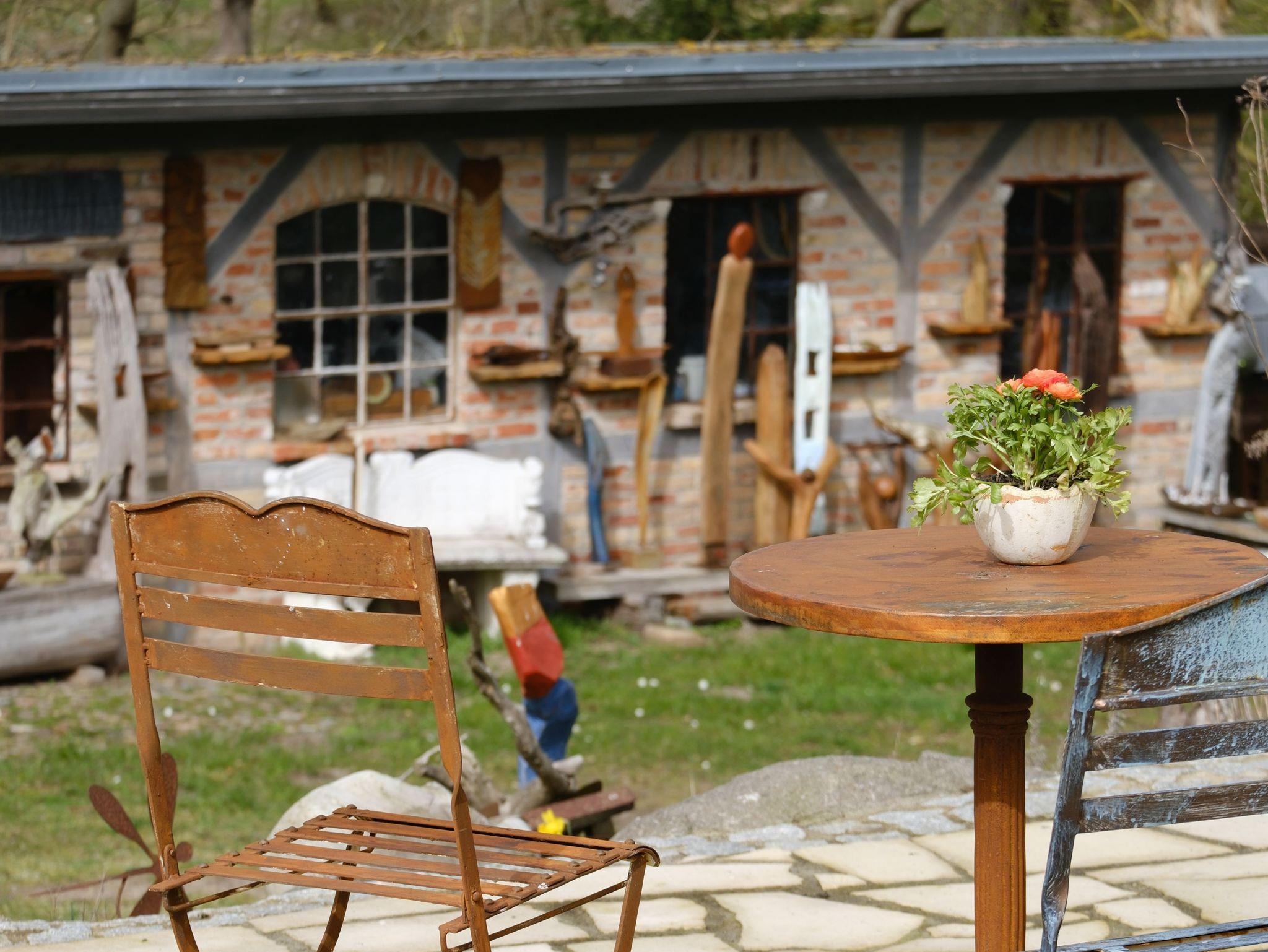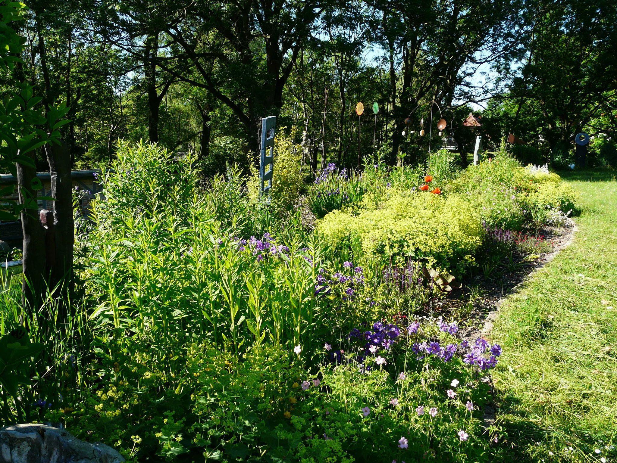 Zu jeder Wohnung gehört eine Außenterrasse mit Gartenmöbeln, Sonnenschirm und Grillmöglichkeit. Darüber hinaus finden Sie bei uns einen großen Natur- und Nutzgarten, in dem Sie neben vielfältig angelegten Beeten auch noch Wegrandblumen und Heilpflanzen sowie verschiedene Ruhezonen mit Sitzgruppen und Liegen zum Entspannen finden. Manchmal ganz offensichtlich, bisweilen recht versteckt können Sie im Garten Kunstobjekte des Hausherren entdecken und bei Gefallen käuflich erwerben.