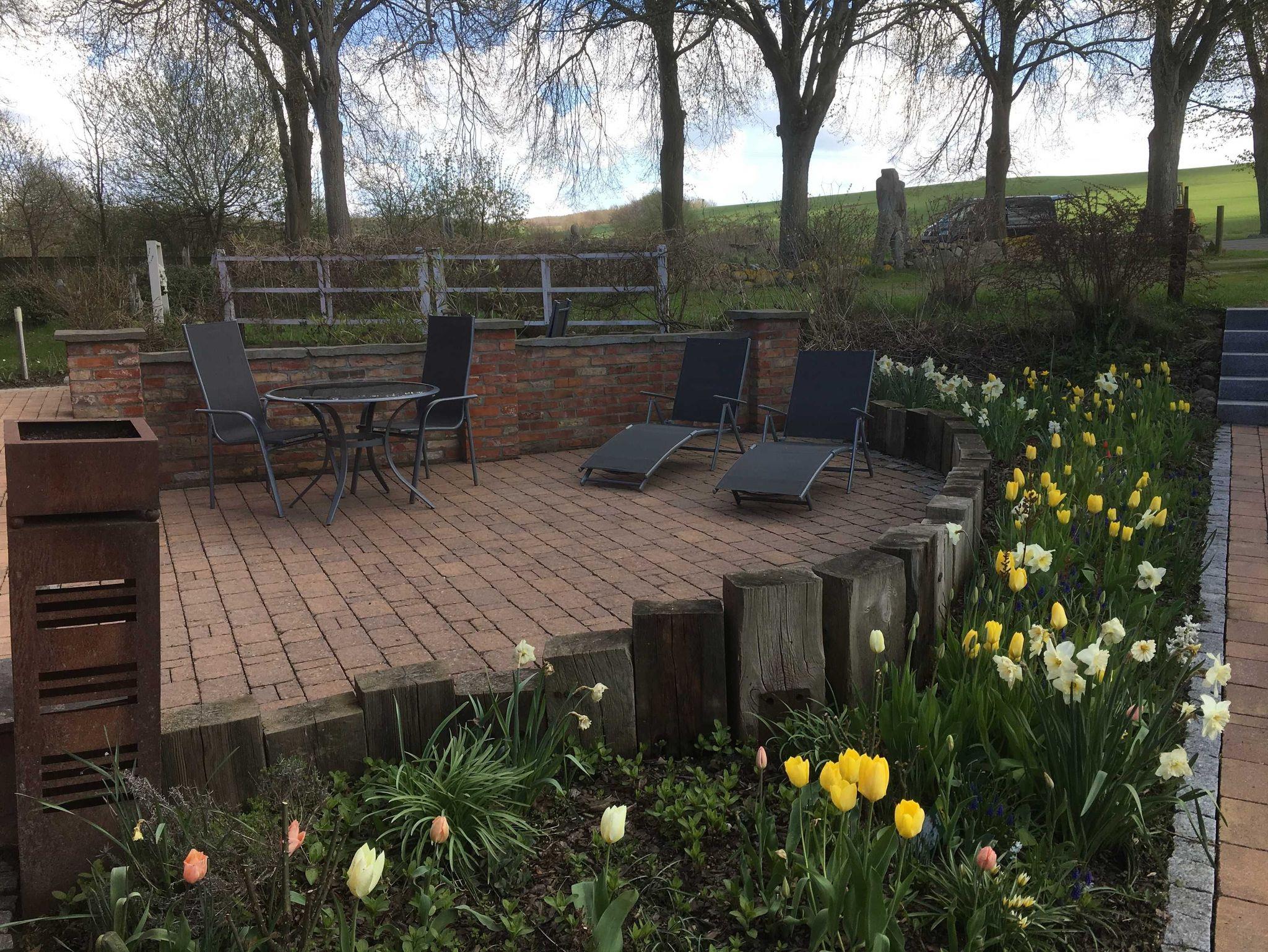 Zu jeder Wohnung gehört eine Außenterrasse mit Gartenmöbeln, Sonnenschirm und Grillmöglichkeit. Darüber hinaus finden Sie bei uns einen großen Natur- und Nutzgarten, in dem Sie neben vielfältig angelegten Beeten auch noch Wegrandblumen und Heilpflanzen sowie verschiedene Ruhezonen mit Sitzgruppen und Liegen zum Entspannen finden. Manchmal ganz offensichtlich, bisweilen recht versteckt können Sie im Garten Kunstobjekte des Hausherren entdecken und bei Gefallen käuflich erwerben.