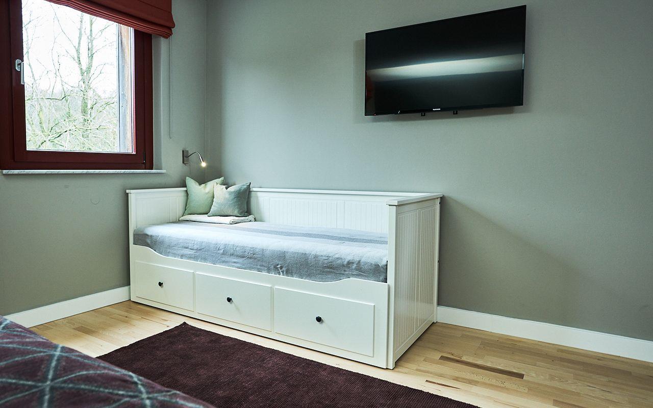 Das im Februar 2020 komplett renovierte 2-Raum-Appartement bezaubert mit einer Größe von 72 qm. Es befindet sich im Obergeschoß des Appartementhauses Fore auf dem Anwesen von Schloss Ranzow. Über den Flur gelangen Sie in den Wohnbereich mit Küchenzeile. Das Schlafzimmer bietet ein Doppelbett sowie ein Bettsofa als Aufbettung für eine weitere Person. Die Wohnung verfügt weiterhin über ein Bad mit Dusche und WC. Für Ihr Gepäck bietet zusätzlich ein kleiner Abstellraum im Flur Platz.
