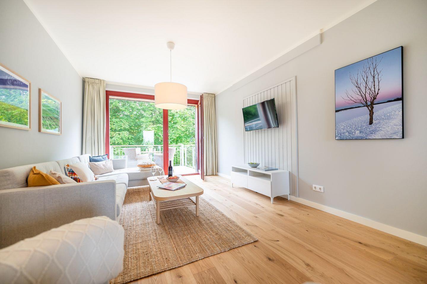 Das Apartment mit blick auf den Nationalpark und die Ostsee verfügt über ca. 72 qm Wohnfläche. Der helle Wohn- und Essbereich lädt zum Verweilen ein. Die vollständig ausgestattete Küchenzeile ermöglicht Ihnen, Ihre Mahlzeiten zuzubereiten. In diesem Appartement für bis zu 4 Personen stehen Ihnen zwei Schlafzimmer, eines mit einem Doppelbett und das andere mit zwei Einzelbetten, zur Verfügung. Das Duschbad bietet eine atemberaubende Aussicht auf den Golfplatz und das funkelnde Blau der Ostsee.