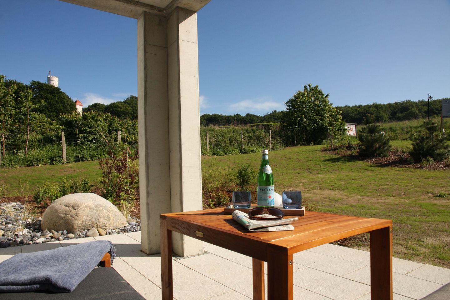 Verteilt auf 2,5 Räume mit einer komfortablen Wohnfläche von ca. 58 qm bietet sie bequem bis zu 4 Personen Platz. Für ganztägigen Sonnengenuss sorgt die überdachte Sonnenterrasse mit Gartenzugang und Blick auf den Golfplatz sowie geradezu auf das historische Schloss Ranzow. Den Findling, den Sie im Garten vorfinden, ist eine Anlehnung an den Lohmer Schwanenstein. Ein wenig Historie muss sein.