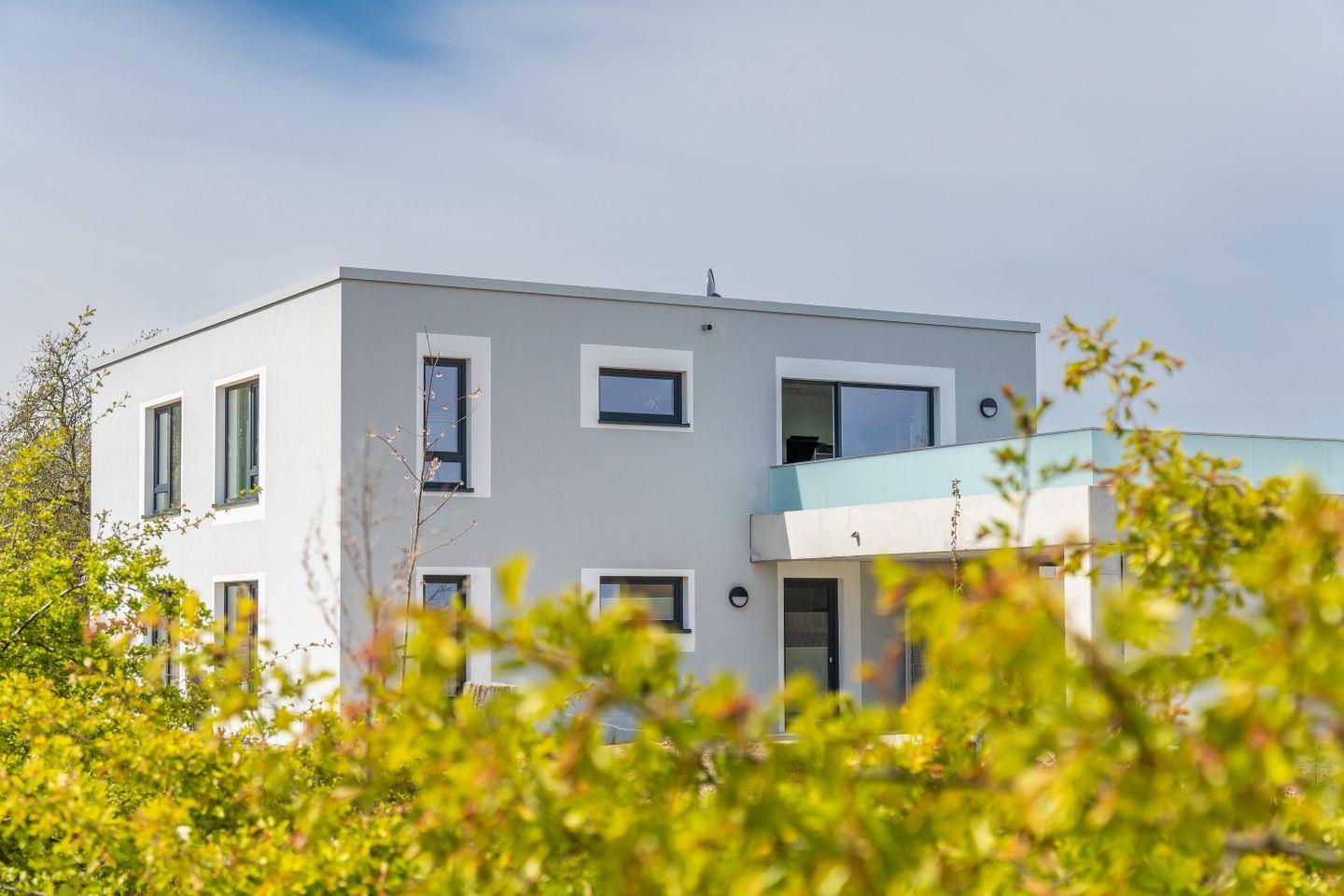 Das perfekt angelegte Grundstück, die strahlend weißgraue Fassade und die bodentiefen Fenster lassen bereits erahnen, dass es im Inneren des Hauses sehr elegant und hochwertig zugeht.