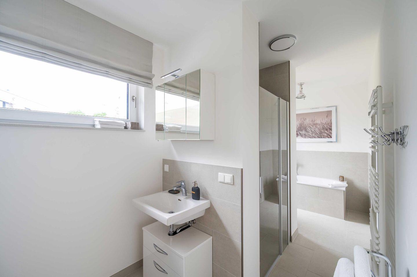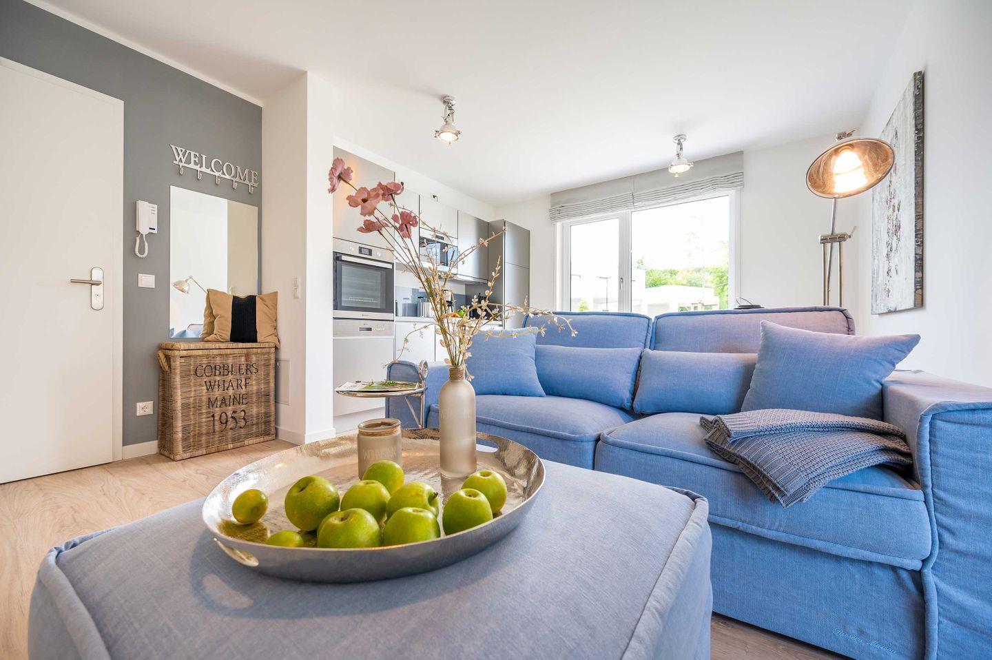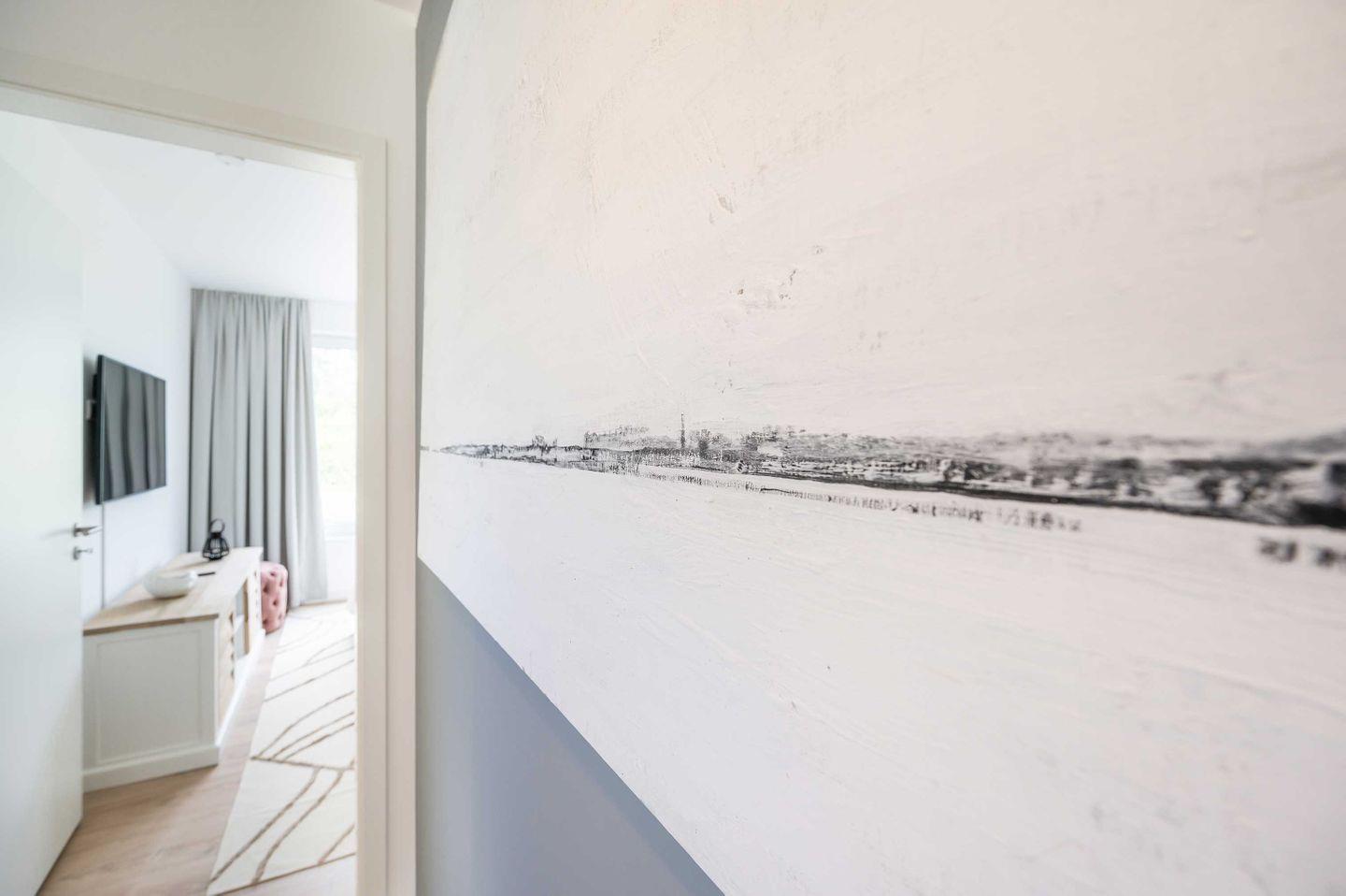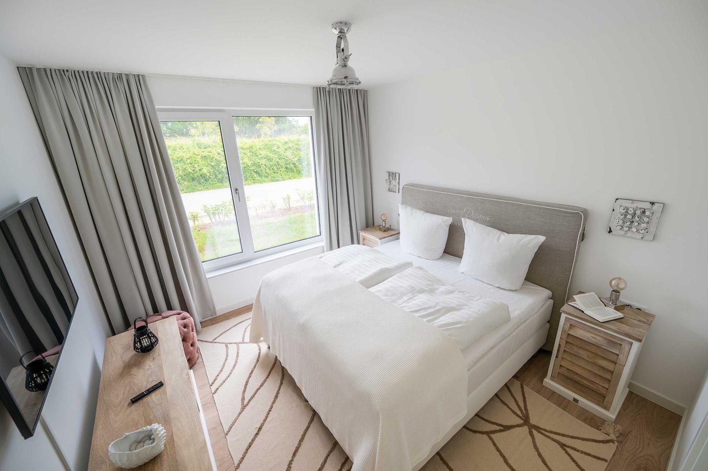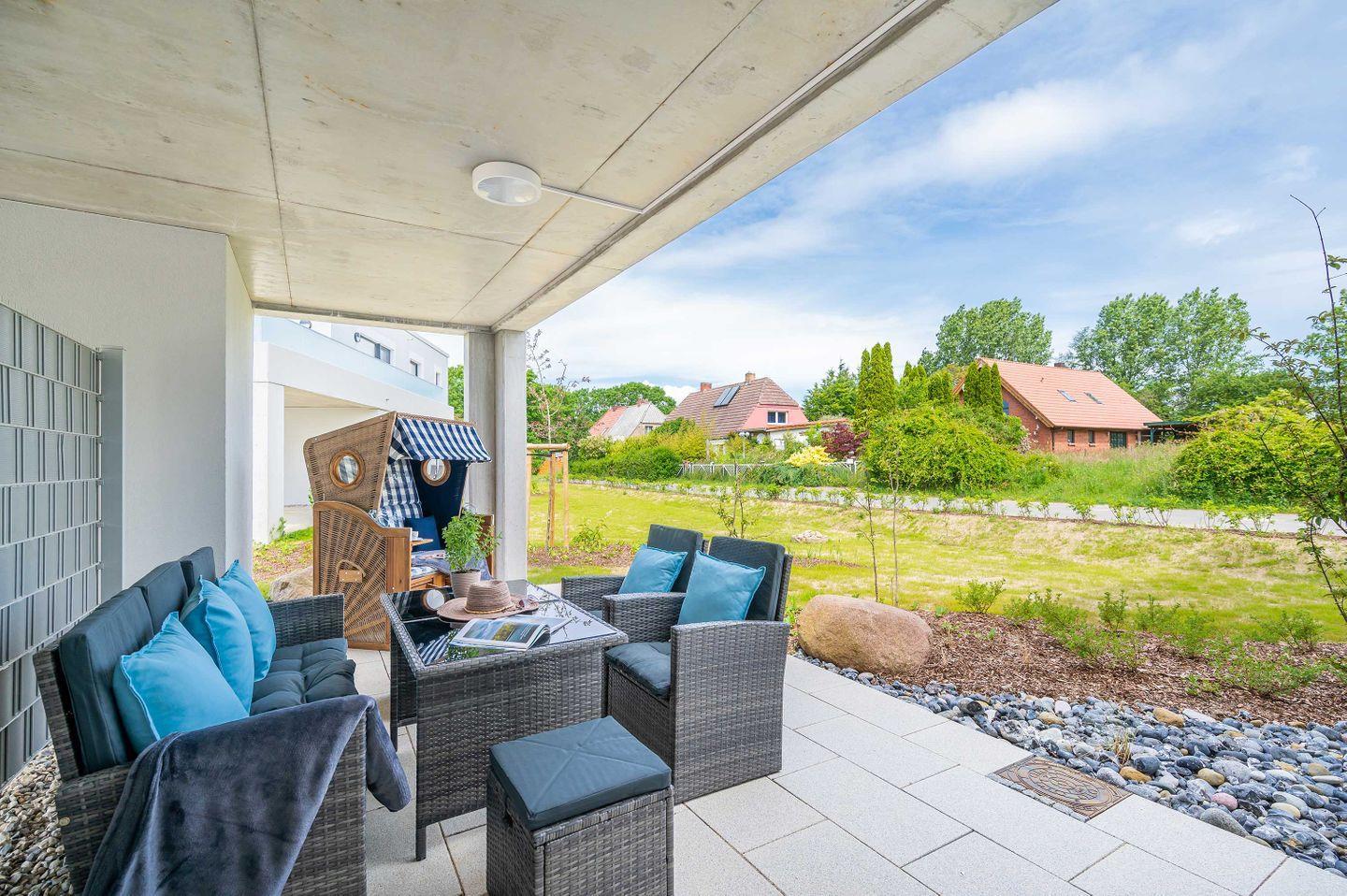 Sie betreten Ihre HERZZEIT barrierefrei im Erdgeschoss einer eleganten, lichtdurchfluteten Bauhausvilla. Mit großzügigen 62 qm ist es geeignet für 2 Personen plus Kleinkind und auch ihr vierbeiniger Freund ist sehr willkommen. Erfreuen Sie sich an der hochwertigen Ausstattung des Interieurs mit der Marke Riviera Maison. Die Wände schmücken ausgewählte Original-Kunstwerke befreundeter Künstler. Der gemütliche Wohnbereich mit integrierter Küchenzeile, Geschirrspüler, Nespresso-Kaffeemaschine und einem Waschtrockner lässt keine Wünsche offen. Im kuscheligen Schlafzimmer mit eigenem Ankleideraum verwöhnt Sie ein herrlich bequemes Boxspringbett. Besonders lieben werden Sie das großzügiges Wellnessbad mit Badewanne und barrierefreier Regendusche. Zwei Großbildfernseher im Wohn- und Schlafbereich, kostenloses Highspeed Internet und eine kleine Musikanlage machen die Ausstattung komplett. In den sonnigen Garten gelangen Sie, ebenfalls barrierefrei, über die großzügige, regen- und windgeschützte Terrasse mit Strandkorb, Lounge-Möbeln und Elektrogrill.