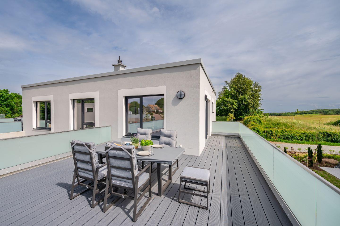 Die traumhaft große Sonnenterrasse von über 40 qm bietet einen phantastischen Blick auf das historische Schloss Ranzow und die umgebende Natur. Für den vollkommenen Sommergenuss sorgen die Terrassenbestuhlung mit verstellbaren Lehnen und eine bequeme Sonnenliege. Ein Sonnenschirm spendet bei Bedarf Schatten.