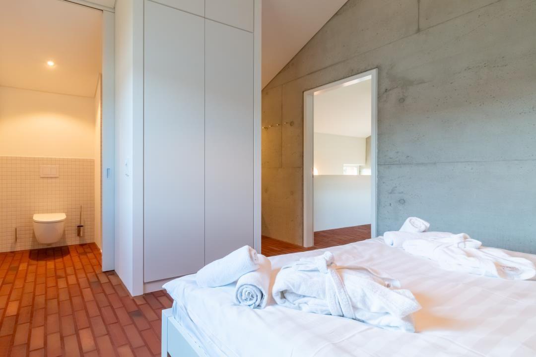 Im Obergeschoss findest du zwei komfortable Schlafzimmer – beide mit hochwertigen Doppelbetten, geräumigen Einbauschränken und jeweils eigenem Ensuite-Bad. Genieße deinen Rückzugsort mit stilvollem Design und viel Privatsphäre.