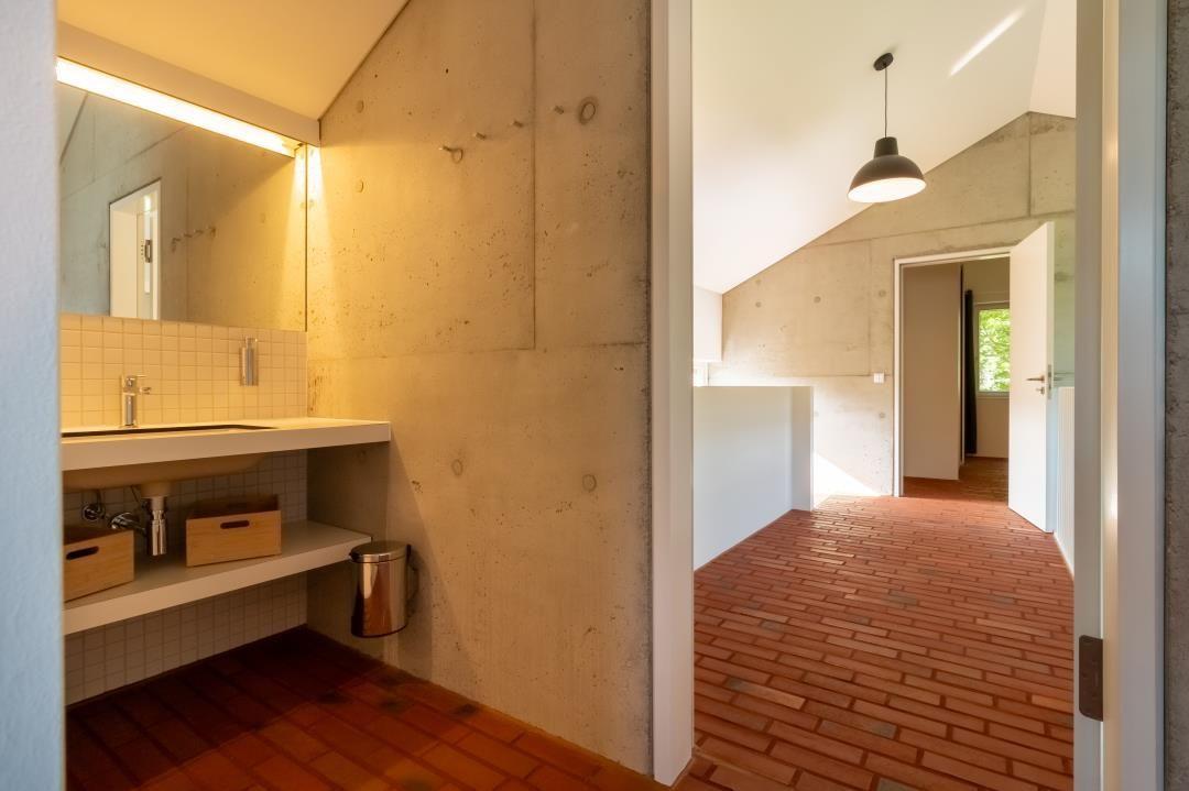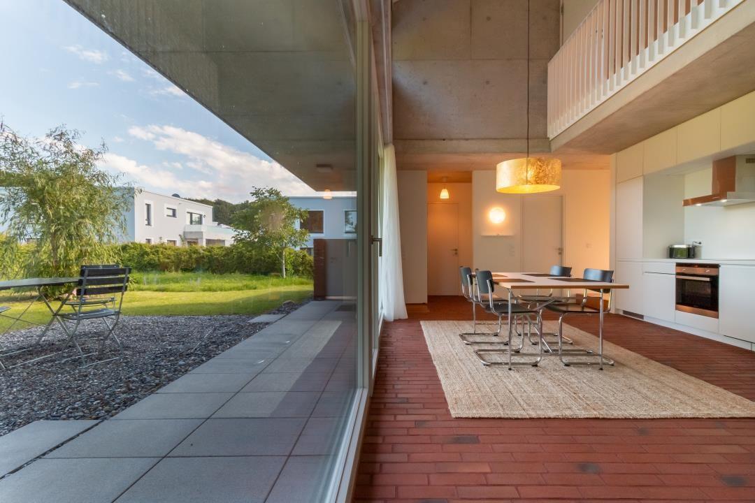 Das lichtdurchflutete Erdgeschoss verbindet Wohn- und Kochbereich auf moderne Weise. Eine imposante Fensterfront, hohe Decken und die offene Galerie schaffen ein großzügiges Raumgefühl. Der gemütliche Wohnbereich lädt zum Entspannen ein, während die stilvolle Küche mit allem ausgestattet ist, was du zum Kochen brauchst. Auf der Terrasse genießt du Ausblicke auf den Golfplatz und den Buchenwald.