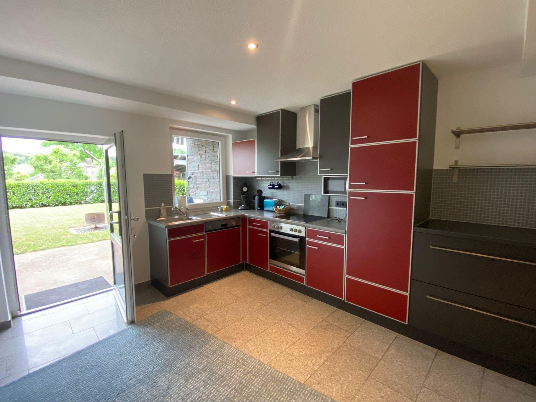 Die Wohnung liegt im Einliegerbereich und verfügt über 90 qm mit Doppelschlafzimmer, großem Wohn-Esszimmer mit Schlafcouch. Die Küche ist voll ausgestattet und verfügt über Herd, Backofen, Spülmaschine und diverse Elektrogeräte, und ausreichend Geschirr.Ebenfalls gibt es ein Bad mit Dusche und WC. Von der Küche aus kann man überdacht sitzen und gemütlich Garten und Draußen geniessen mit Grillecke. Carport für 2 Autos vorhanden. Ebenso kostenloses Wlan + Radio und TV.